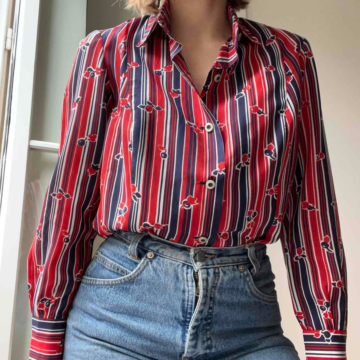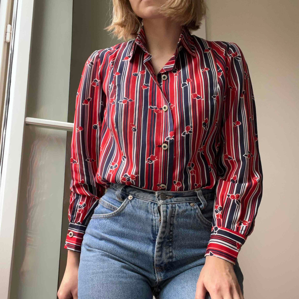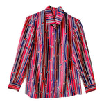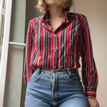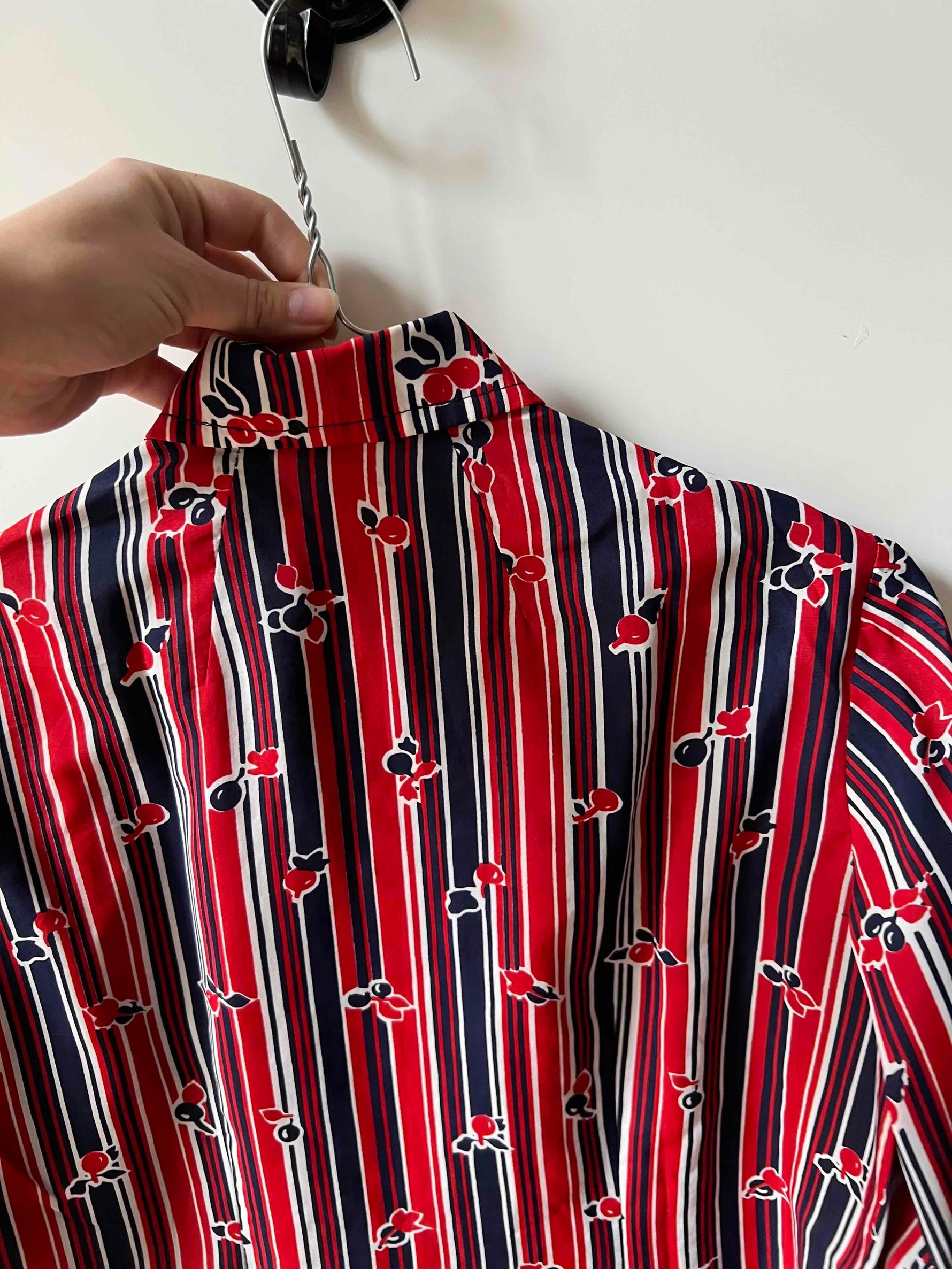 Prix unitaire parChemise en acrylique à motif rayures rouge et Marine avec des fruits. Très souple et agréable en parfait état (sans étiquette de taille de marque ou de composition). Taille 36/38, comme porté sur les photos.