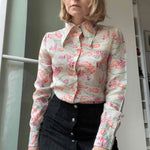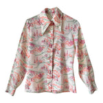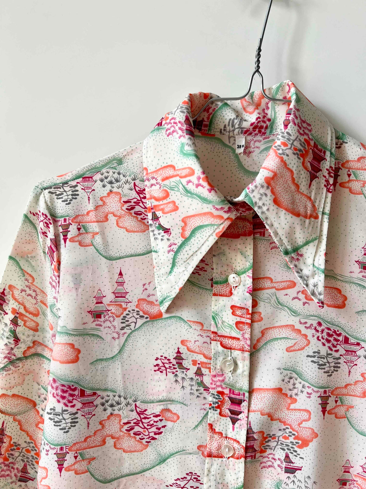 Prix unitaire parChemise blanche maxi col pelle à tarte, blanche à motif fleuri asiatique dans des tons corail et vert. Excellent état aucun défaut.