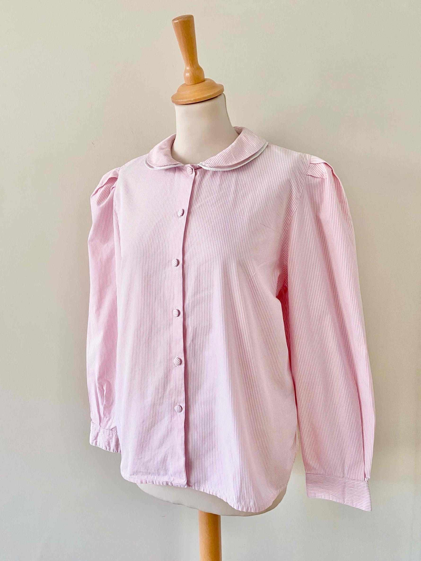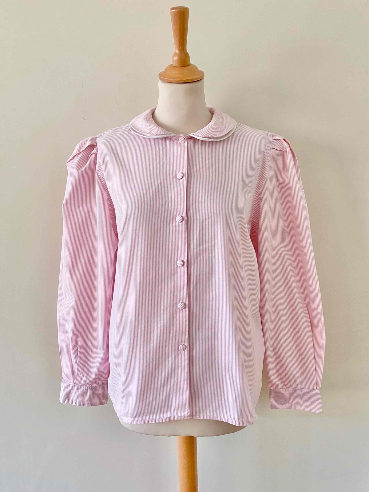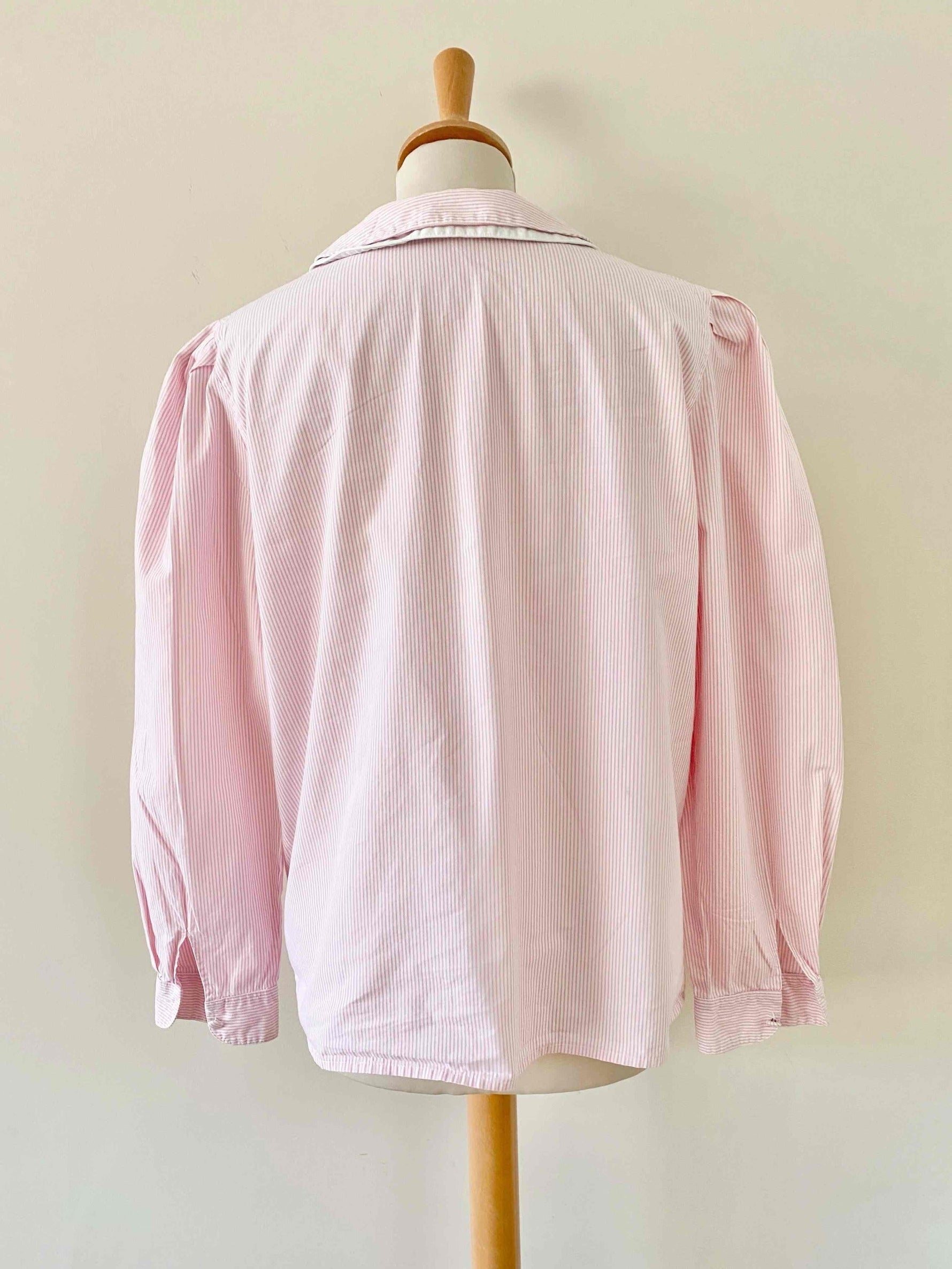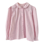 Prix unitaire parBlouse Col Claudine à rayures roses et blanches, double petit col claudine, boutons recouverts, manches ballon, fabriquée en France.