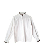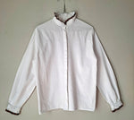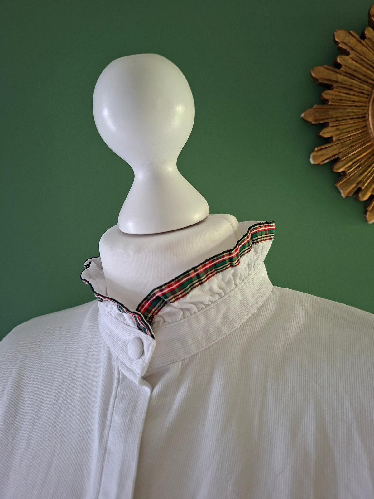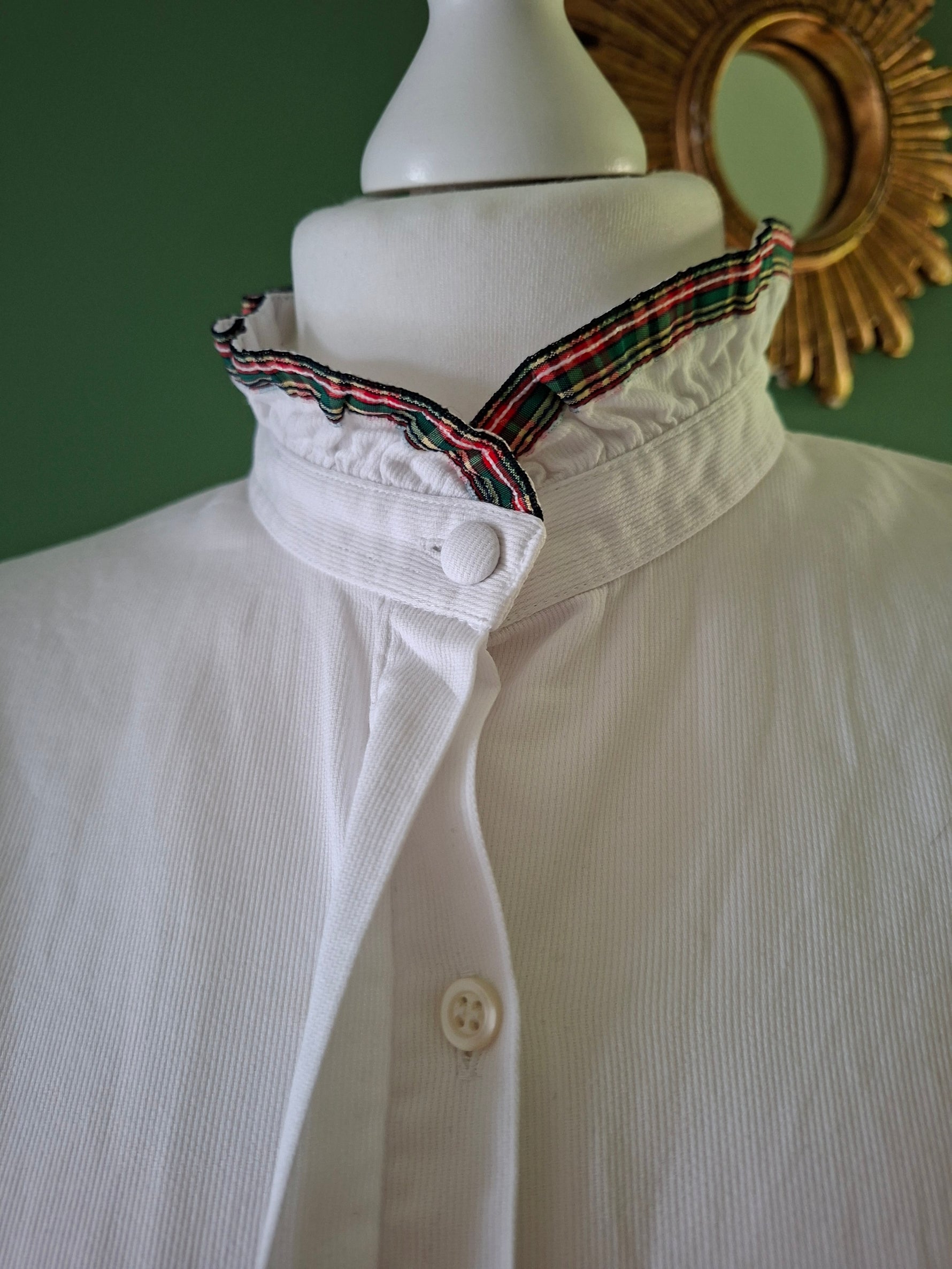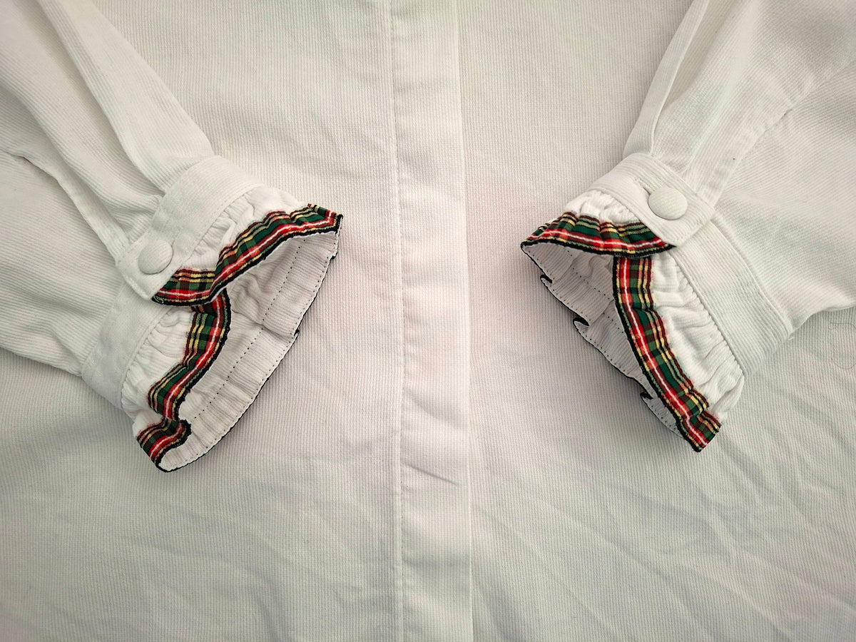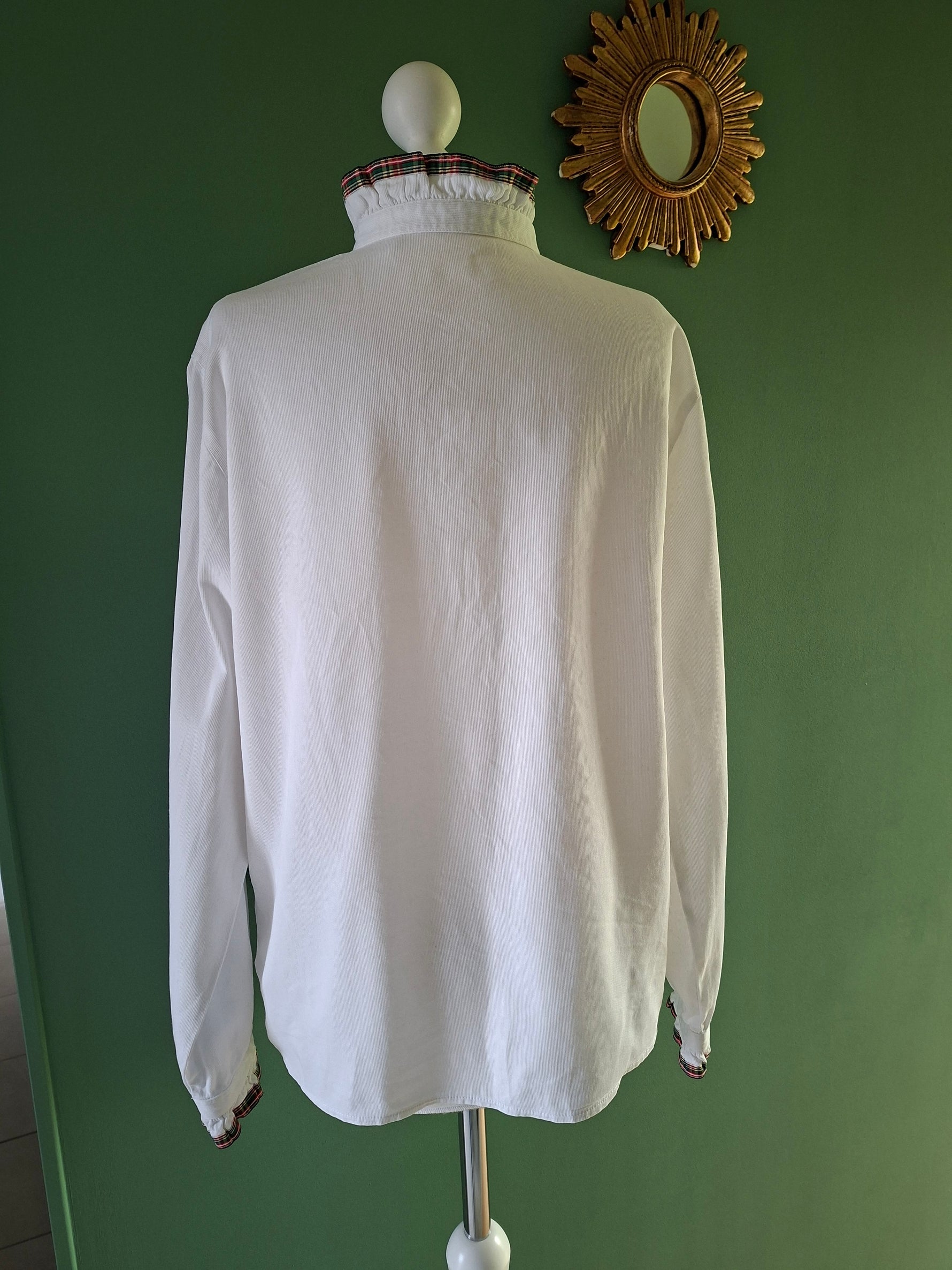 Chemise en coton blanc texturé. Finitions volants sur le col et les poignets. Boutonnage sous patte. Les mesures à plat Épaules 40cm Aisselles 51cm Longueur 60cm Portée ici sur un mannequin taille 38