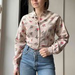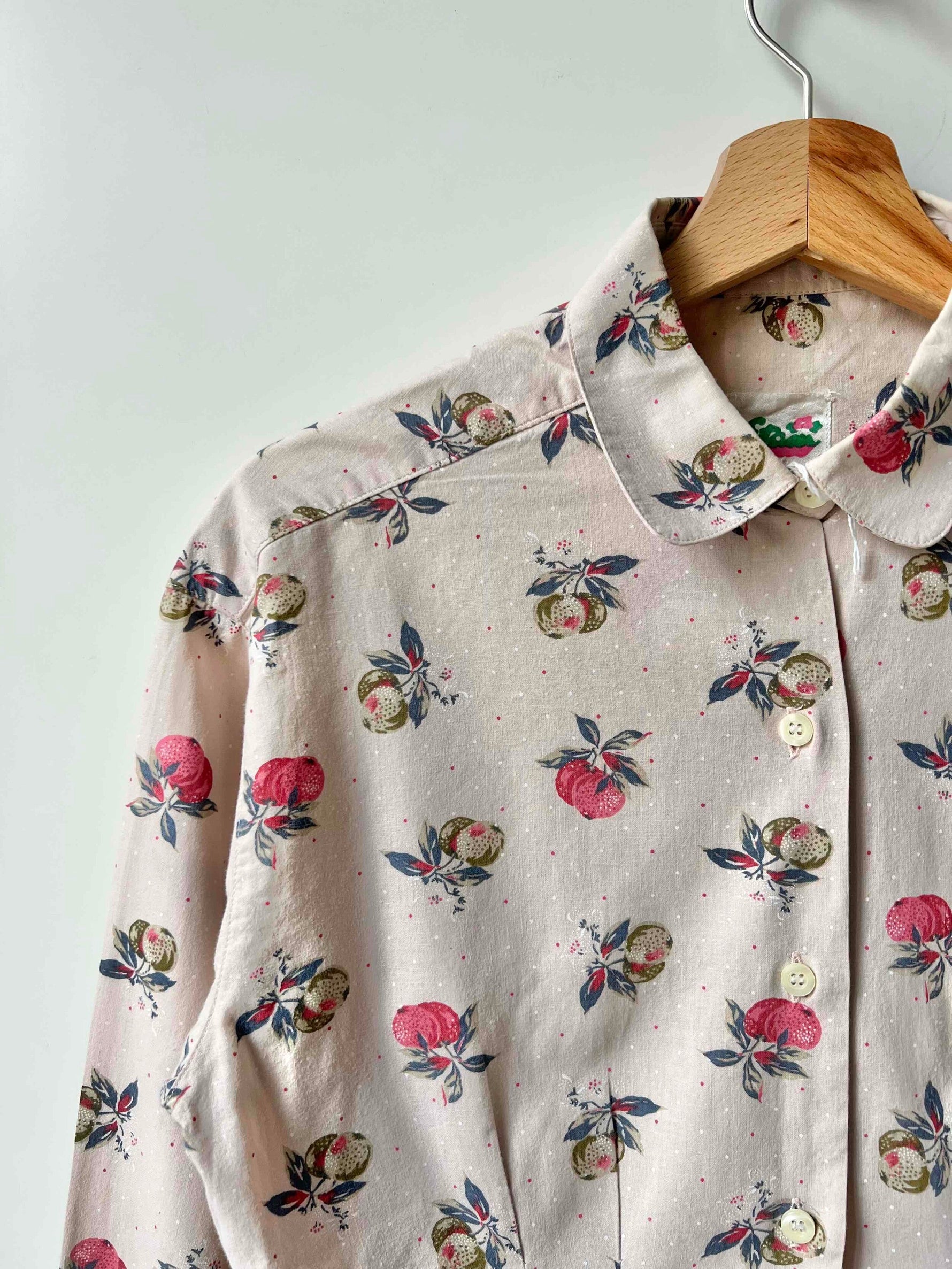 Prix unitaire parChemise à manches longues en coton. Beige légèrement rosé avec un motif de fleurs et fruits (fraises). Cintrée dans le dos. Taille 36/38.