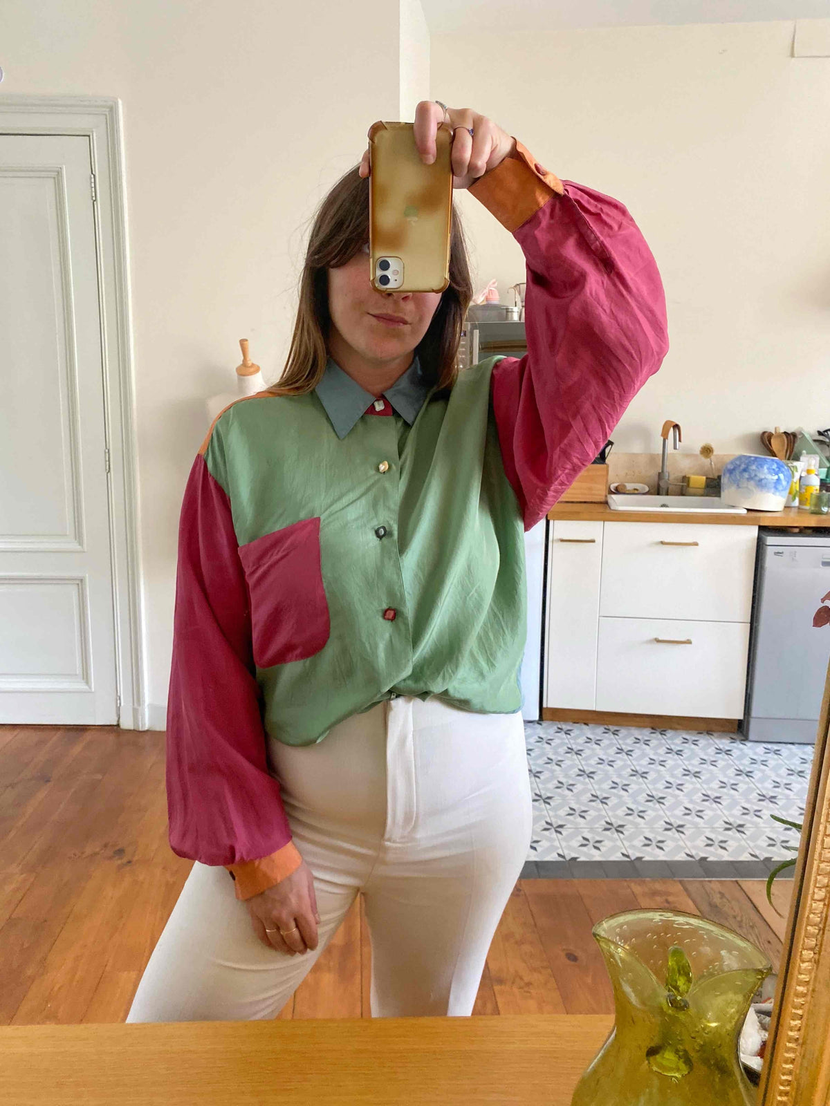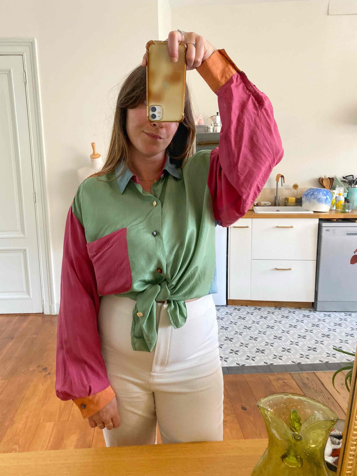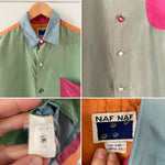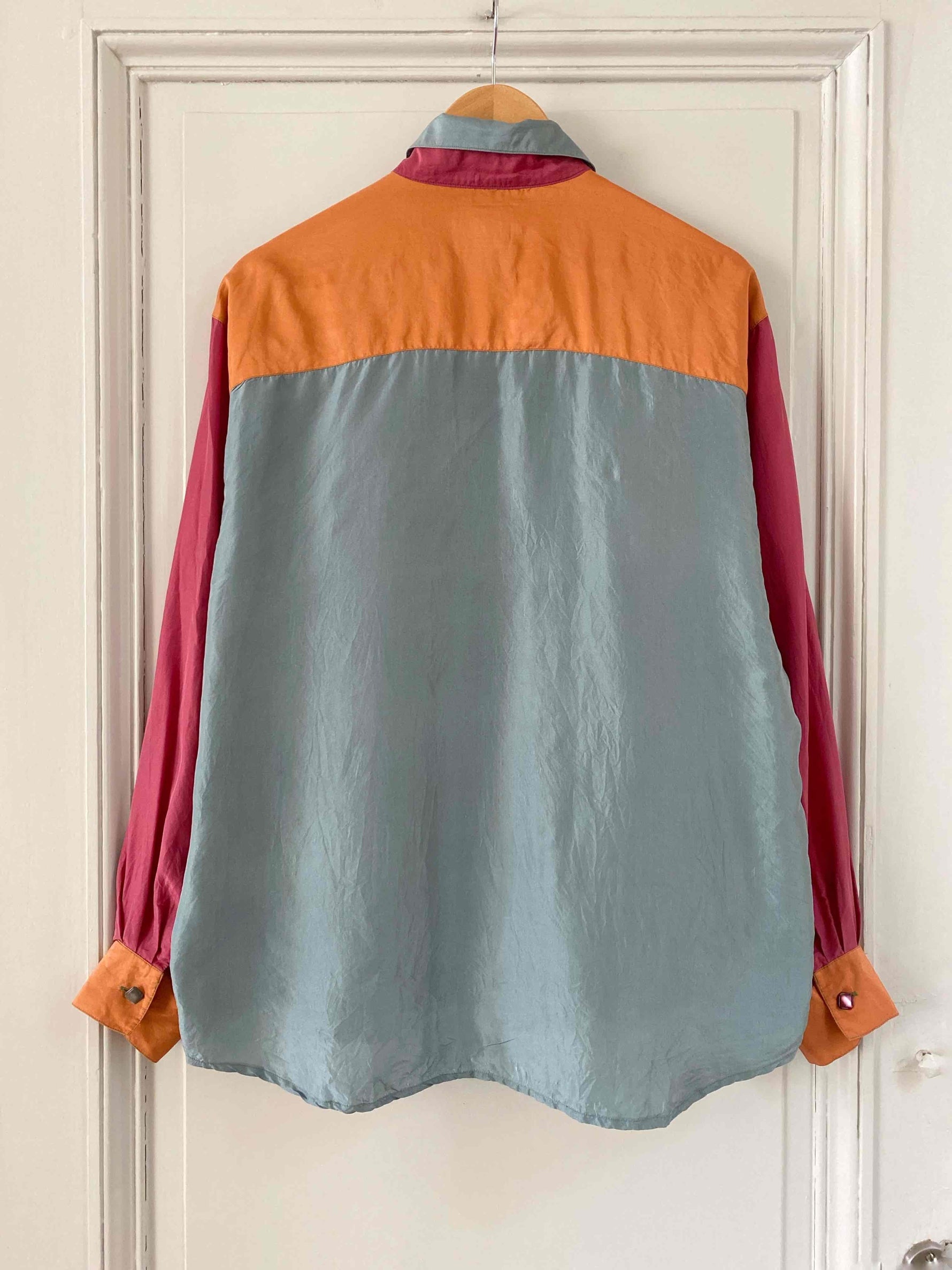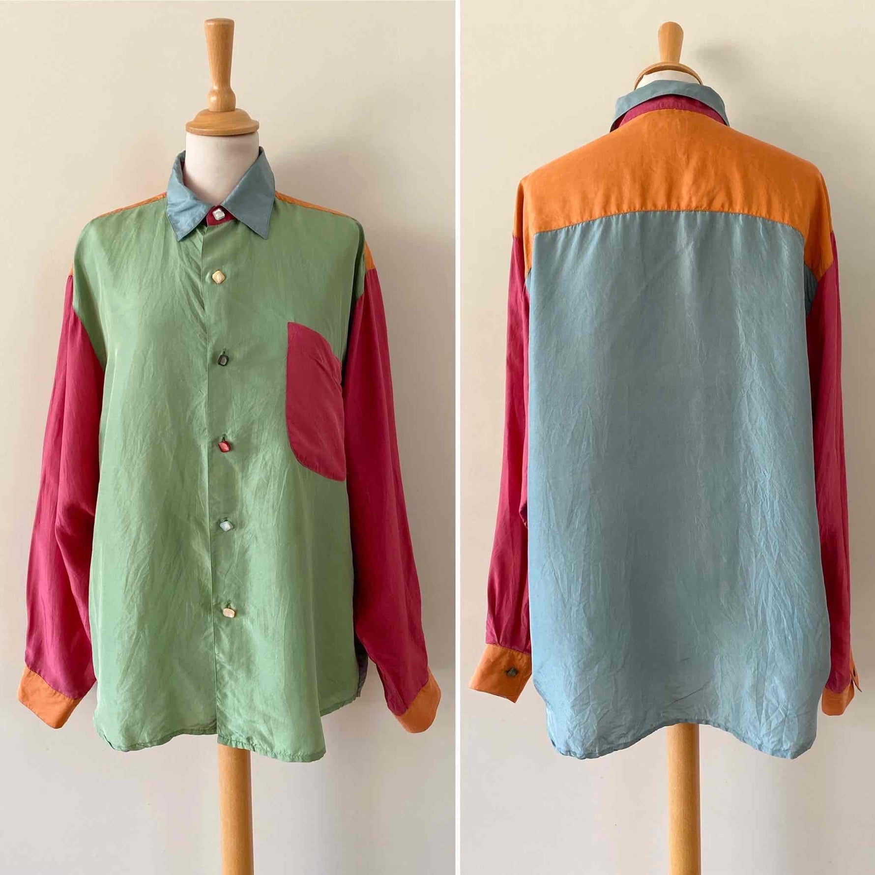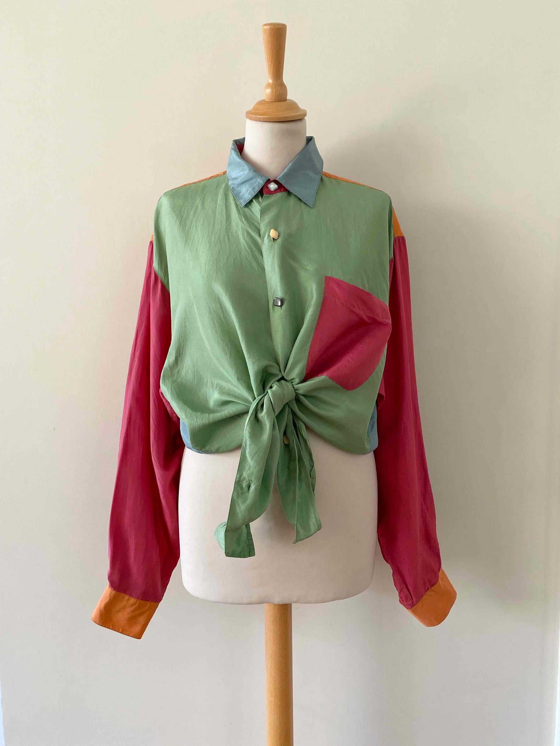 Chemise en Soie en colorblock multicolores vert amande, rouge, bleu ciel et orange, boutons bijoux en nacre véritable couleur assorties à la soie, années 90’s, notée taille unique convient du 36 au 40, et portée ici sur un mannequin T36 et une personne T40.