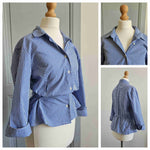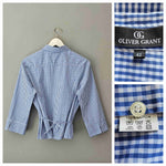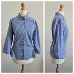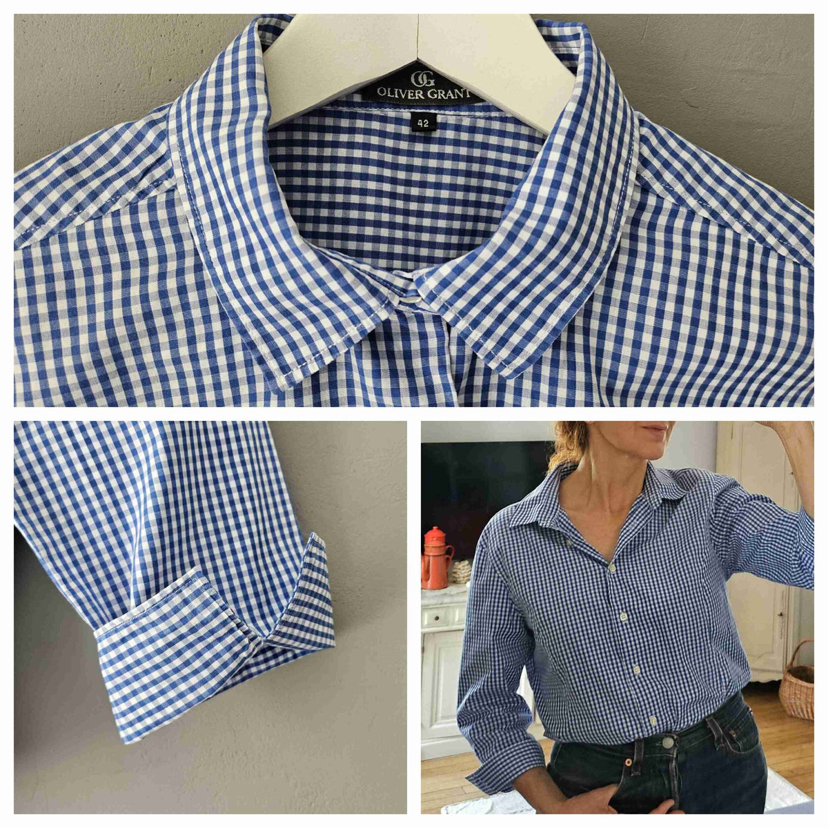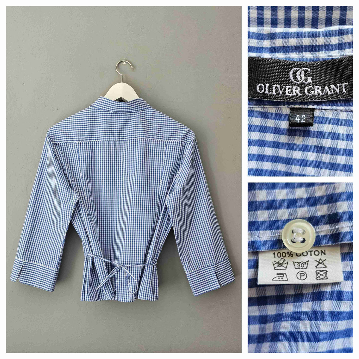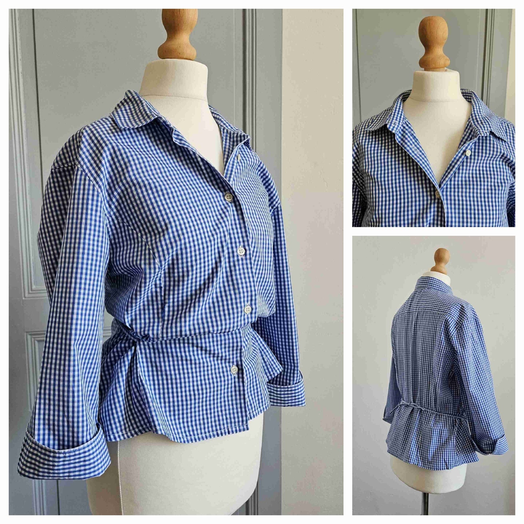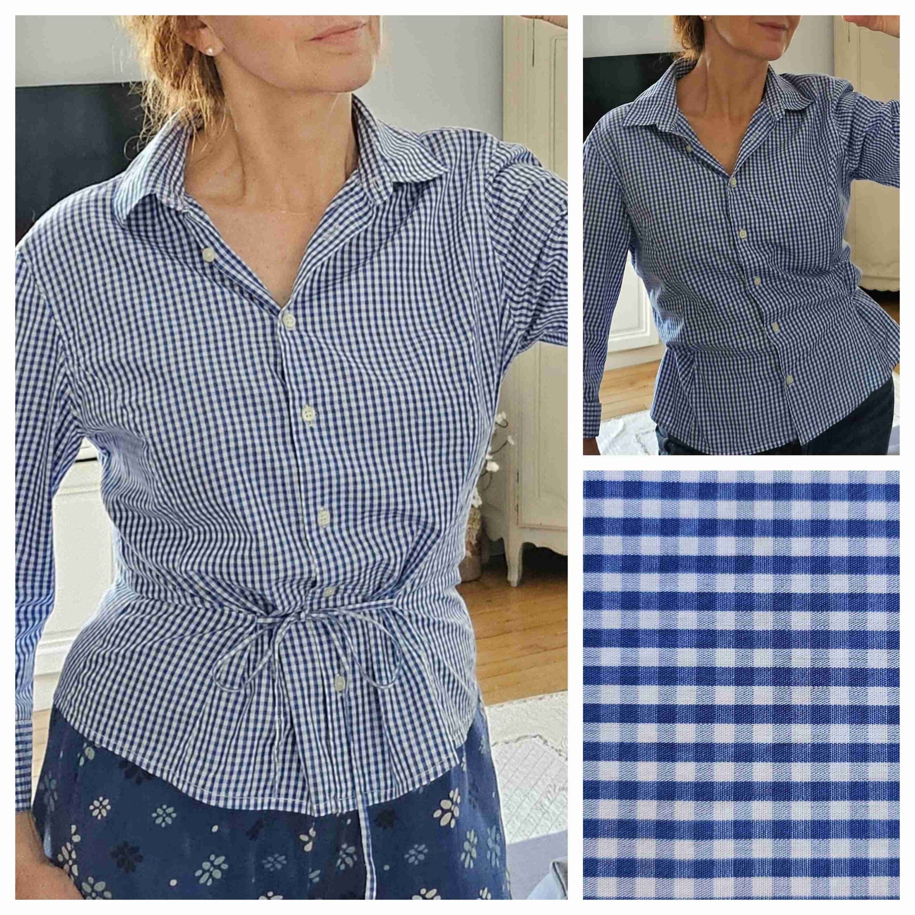 Prix unitaire parChemise en coton vichy bleu roi, manches 3/4, poignets à revers, coupe légèrement cintrée avec lien à nouer devant ou derrière. Porté sur les photos par une personne T36. 100% coton.