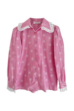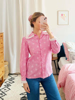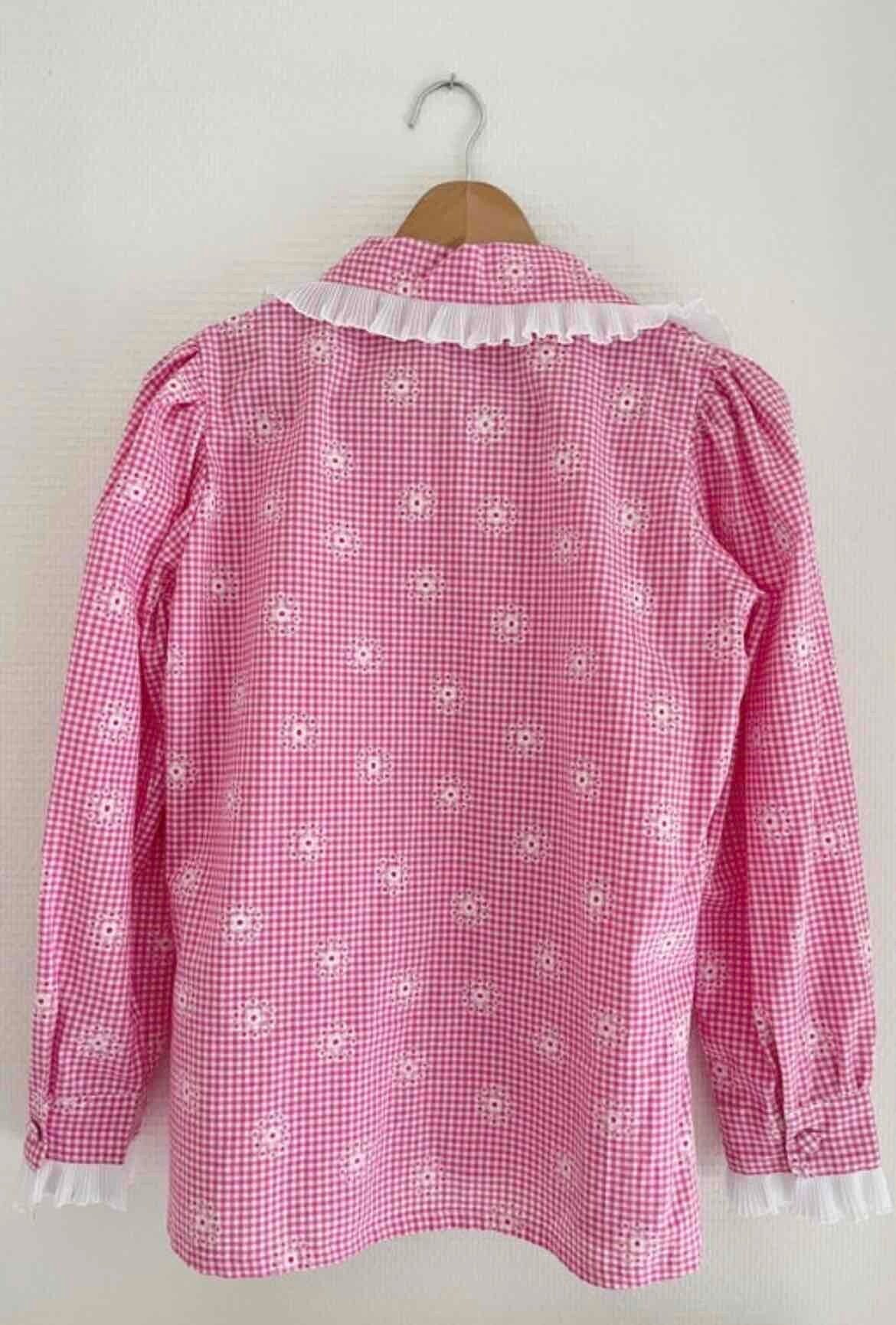 Prix unitaire parChemise vichy à petits carreaux blancs et roses, brodée de fleurs blanches, jolie dentelle au niveau du col Claudine et des poignets. Portée ici sur une T36 pour 1,64 m