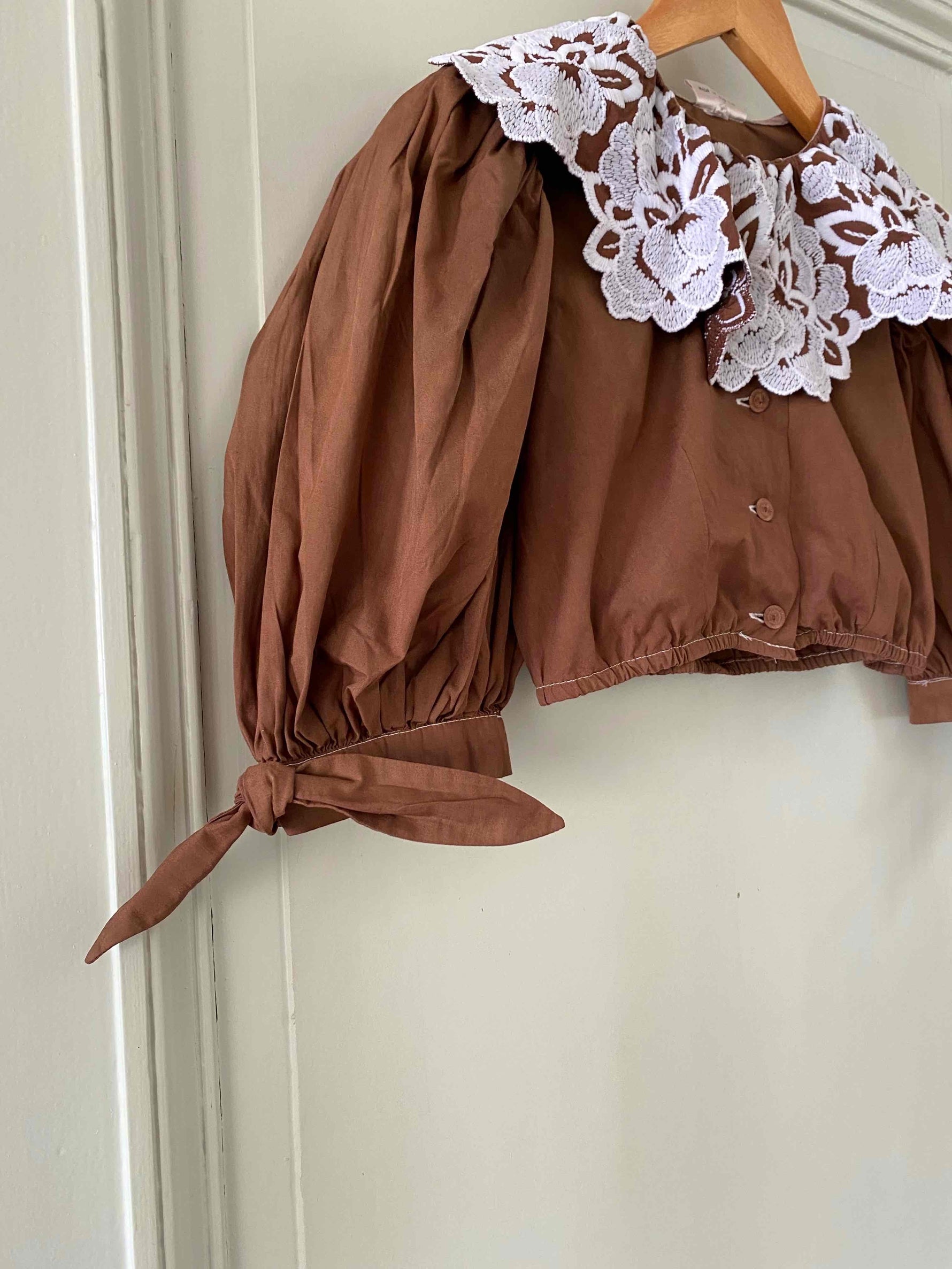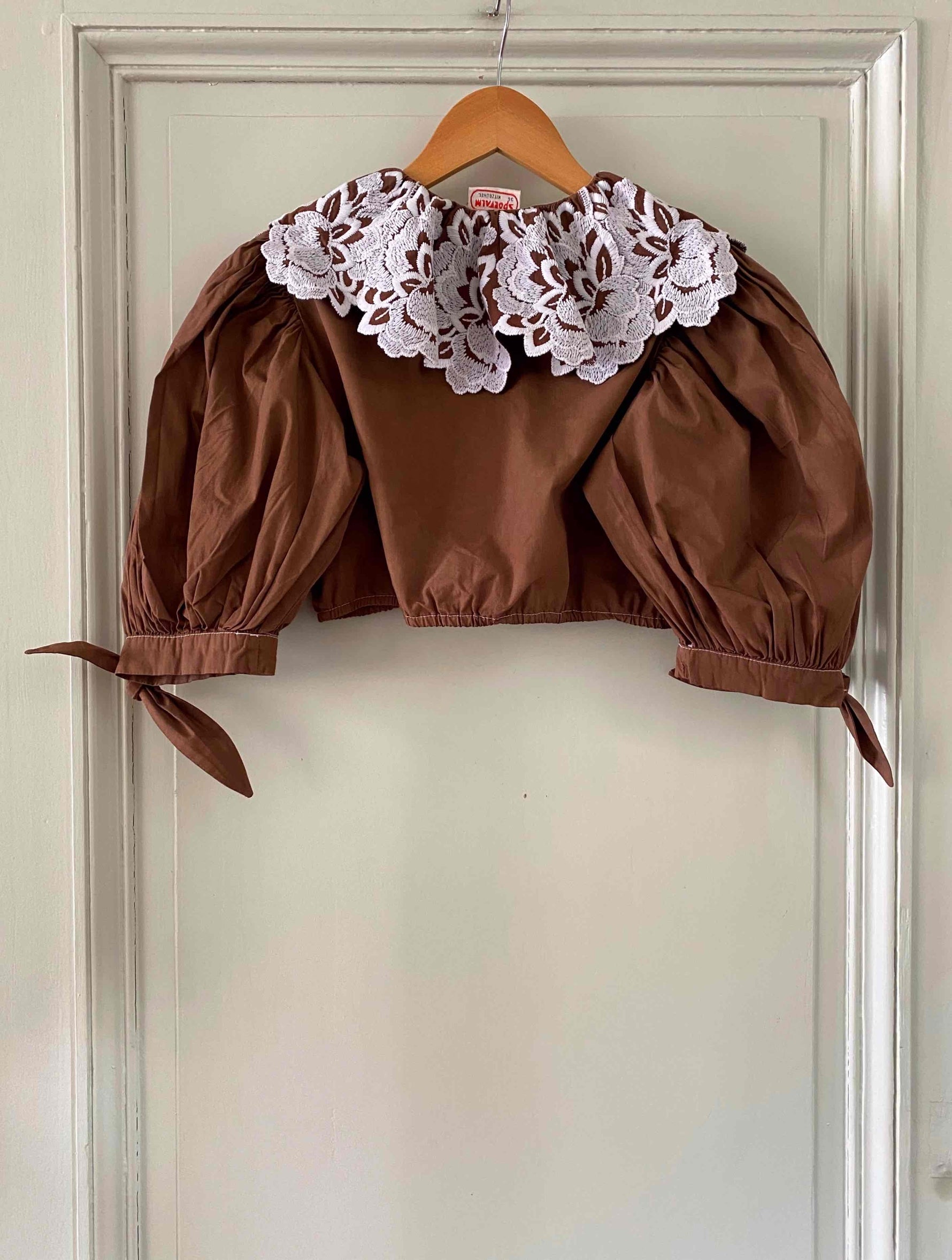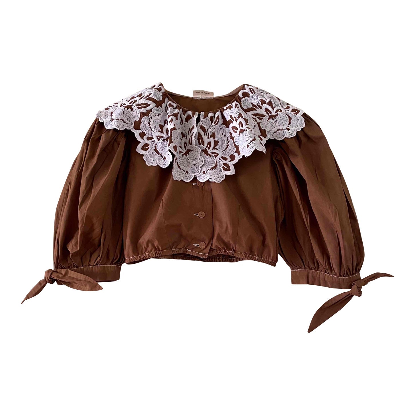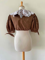 Crop top autrichien en pur coton chocolat, grand col brodé de fleurs blanches, manches ballons avec noeuds, boutons au crochet, taille élastique, fabriqué en Autriche, taille 34 et 36 porté ici sur un mannequin T36.