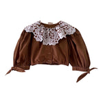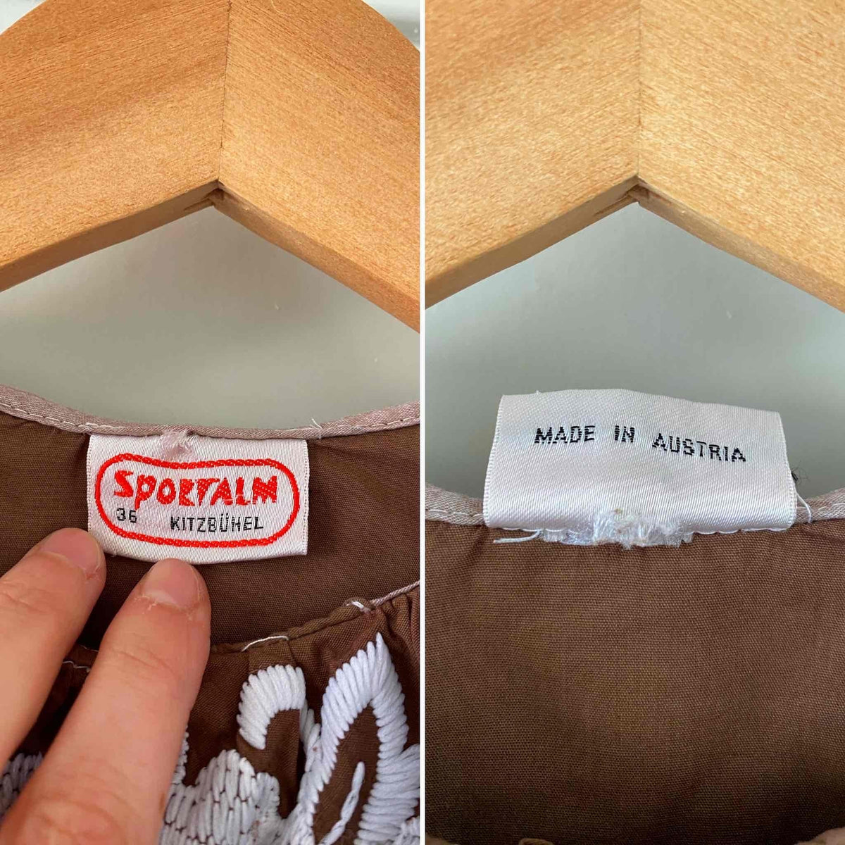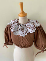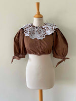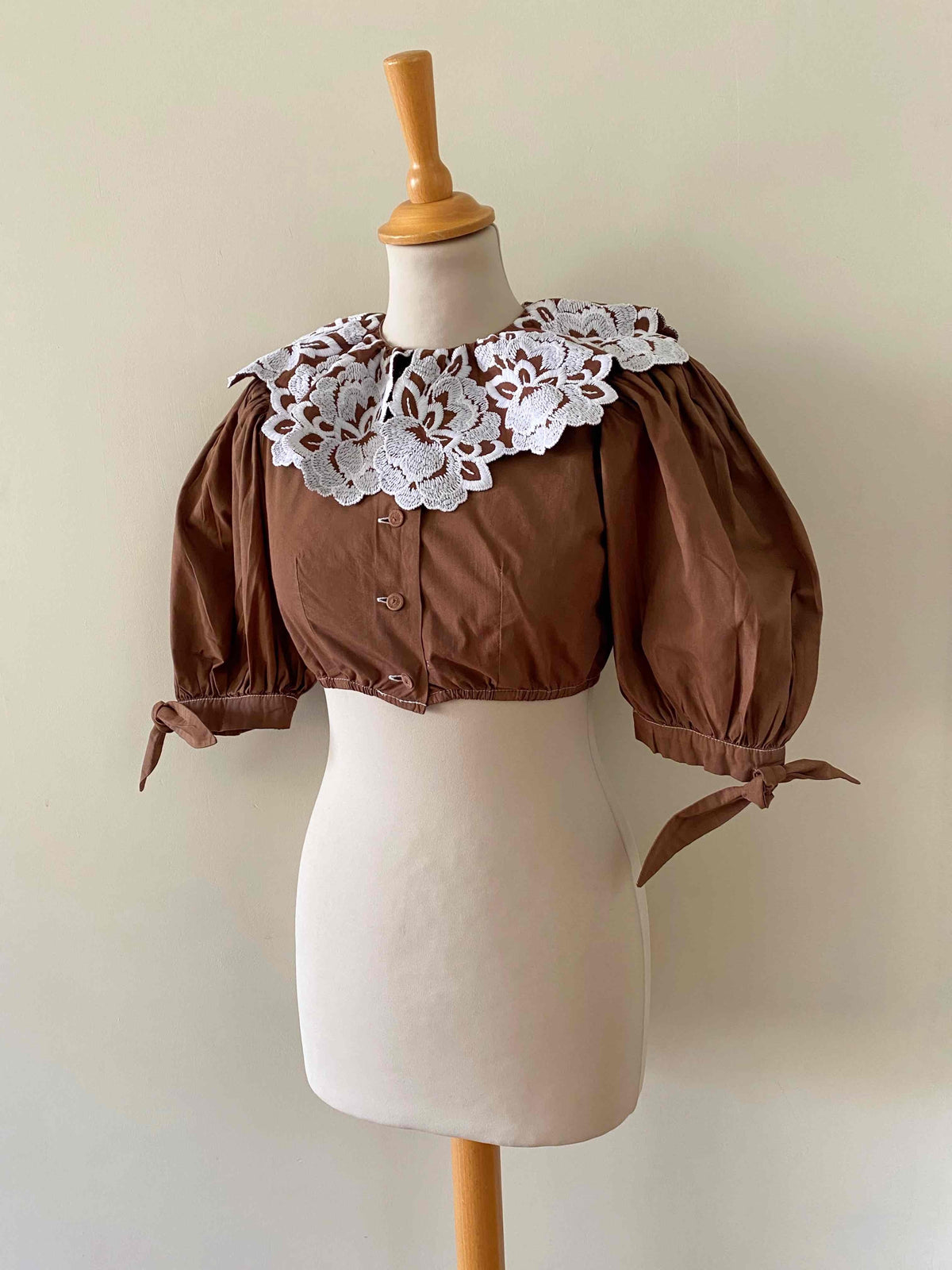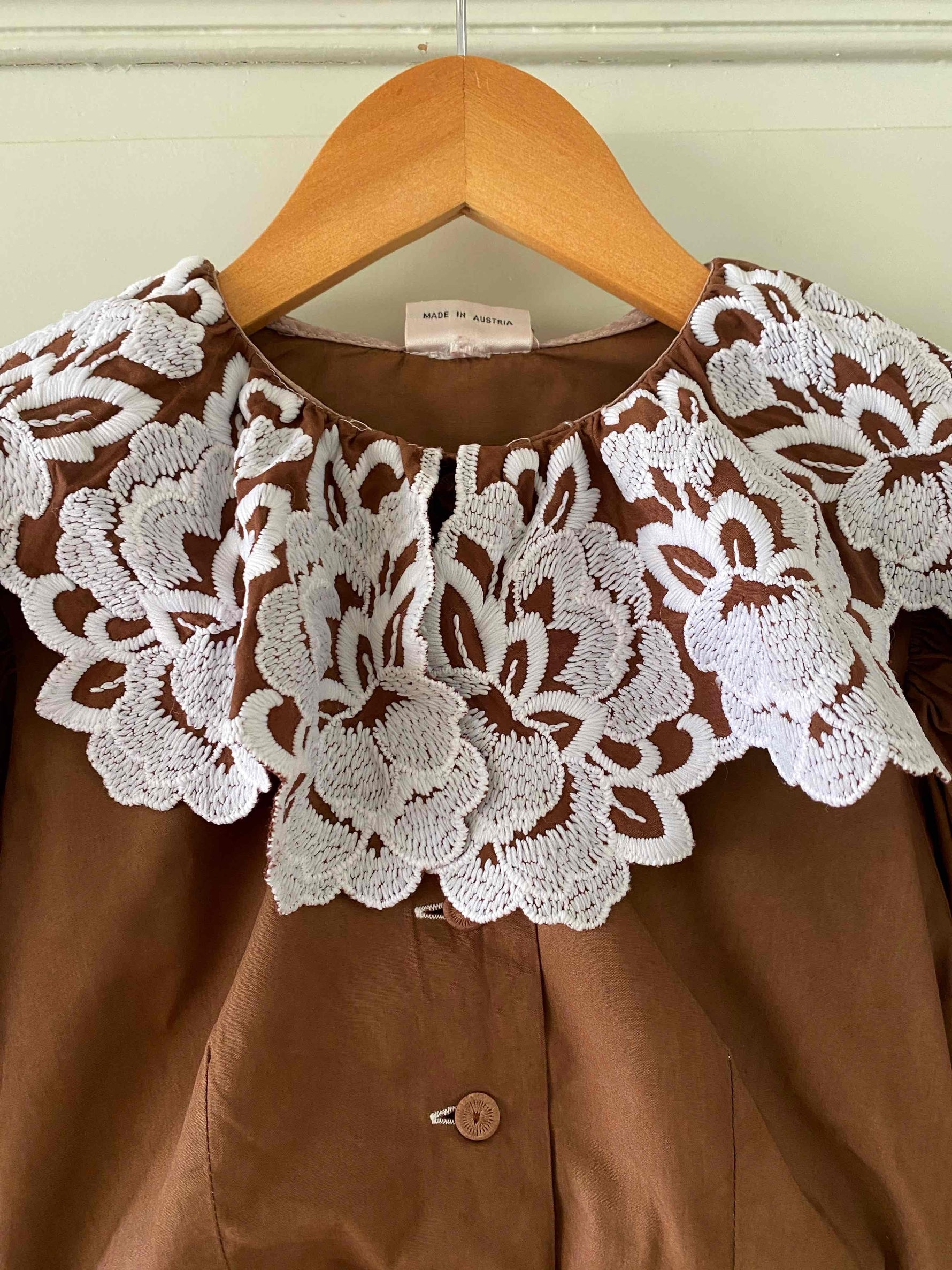 Crop top autrichien en pur coton chocolat, grand col brodé de fleurs blanches, manches ballons avec noeuds, boutons au crochet, taille élastique, fabriqué en Autriche, taille 34 et 36 porté ici sur un mannequin T36.