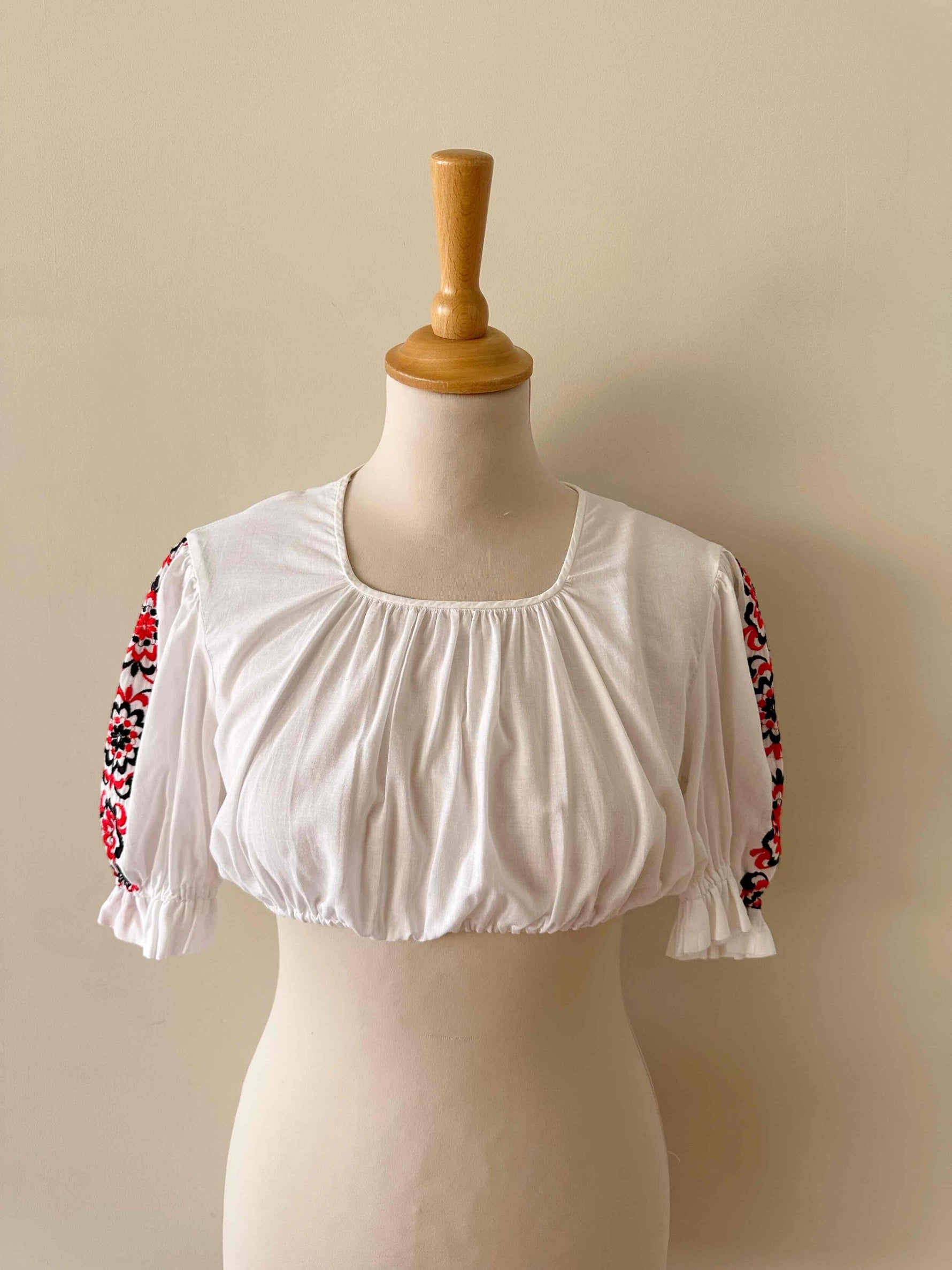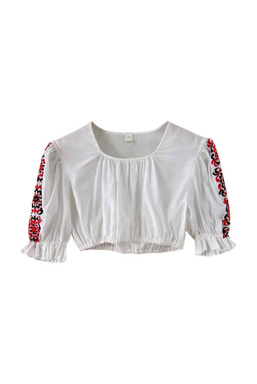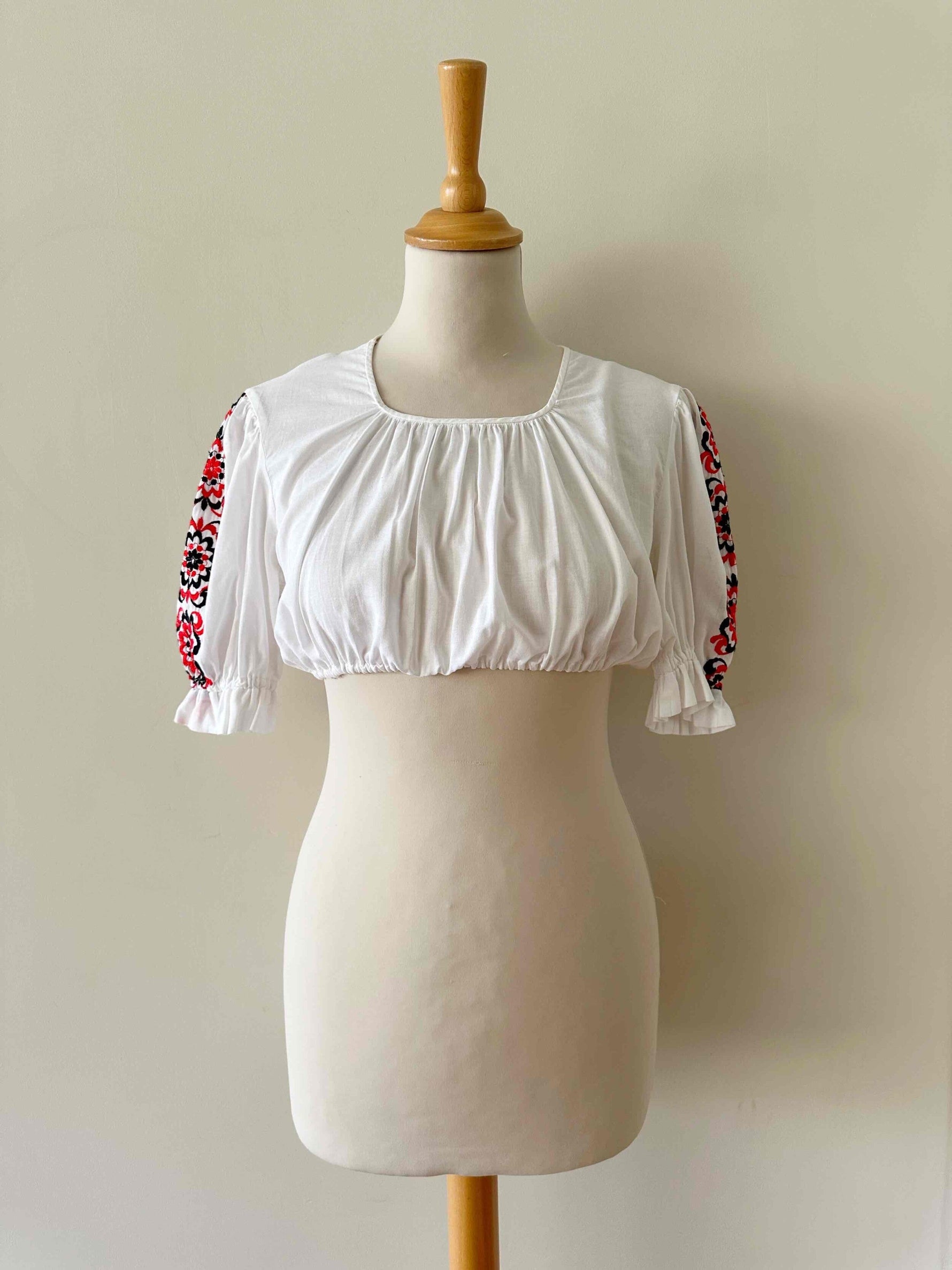 Crop top autrichien, en 100% coton, manches ballons brodées de fleurs rouges et noires, encolure corsage froncée, carrée, bas élastique, fabriqué en Autriche, taille 36 porté ici sur un mannequin T36.