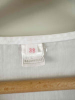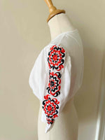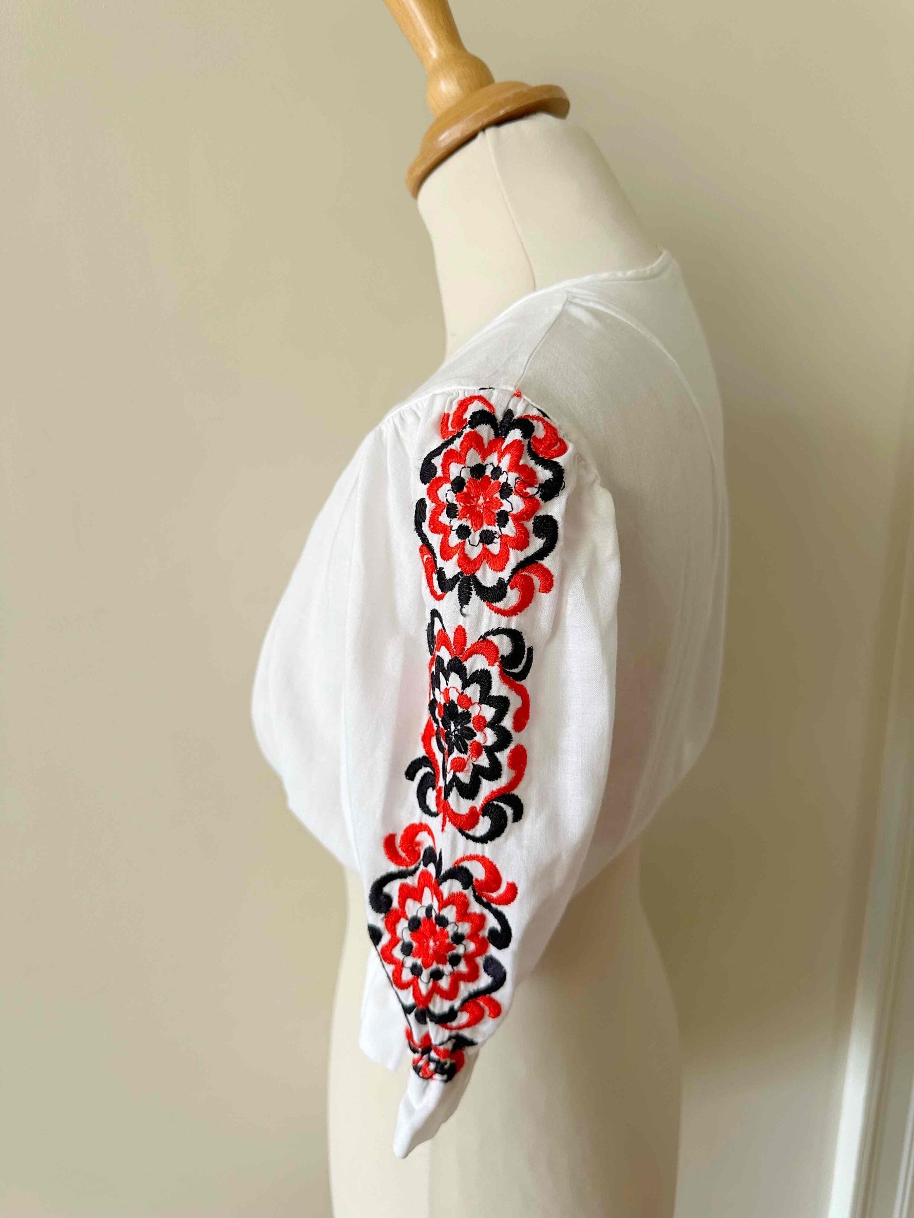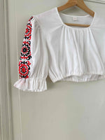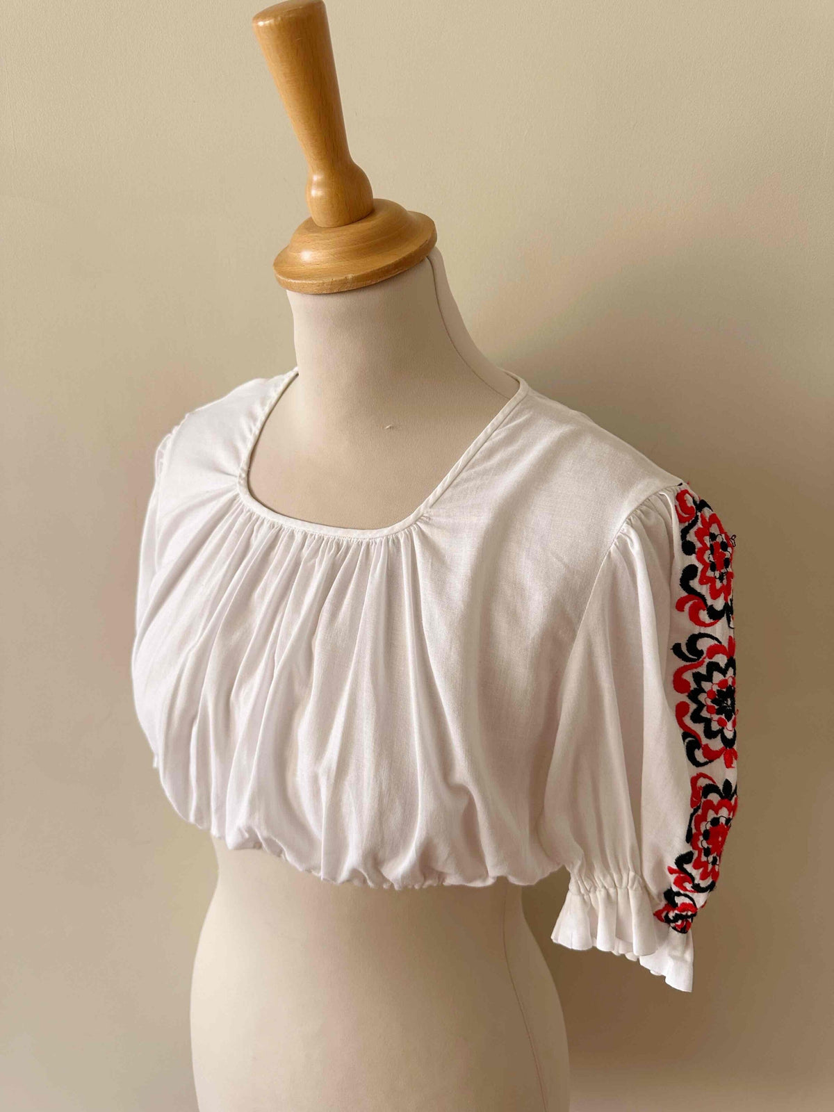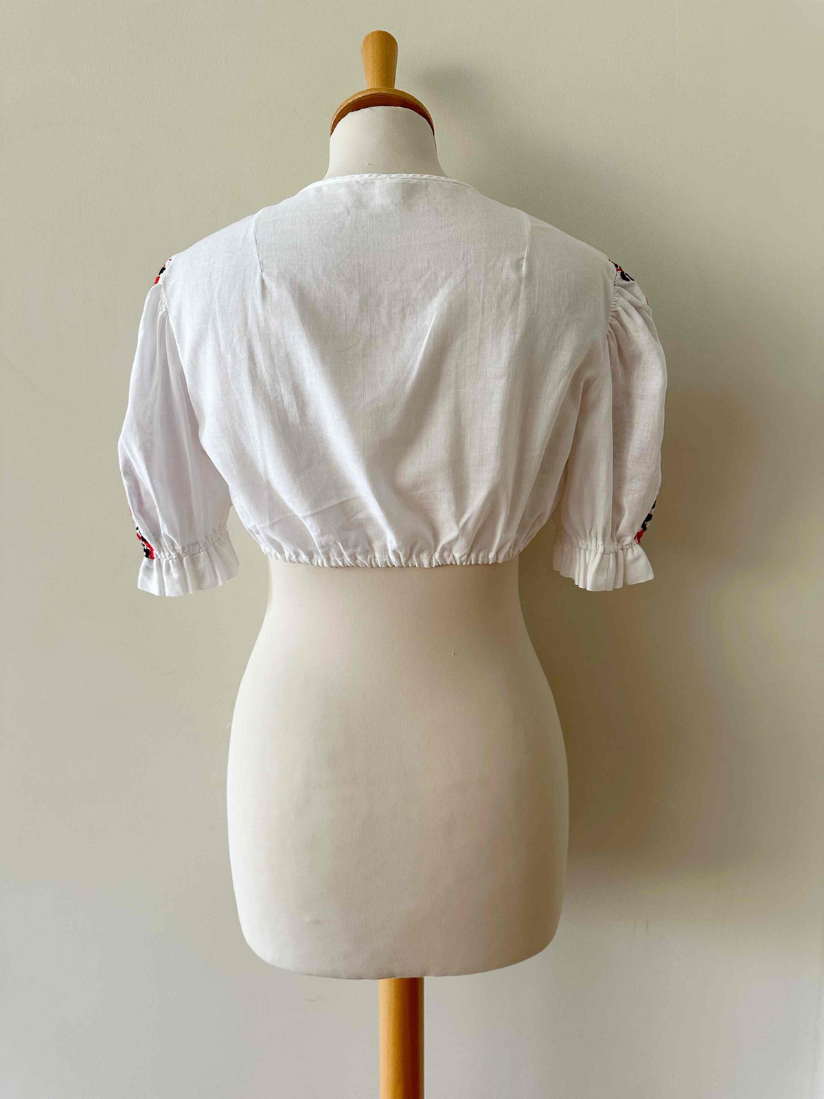 Crop top autrichien, en 100% coton, manches ballons brodées de fleurs rouges et noires, encolure corsage froncée, carrée, bas élastique, fabriqué en Autriche, taille 36 porté ici sur un mannequin T36.