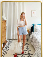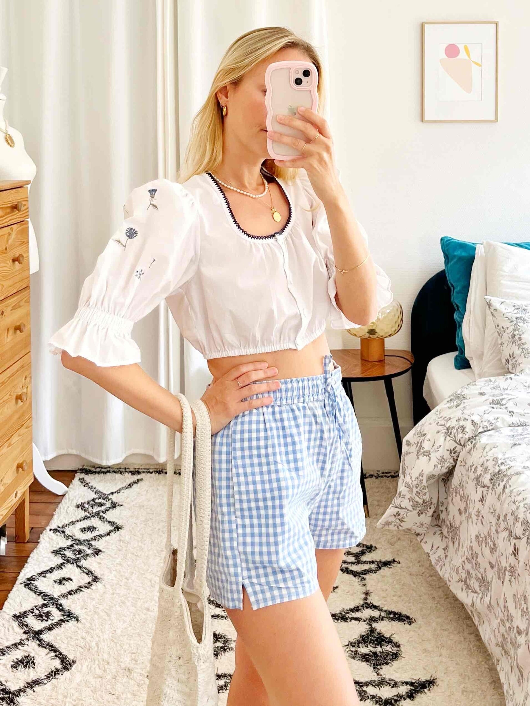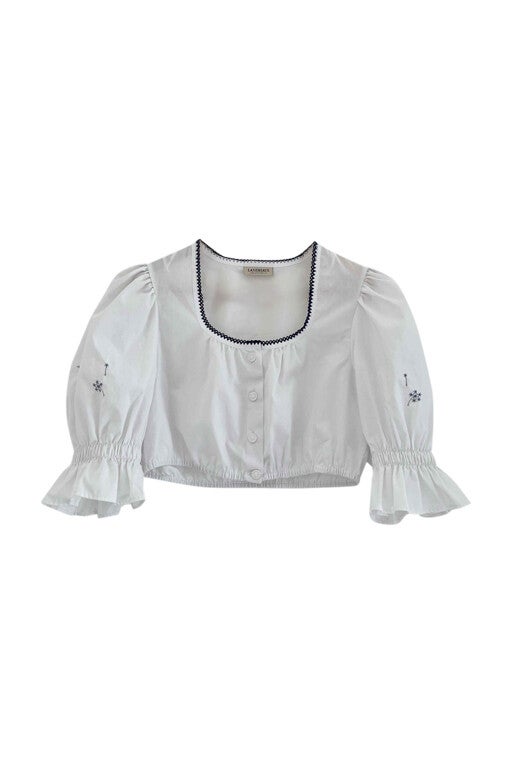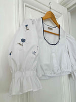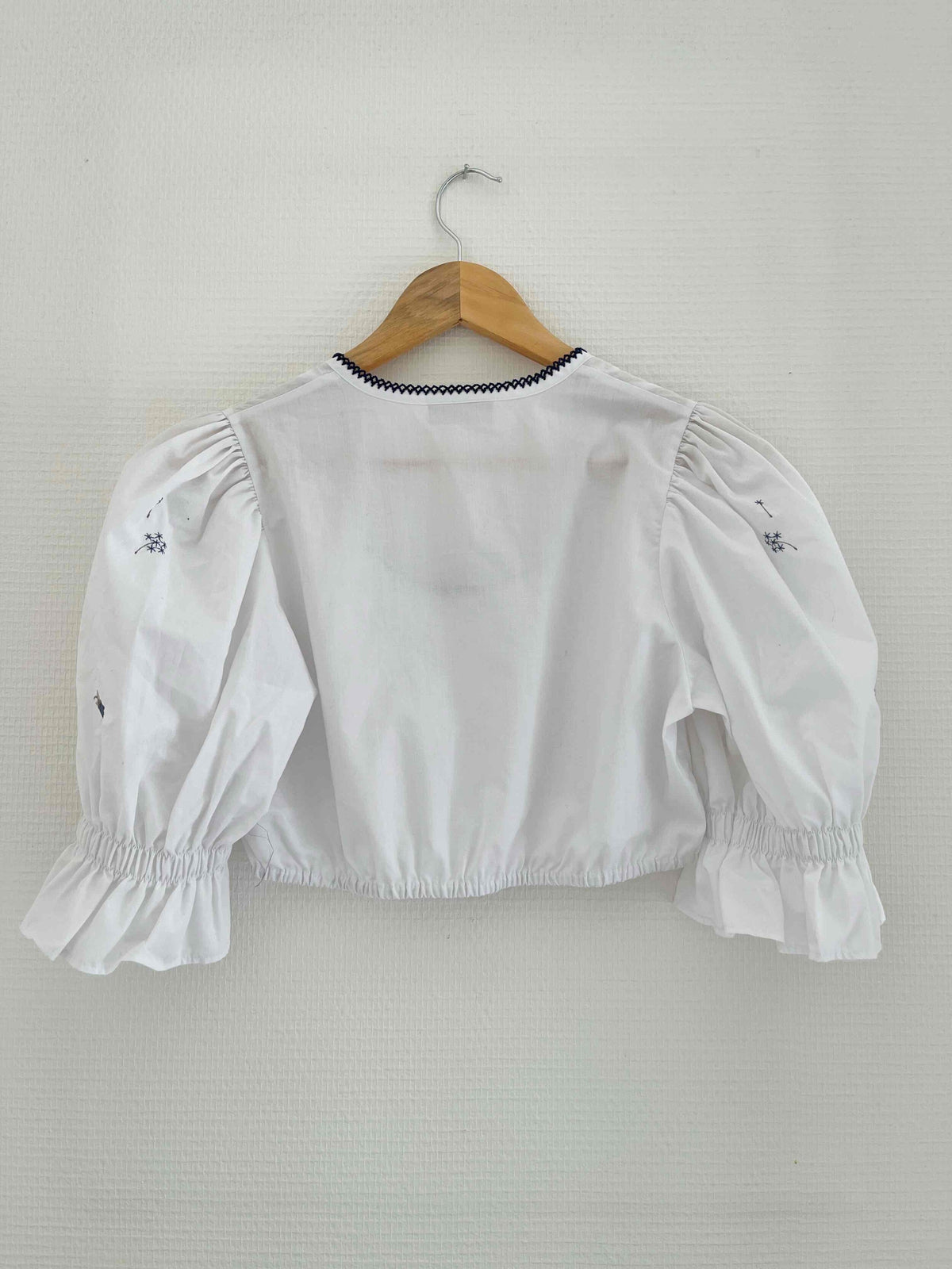 Prix unitaire parCrop top autrichien, manches bouffantes brodées de fleurs, boutons authentiques, Col orné d’un joli liseré bleu foncé. Porté ici sur une T36 pour 1,64 m