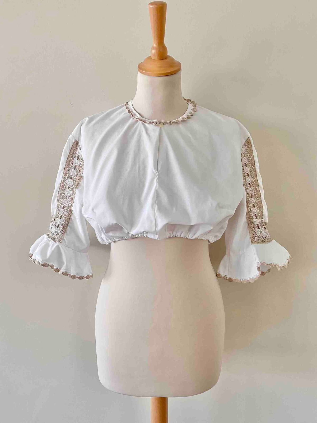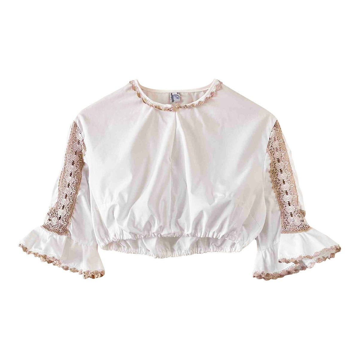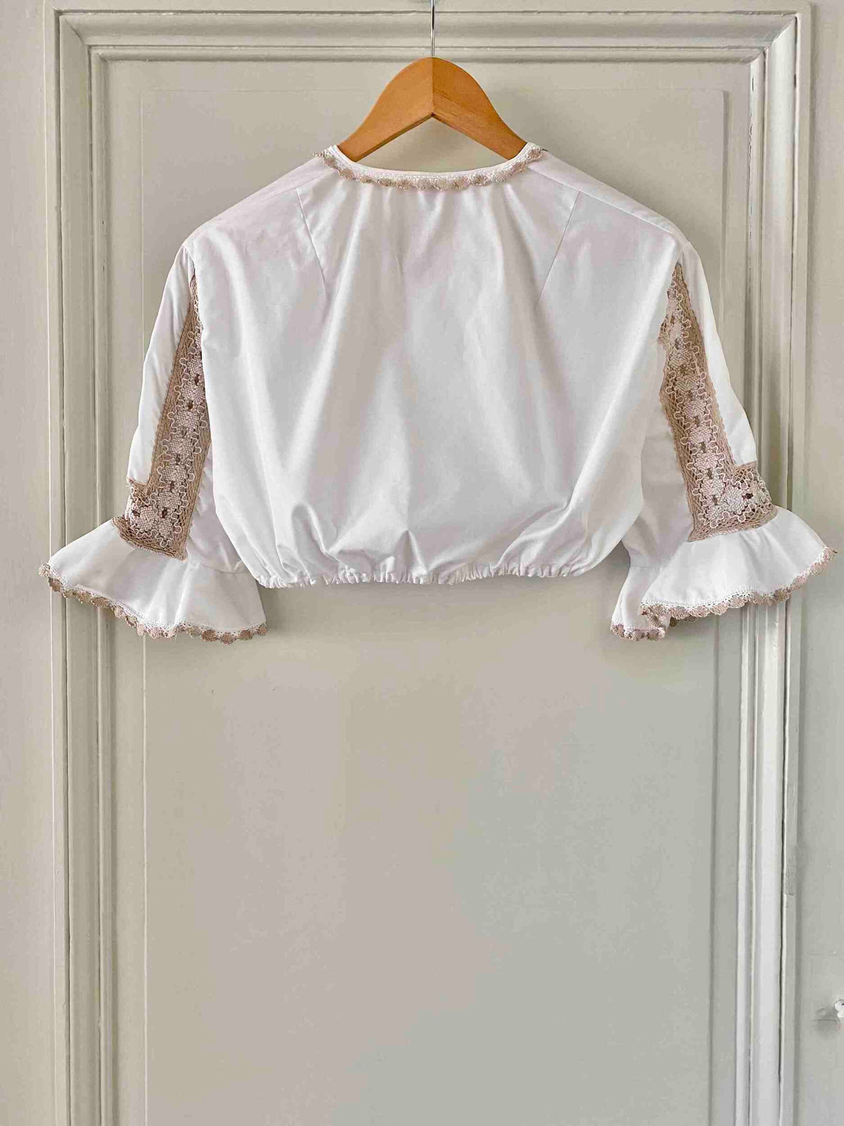 Prix unitaire parCrop Top Autrichien en coton brodé de dentelle macramé crochet beige camel et blanc, col a goutte boutonné, manches trompettes volantées brodées, bas élastique, fabriquée en Autriche