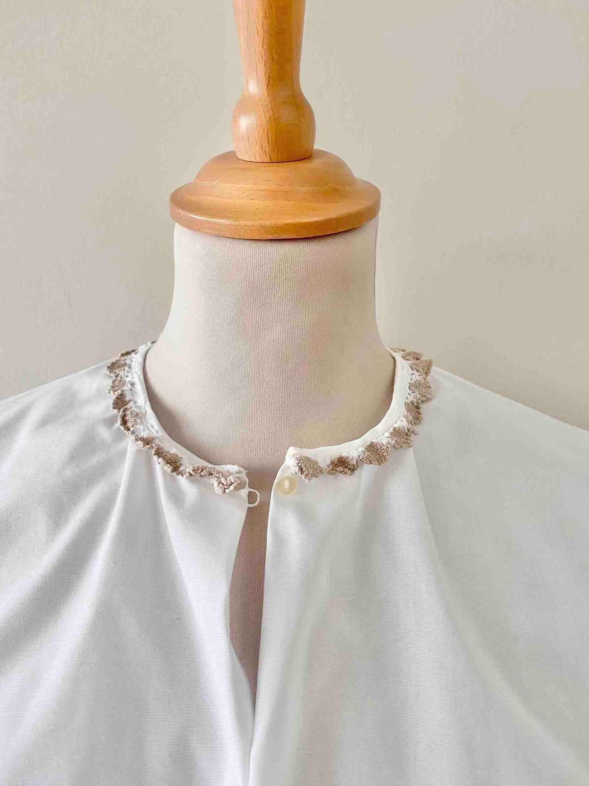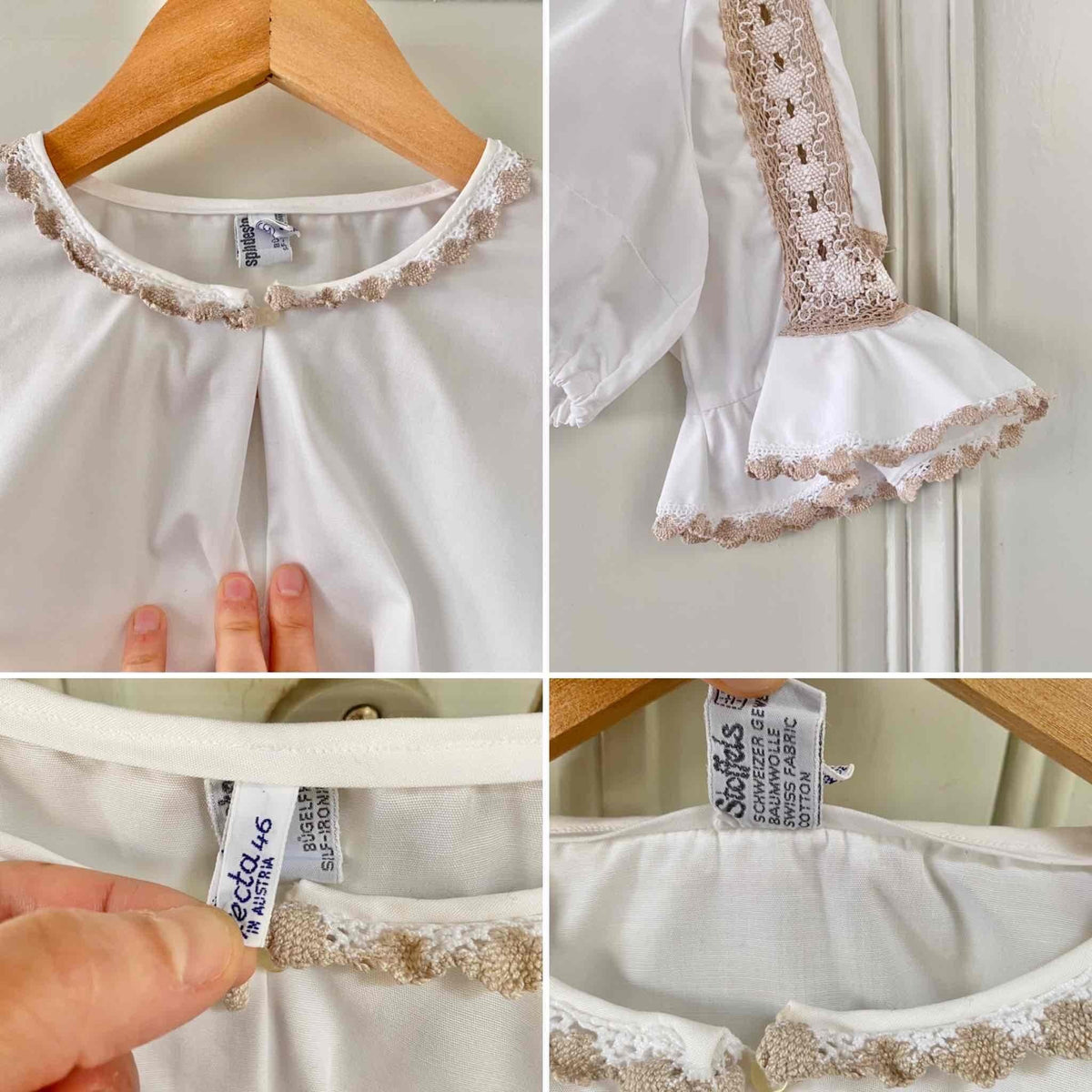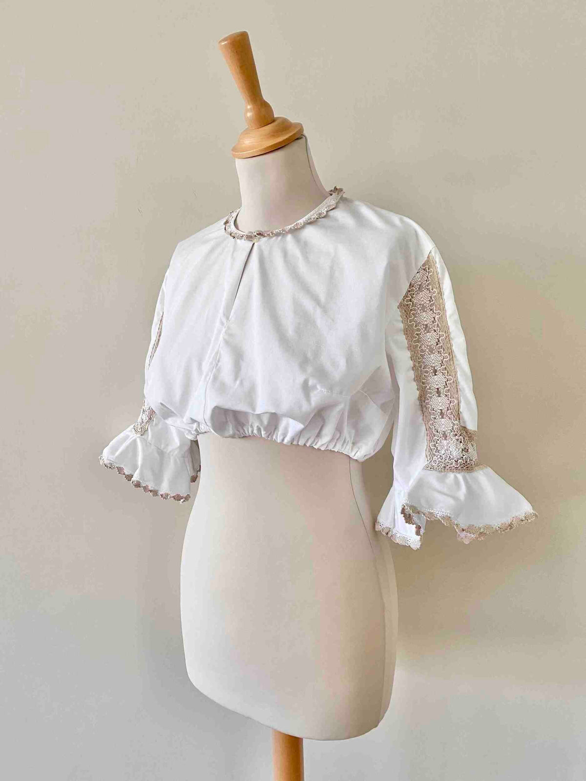 Prix unitaire parCrop Top Autrichien en coton brodé de dentelle macramé crochet beige camel et blanc, col a goutte boutonné, manches trompettes volantées brodées, bas élastique, fabriquée en Autriche