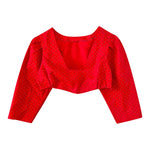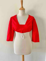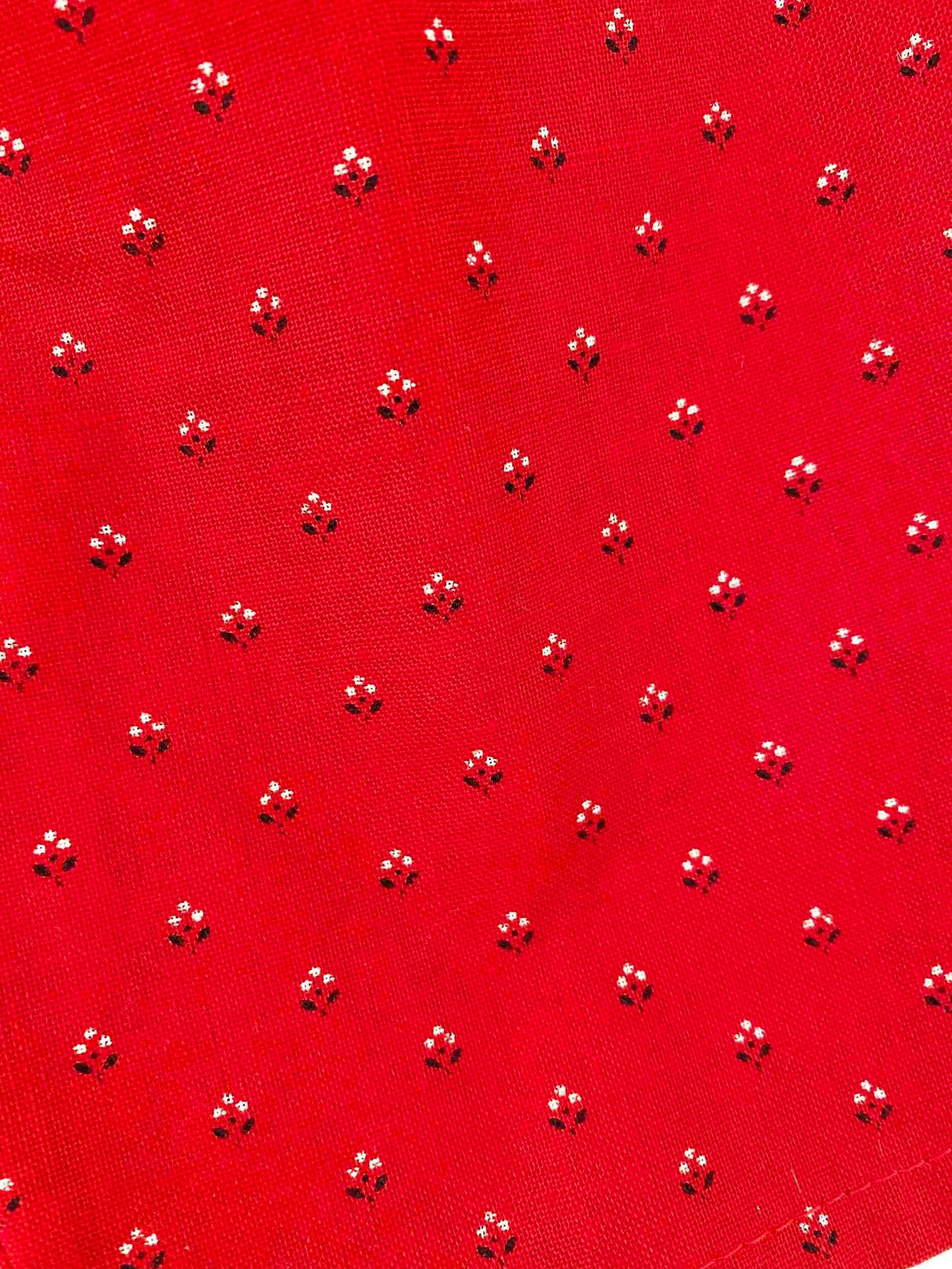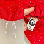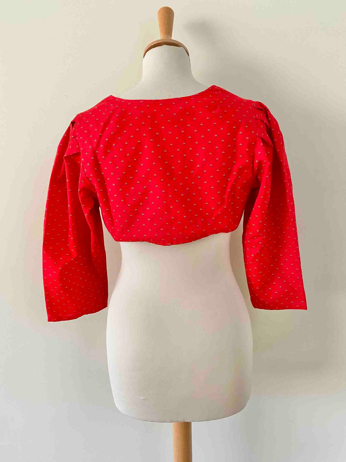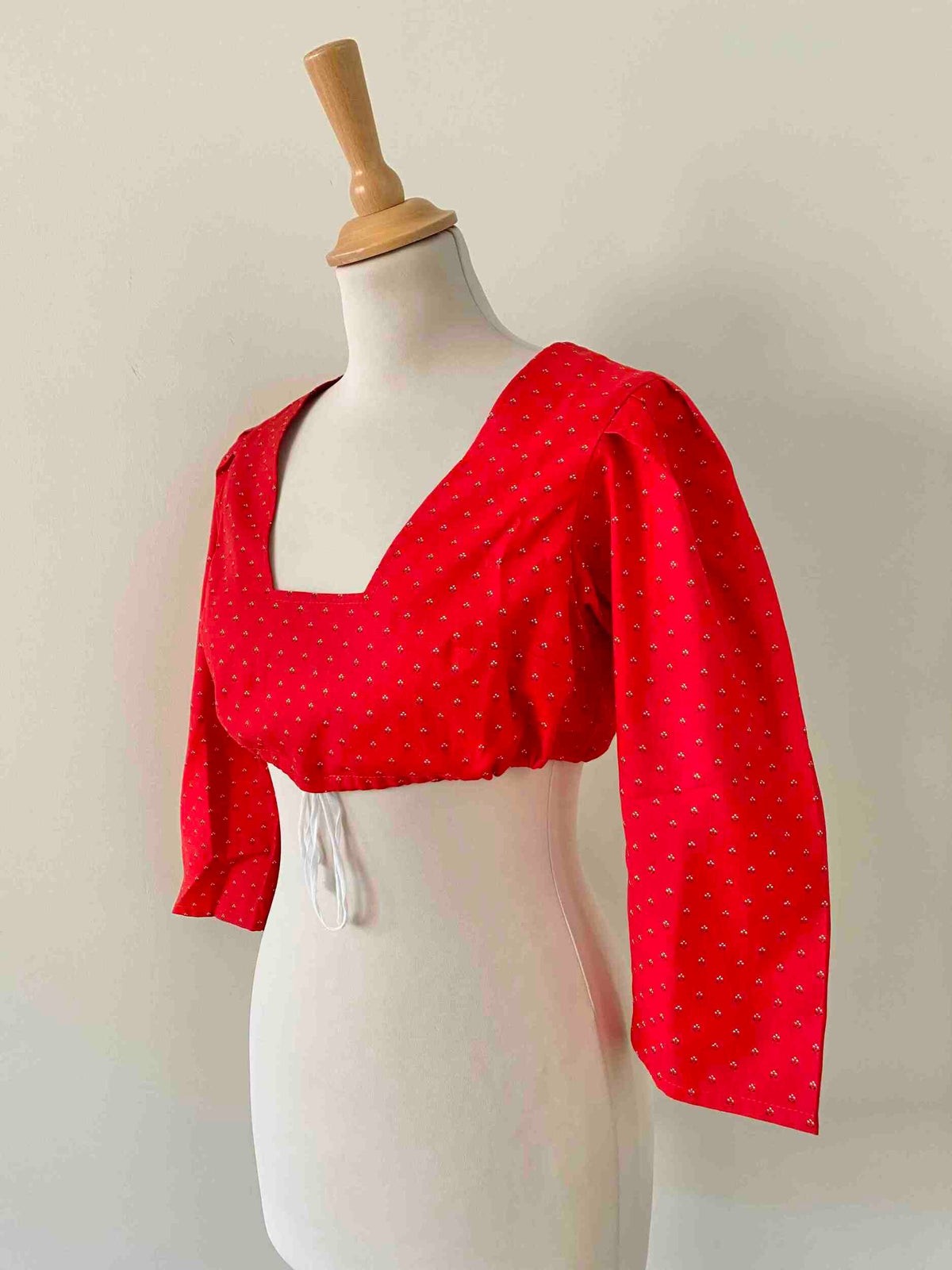Prix unitaire parCrop top autrichien en coton rouge imprimé minis fleurs pois blancs et noirs, encolure corsage carrée, manches ballons 3/4, lien à coulisser et nouer taille.
