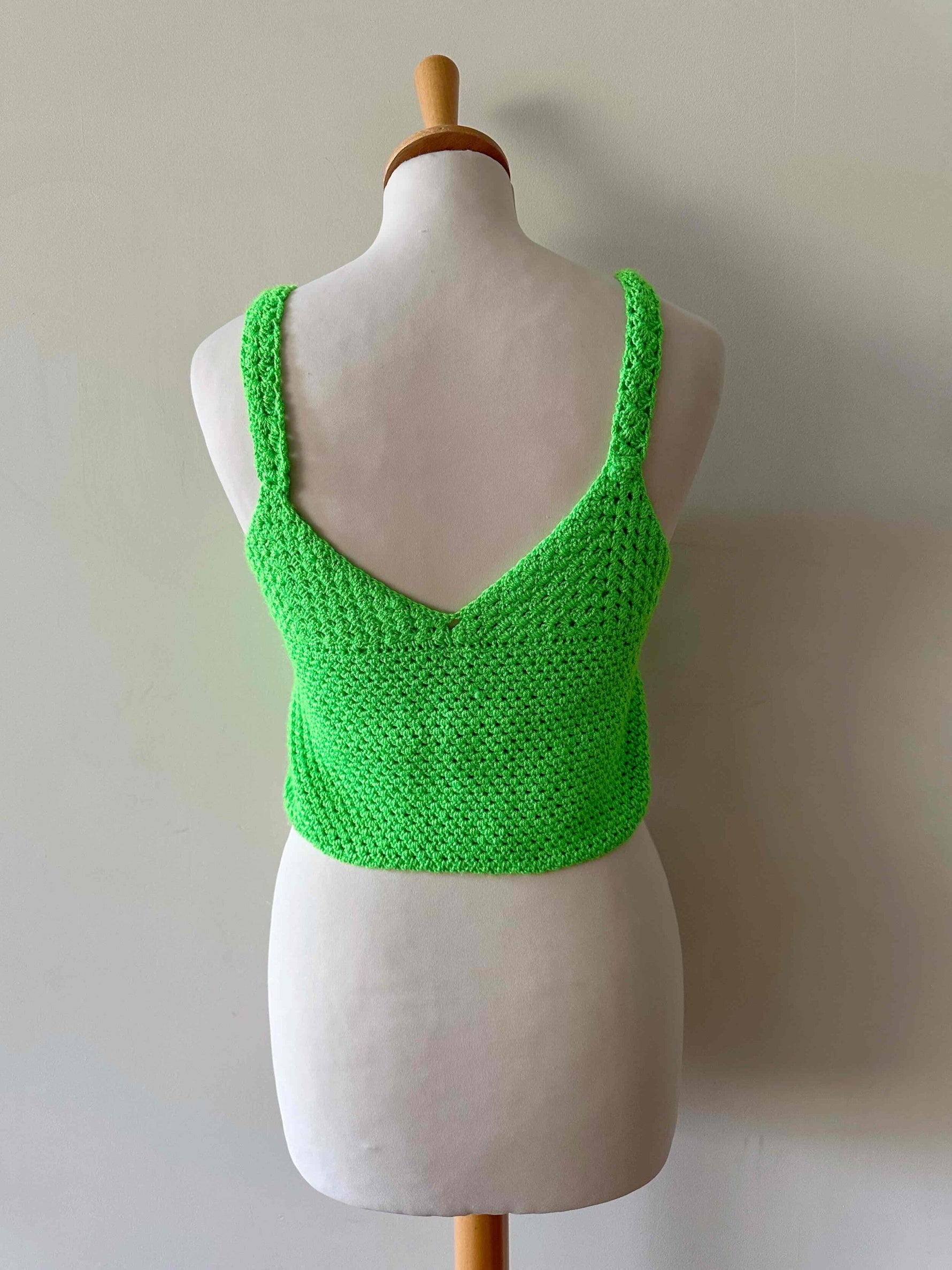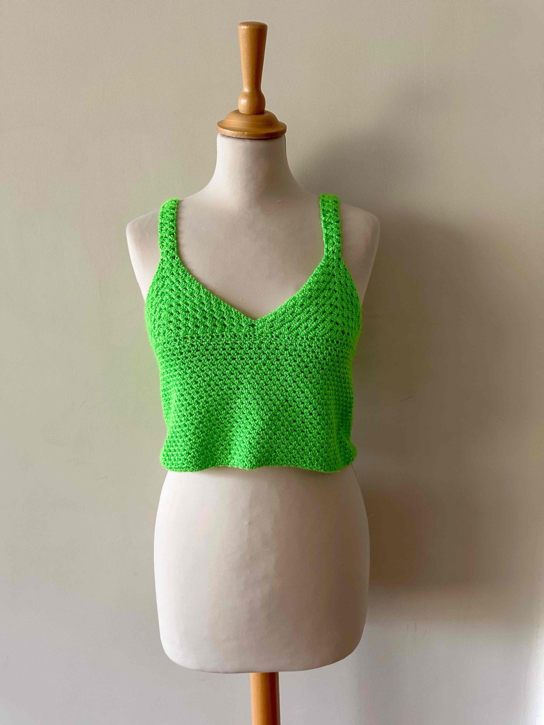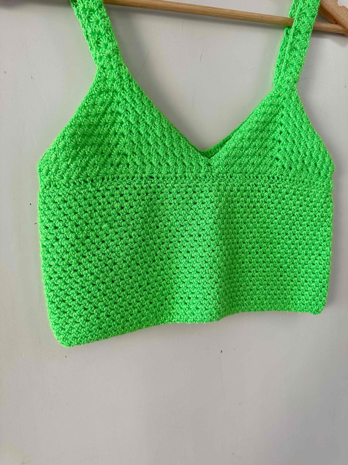 Prix unitaire parCrop top en crochet, crochet de coton lin vert pomme, poitrine en triangle, fait mains, taille 34 et 36 porté ici sur un mannequin T36.
