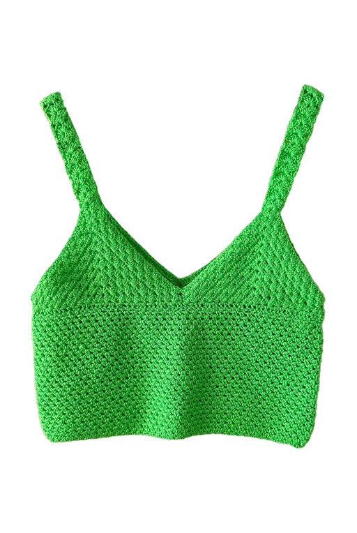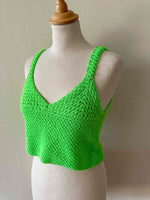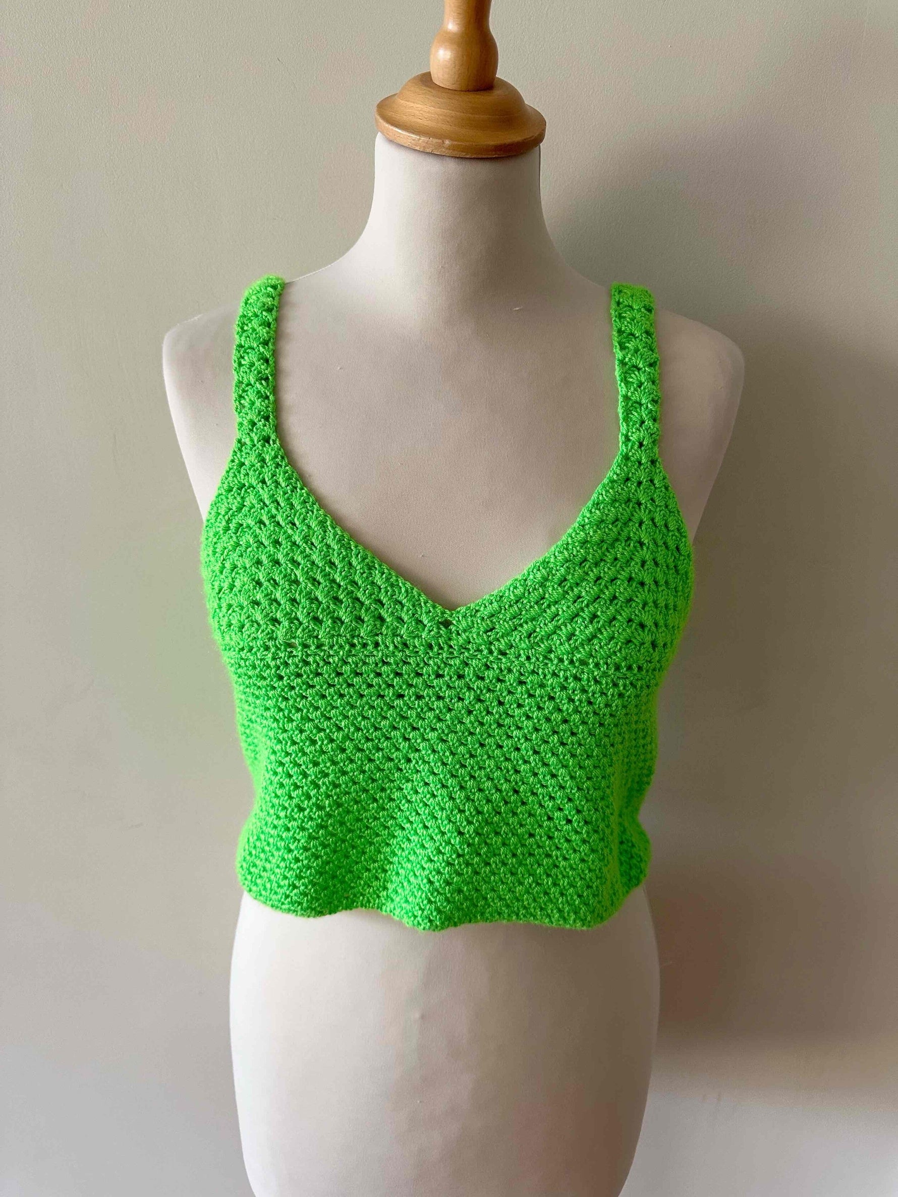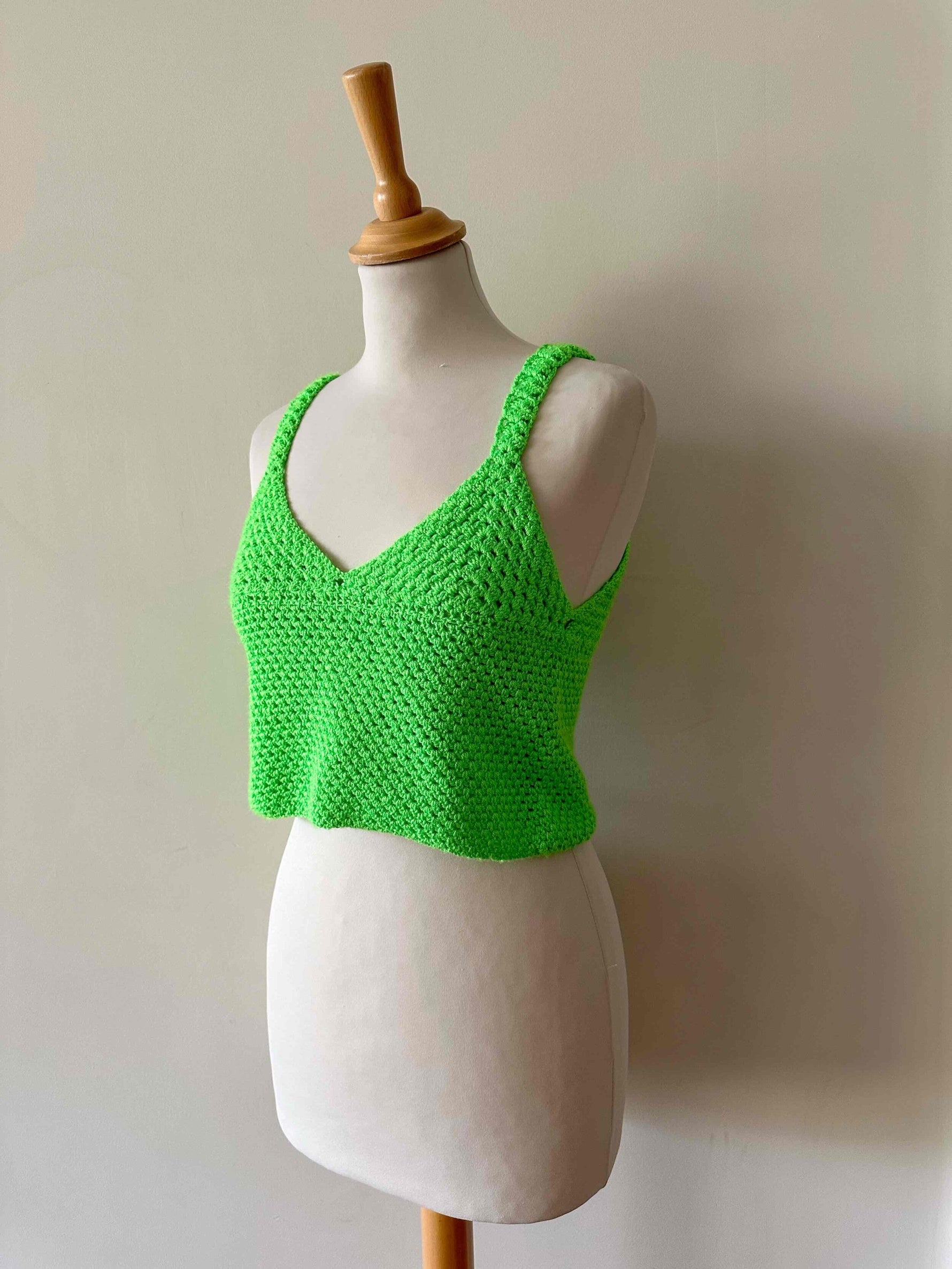 Prix unitaire parCrop top en crochet, crochet de coton lin vert pomme, poitrine en triangle, fait mains, taille 34 et 36 porté ici sur un mannequin T36.