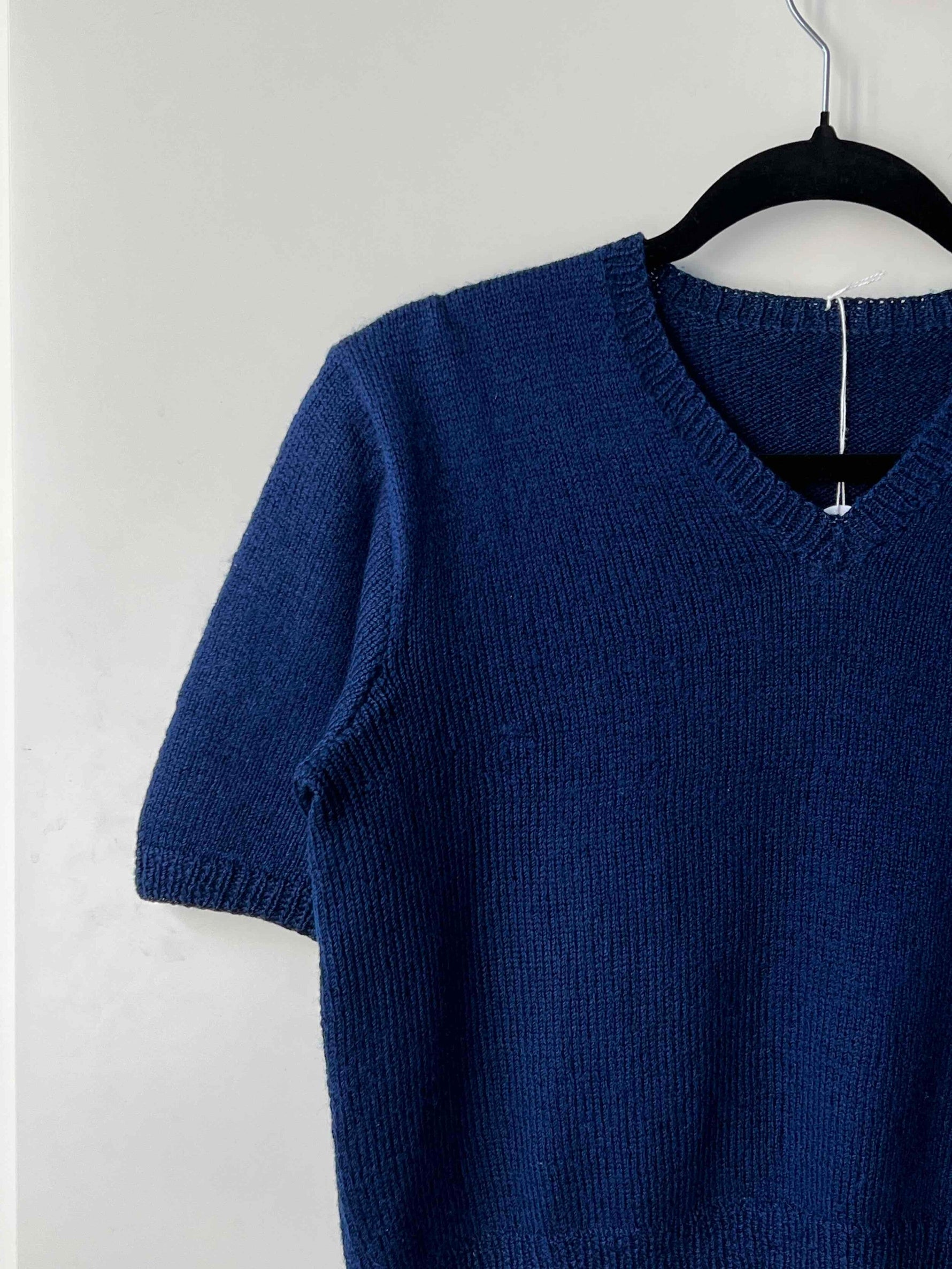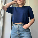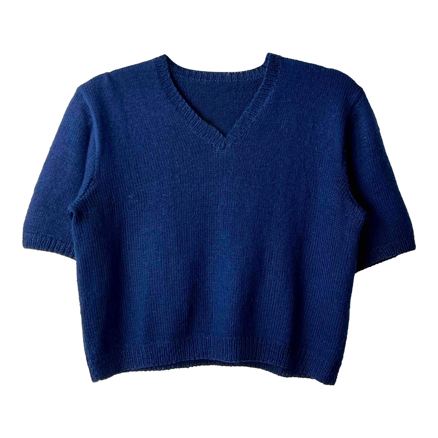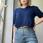Top en maille à manches courtes, coupe crop. Bleu marine. Laine mélangée. Fait main. Esprit petit pull.