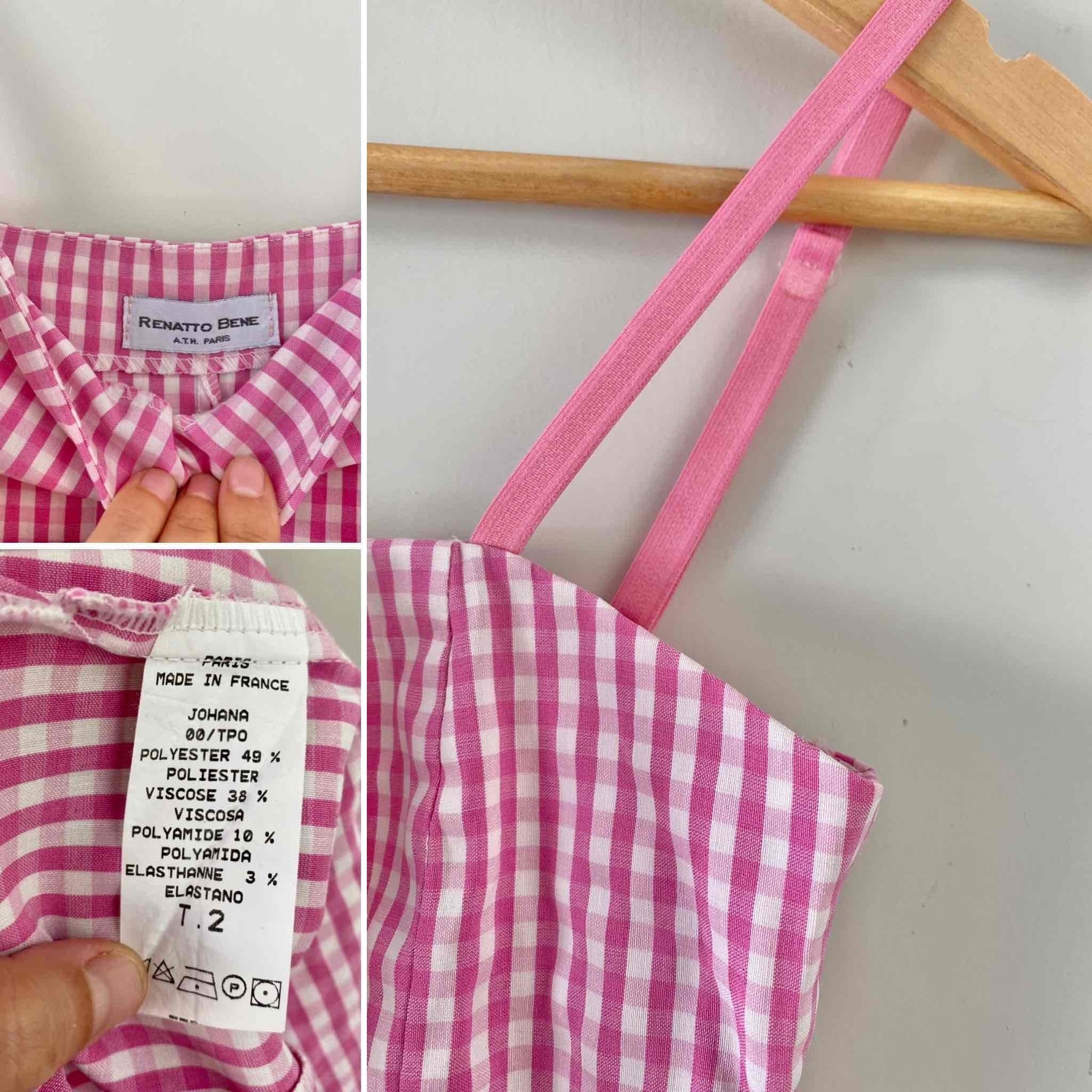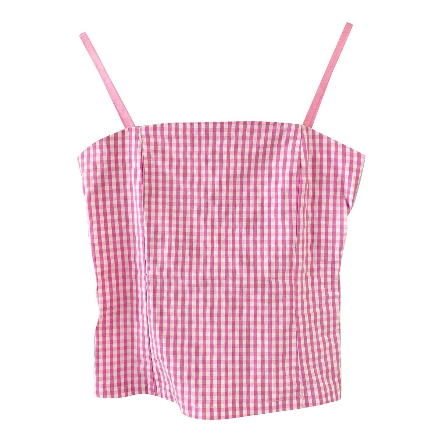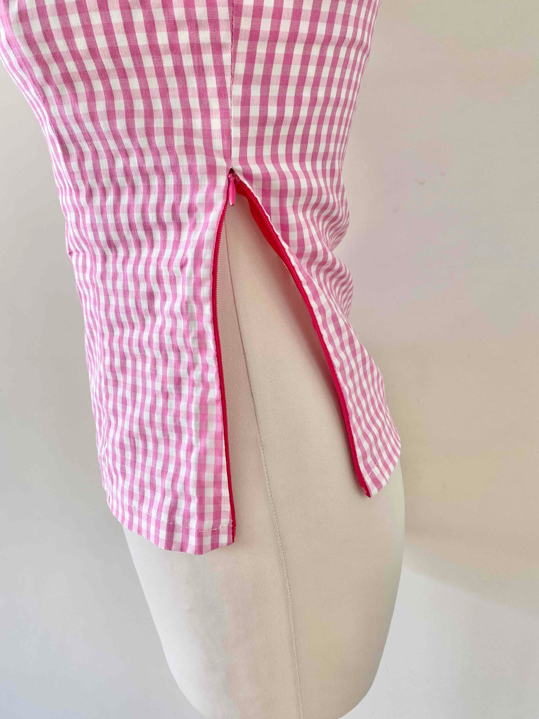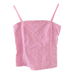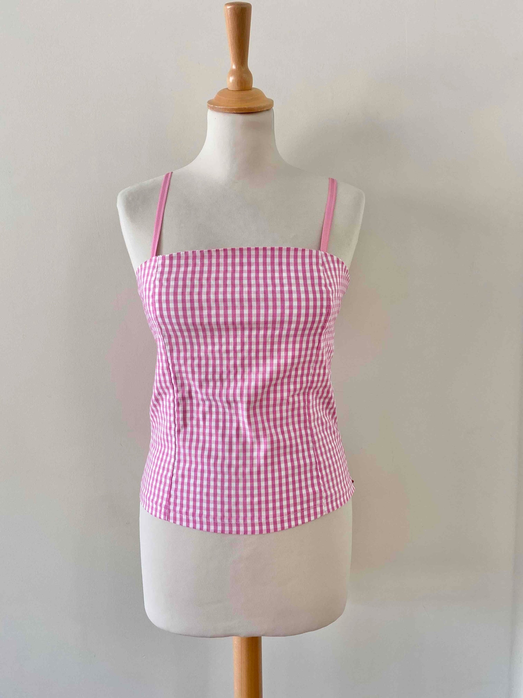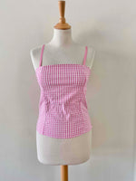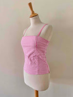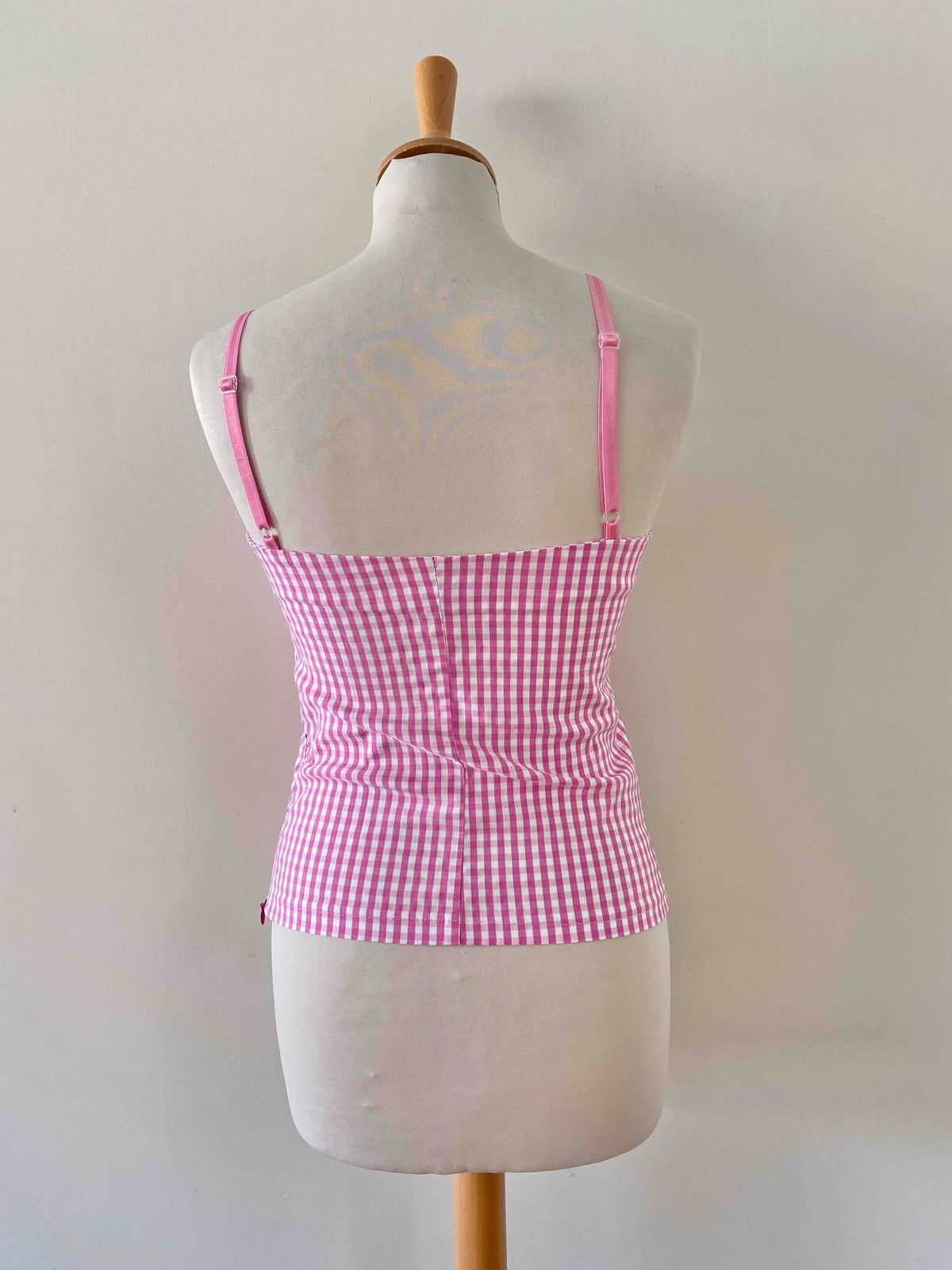 Prix unitaire parCrop top vichy bustier en viscose effet gaufrée à carreaux vichy roses et blancs, bretelles élastiques réglables, fermeture éclaire côté, fabriqué en France, taille 36 porté ici sur un mannequin T36.