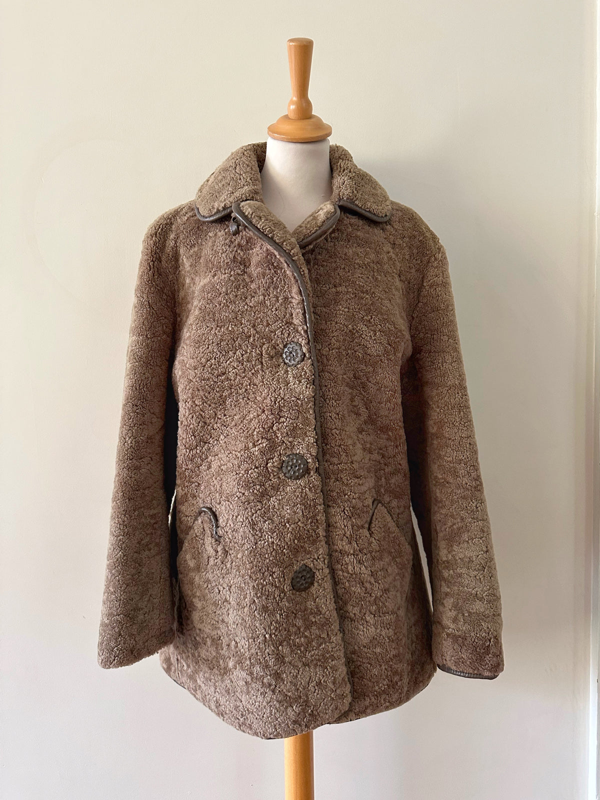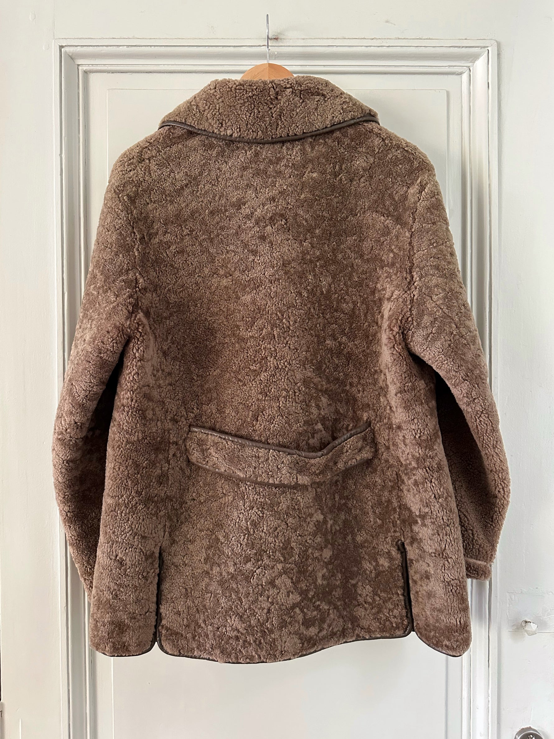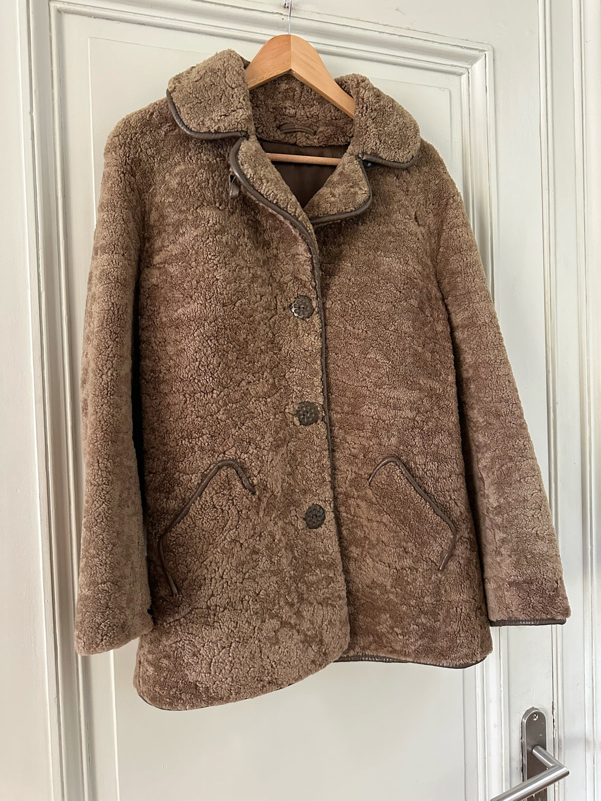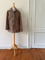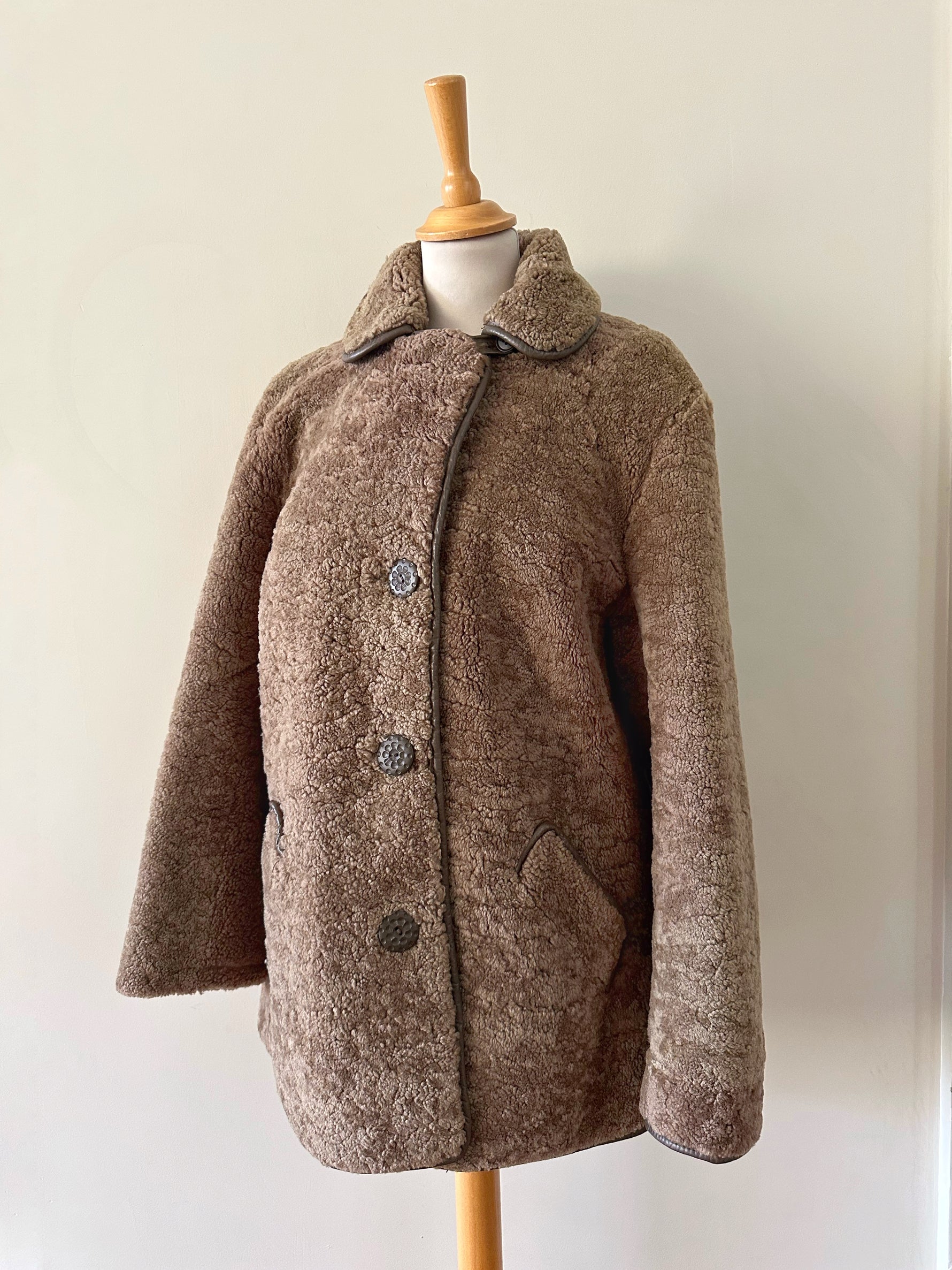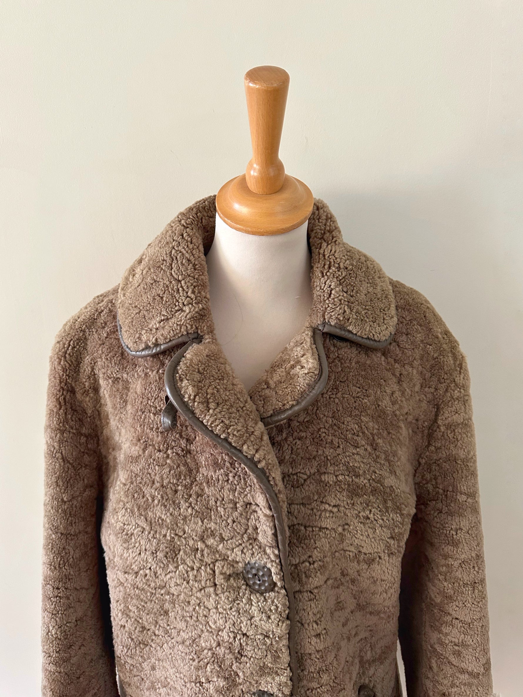 Fourrure de mouton sherpa, agneau retourné marron glacé, gansé de cuir. Forme légèrement trapèze, boutonné, petit col mouton. Années 70s. Taille 36 porté ici sur un mannequin T36. Aisselles 45cm Longueur 75cm.