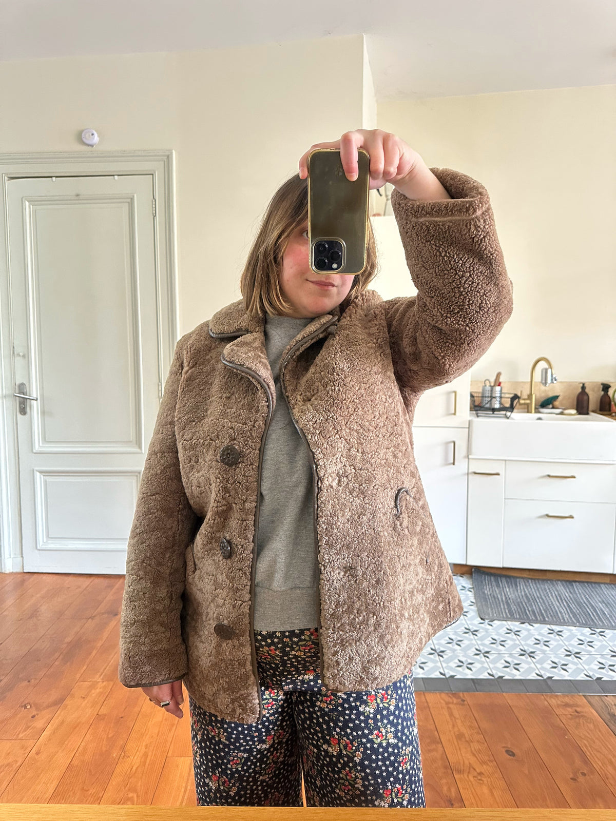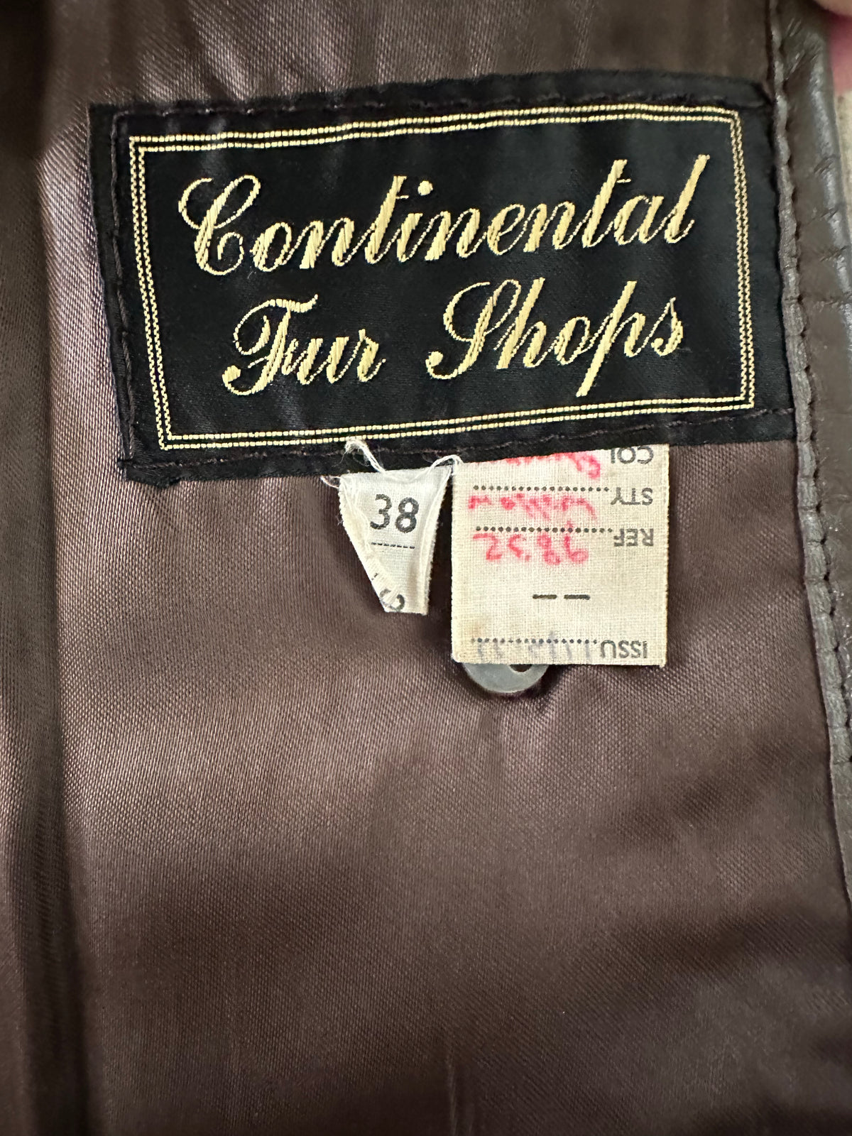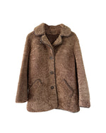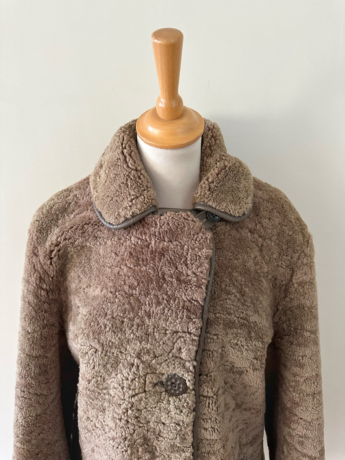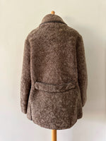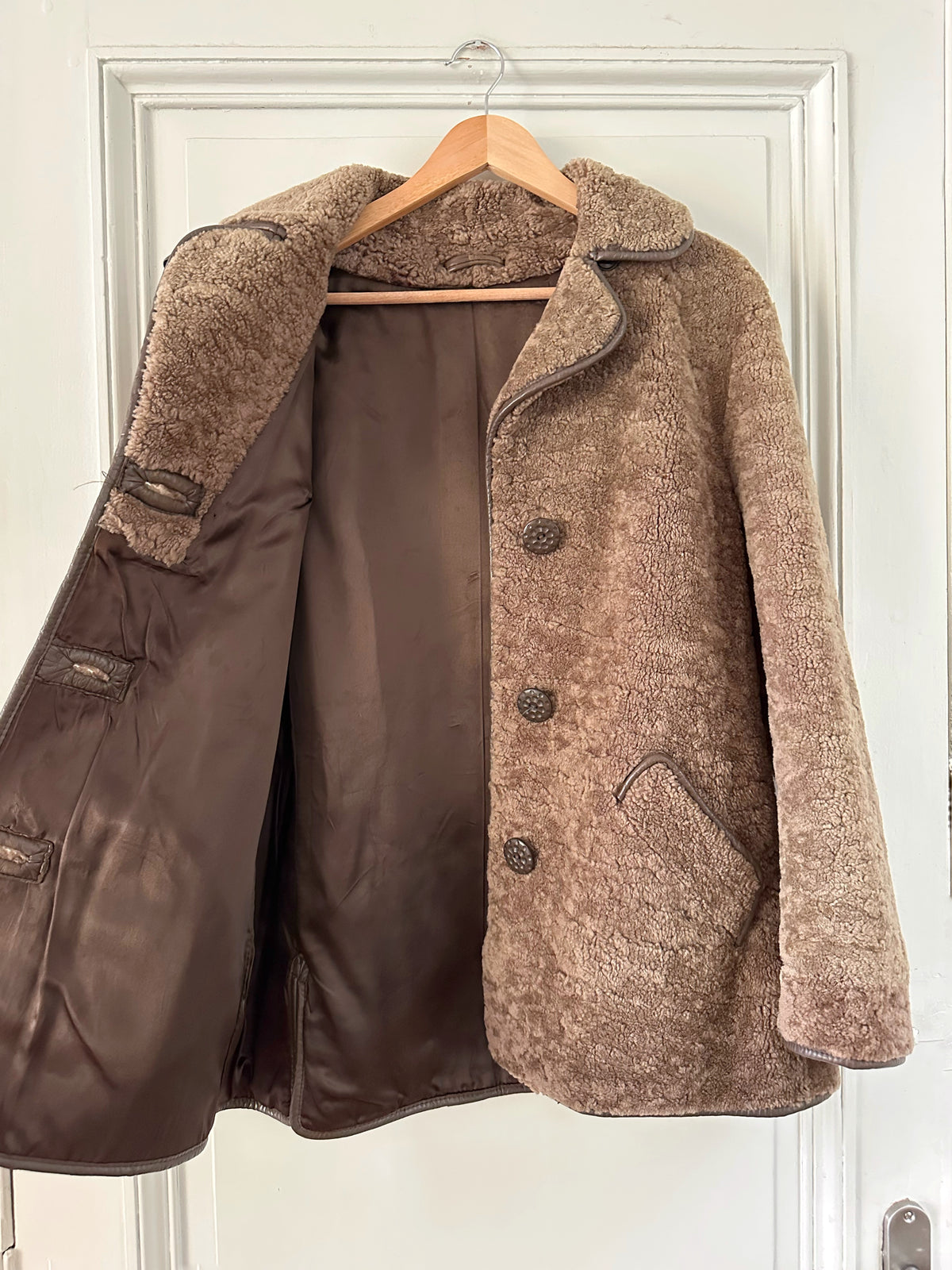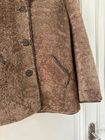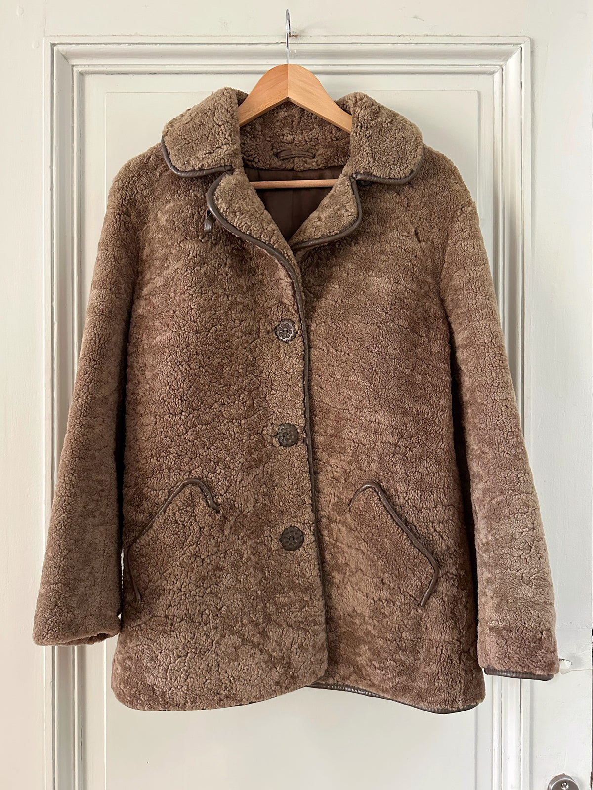 Fourrure de mouton sherpa, agneau retourné marron glacé, gansé de cuir. Forme légèrement trapèze, boutonné, petit col mouton. Années 70s. Taille 36 porté ici sur un mannequin T36. Aisselles 45cm Longueur 75cm.