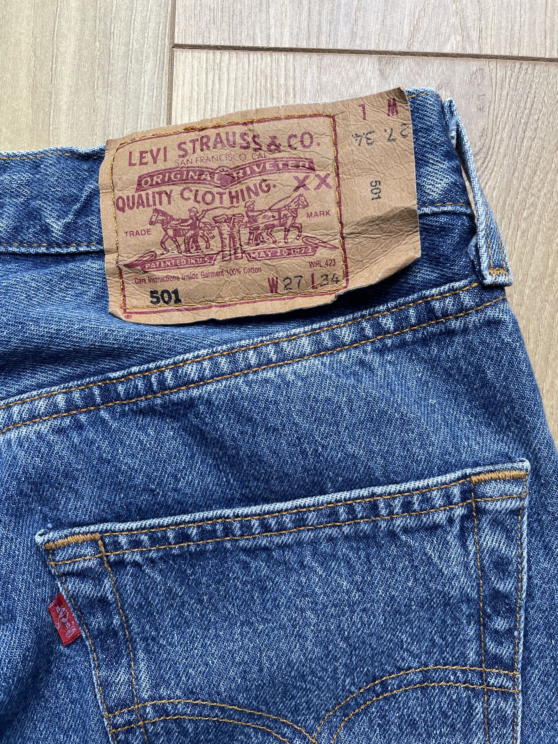 Prix unitaire parJean Levi's 501 vintage 27W 34L d'une qualité premium. Les ourlets sont d’origine. Largeur des hanches : 43cm ; Longueur : 108cm ; Longueur entrejambe : 80cm ; Taille : 35cm Etat : très bon état Couleur : bleu Matière : 100% coton Le colis est emballé et envoyé avec soin (115)