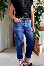 Prix unitaire parJean Levi's W33 L36 Made in France. Denim bleu moyen délavé. Ourlets refaits. Les mesures à plat : Taille 40cm Hanches 53cm Entrejambe 73cm Longueur 96 cm .Porté loose par Patricia qui fait une taille 40