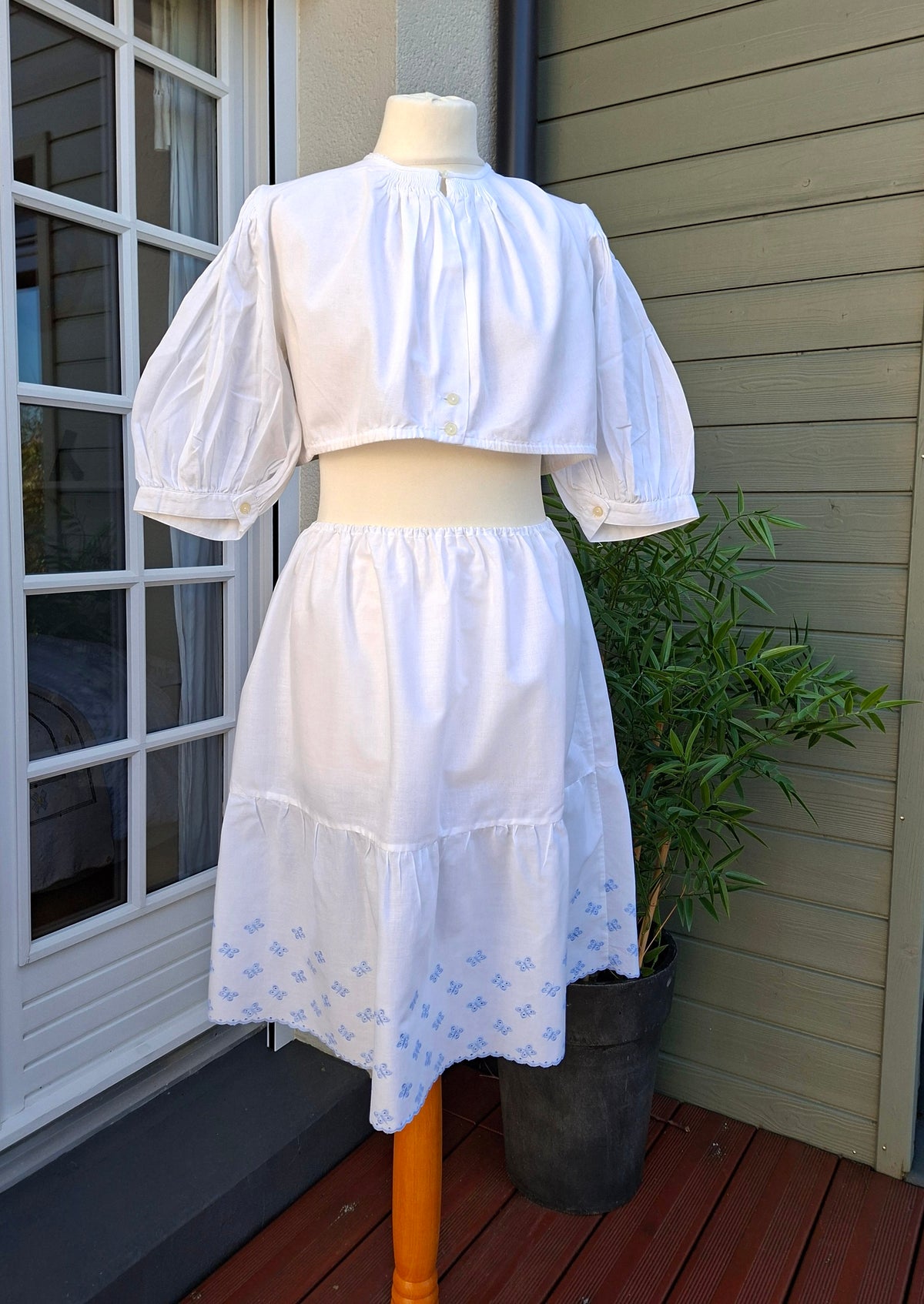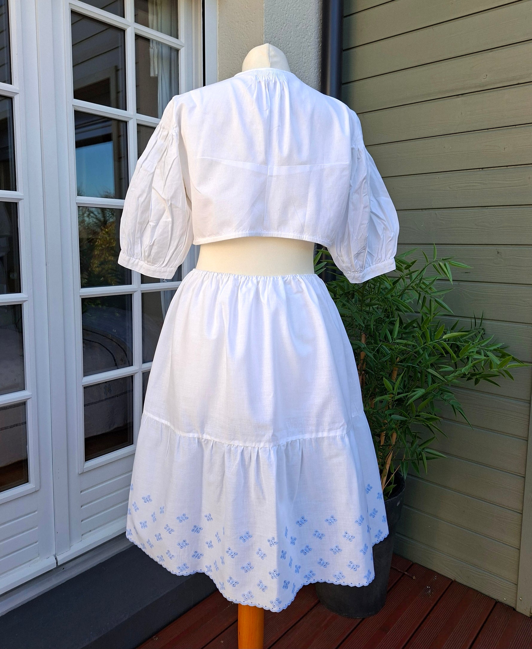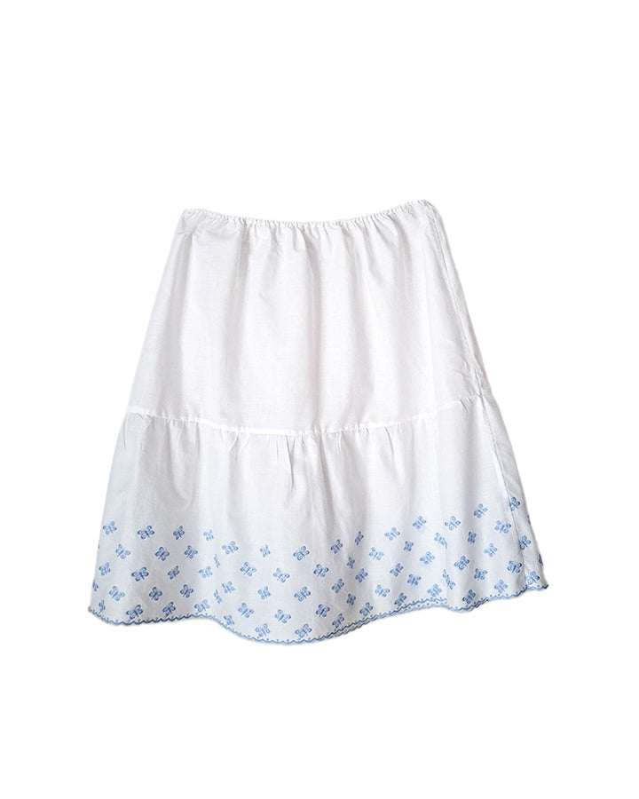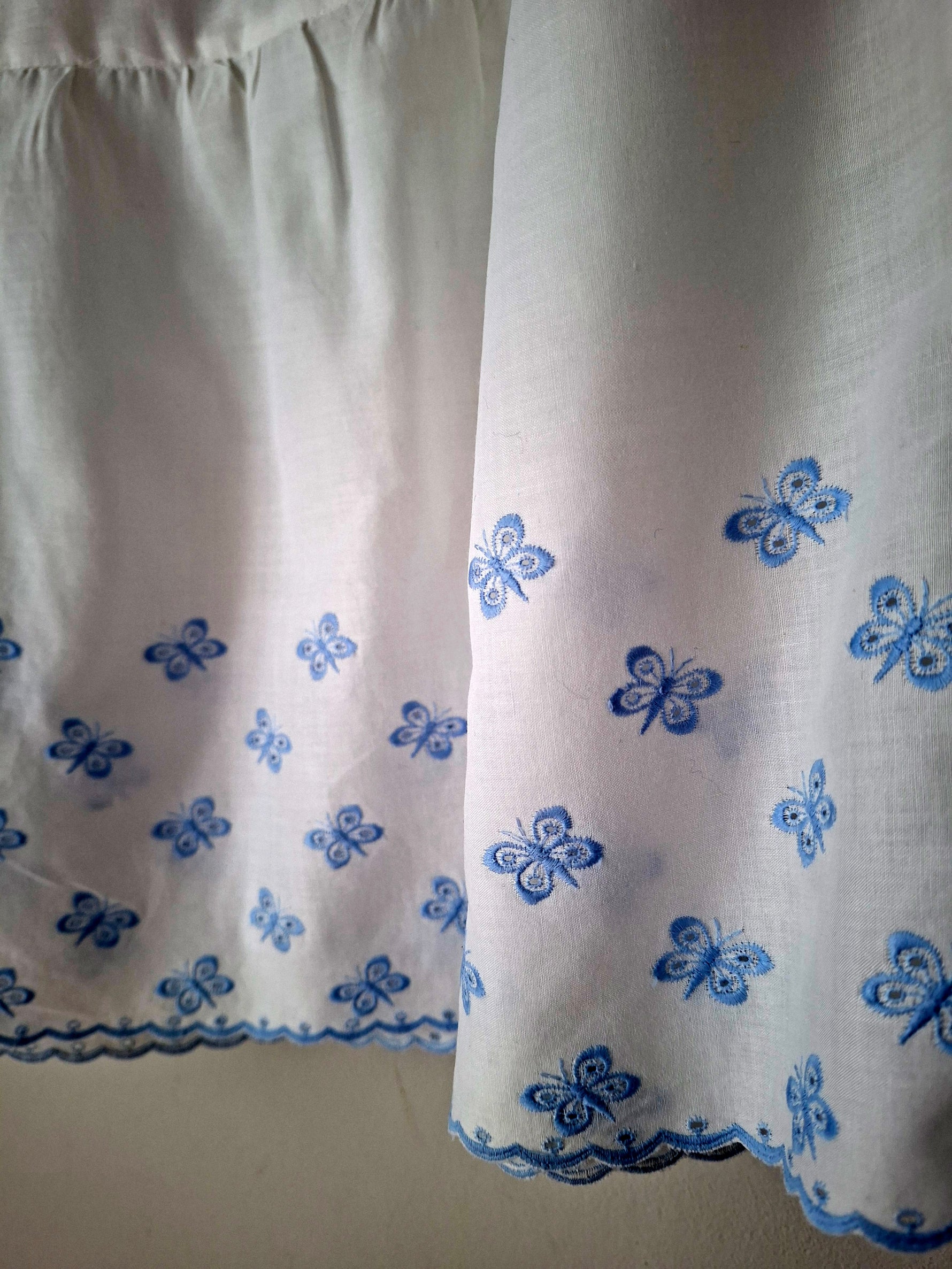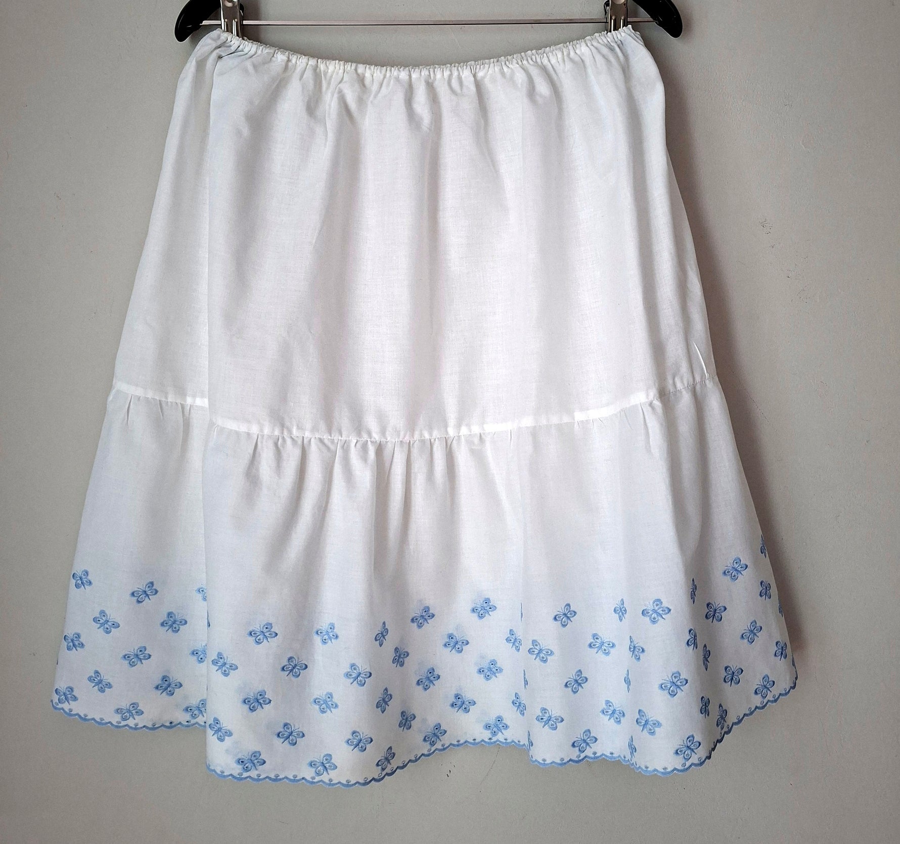 Prix unitaire parJupe brodée en coton et polyester A taille élastiquée (de 30 à 38 cm) Papillons et feston bleus dans le bas A porter de préférence sur un fond de jupe Longueur 57 cm.