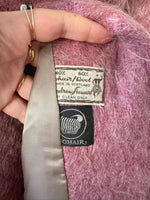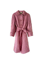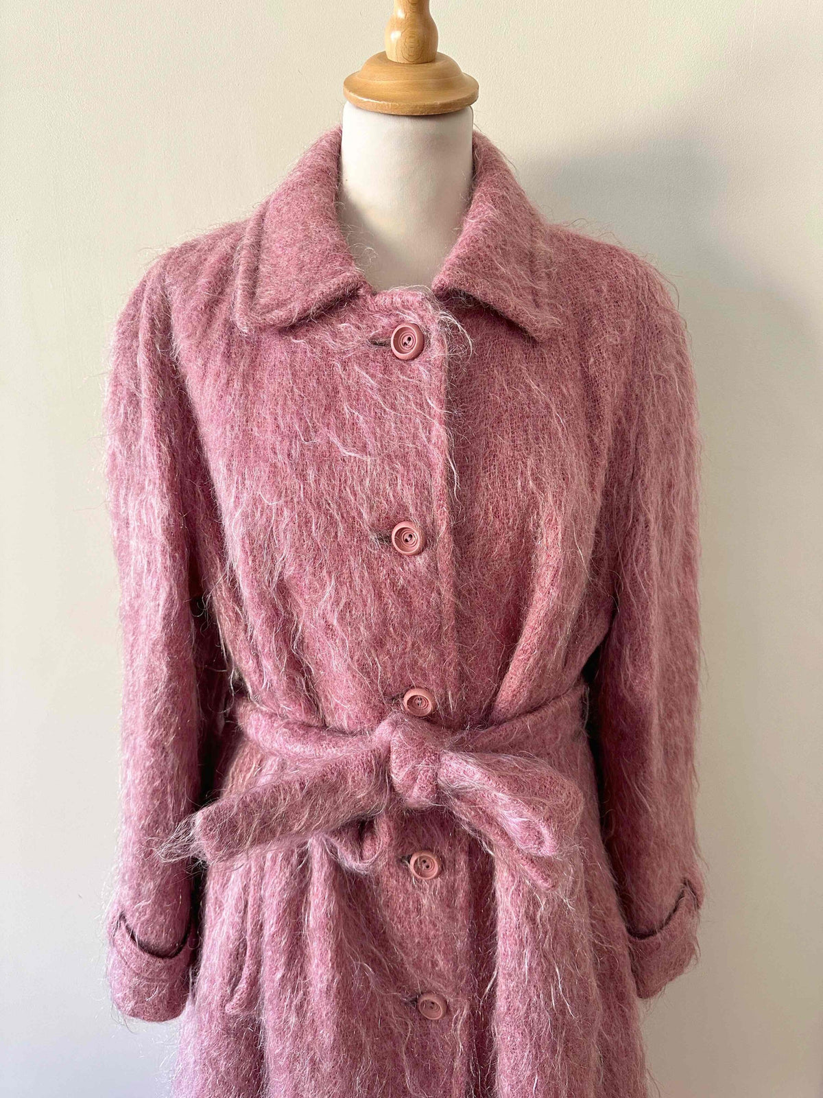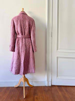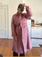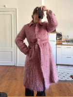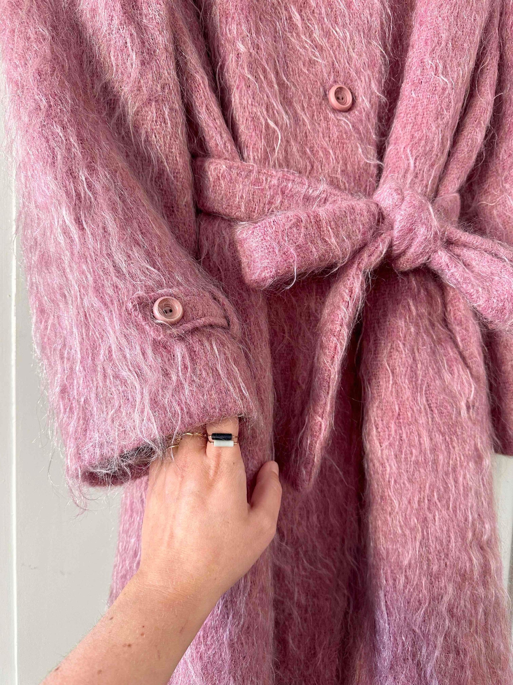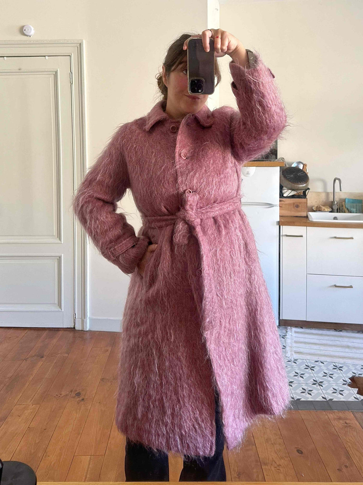 Prix unitaire parManteau en mohair et laine couleur bois de rose, effet fluffy, forme trench avec ceinture à nouer, fabriqué en Écosse, taille 38 porté ici sur un mannequin T36 et serré sur une personne T40.