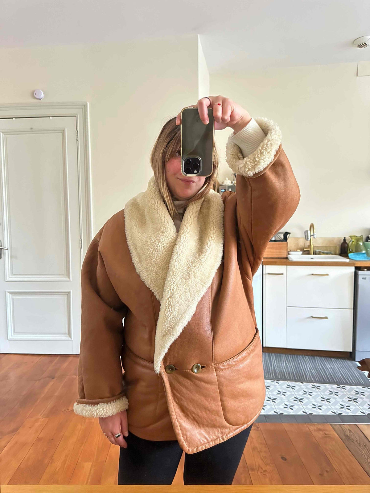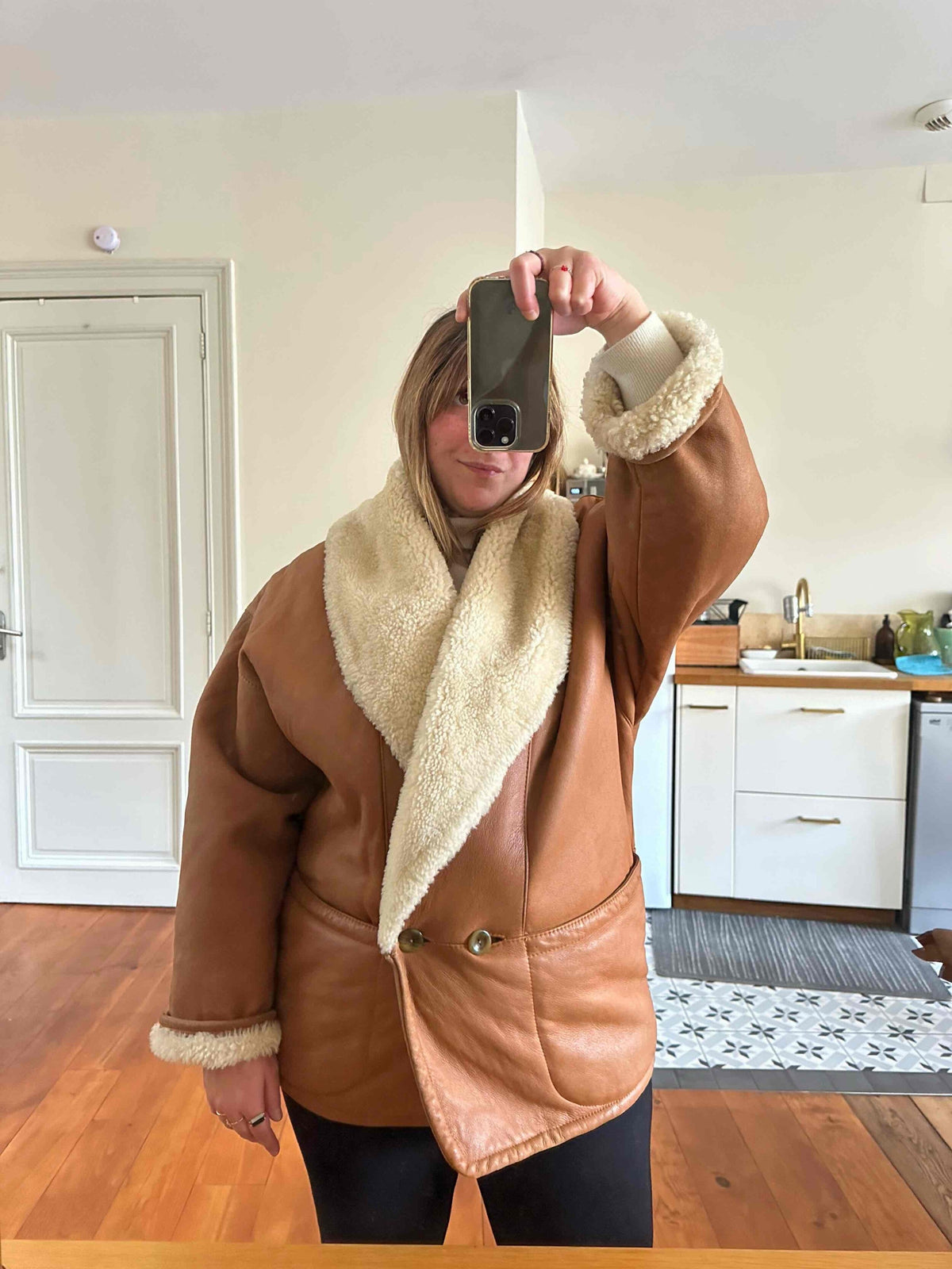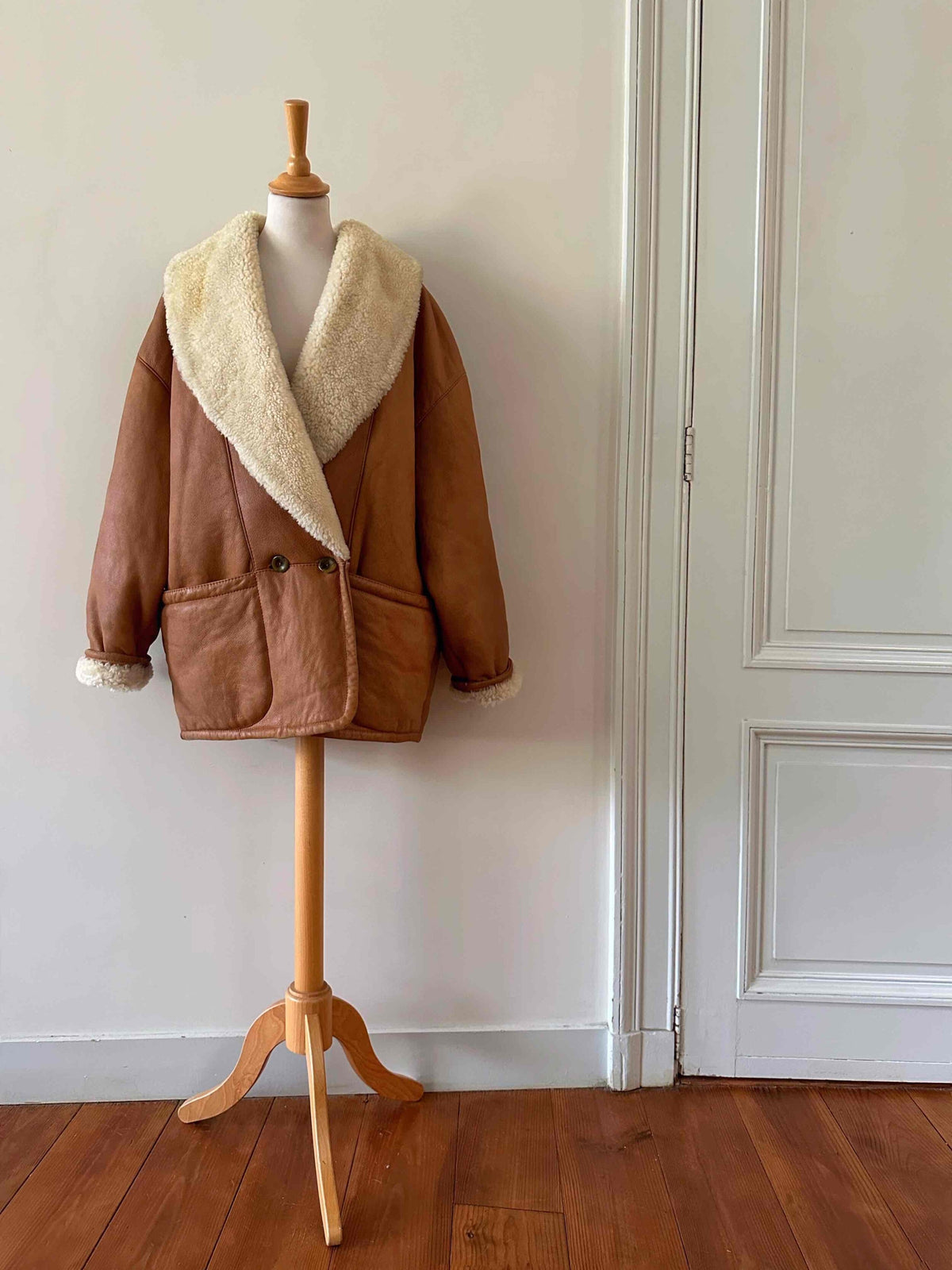 Prix unitaire parPeau lainee en mouton retourné exterieur cuir caramel, interieur laine de mouton ecrue, grand col châle , bohtonnage croisé, fabriqué en Italie, taille 38 porté ici sur un mannequin T36 et serré sur une personne T40.
