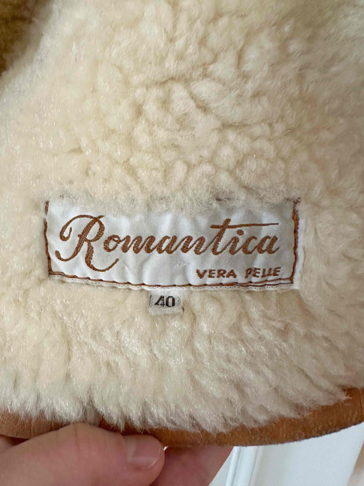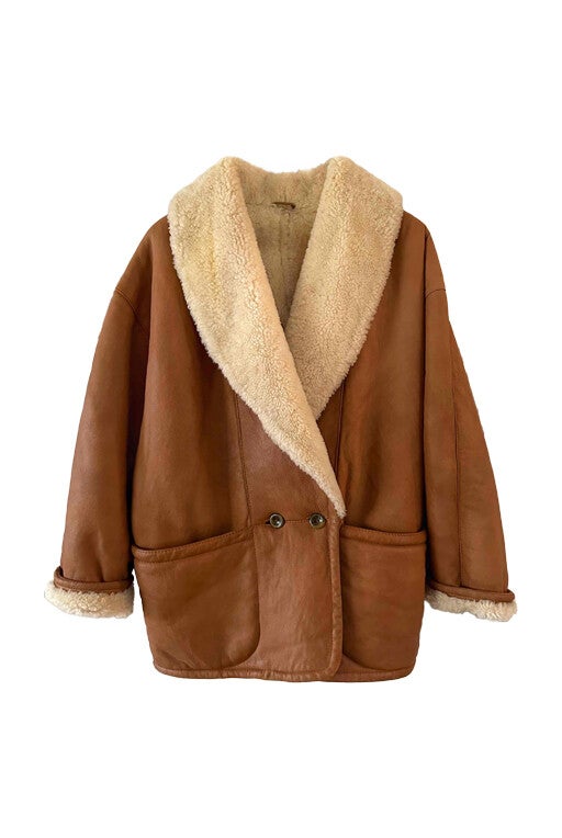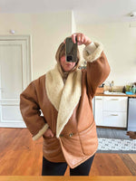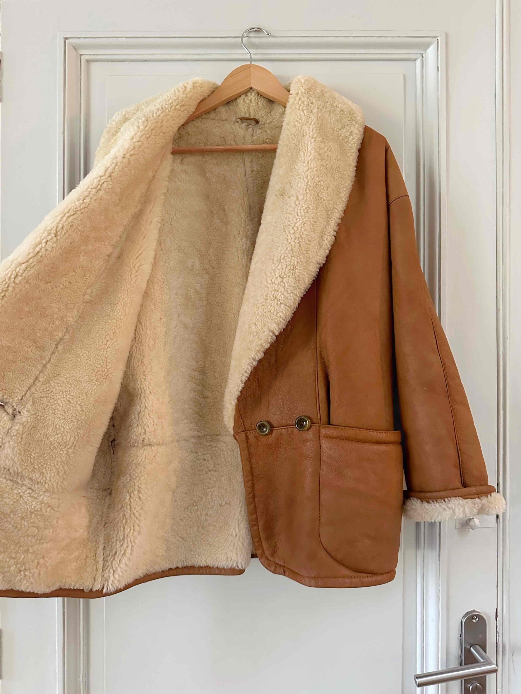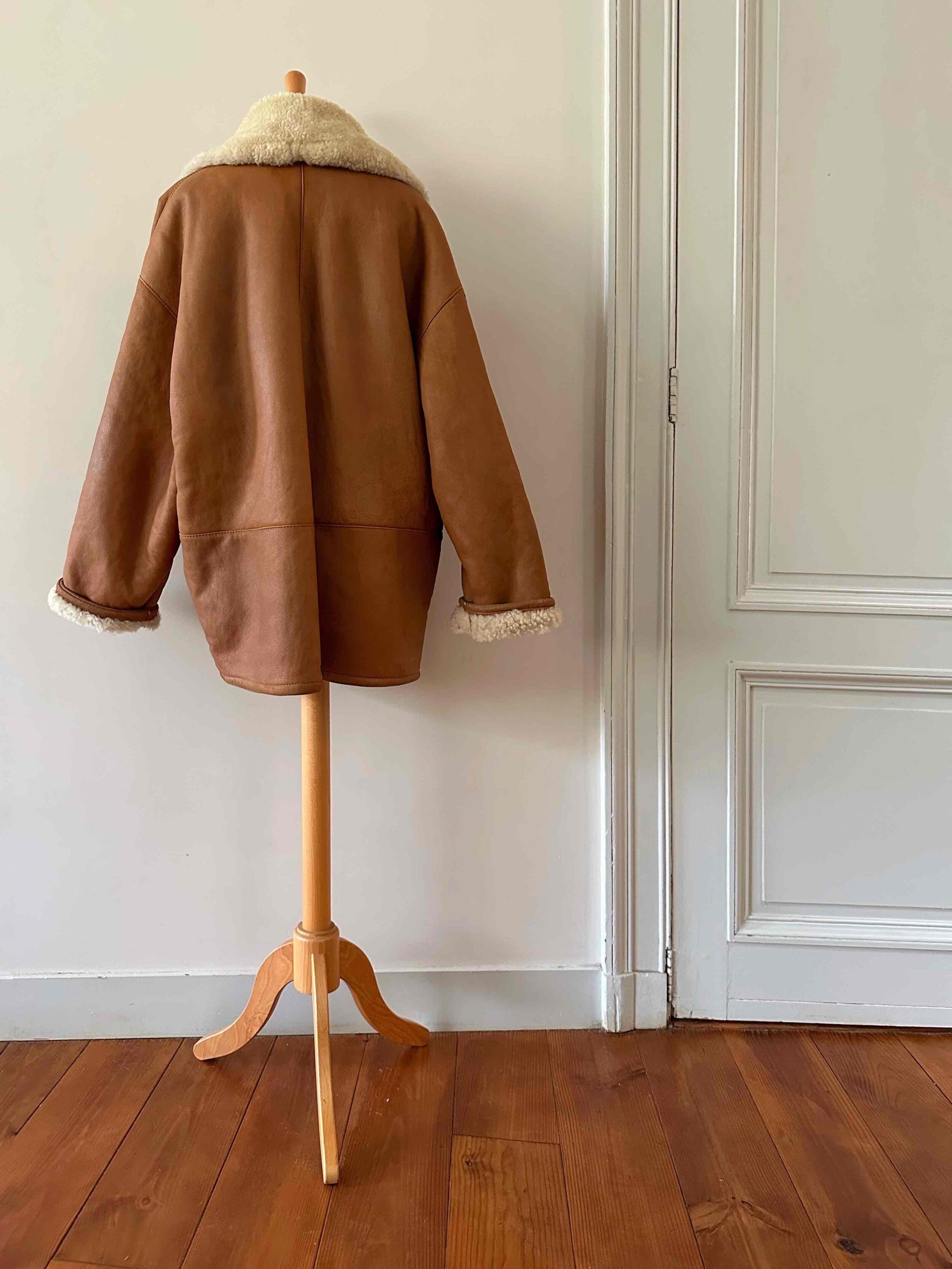 Prix unitaire parPeau lainee en mouton retourné exterieur cuir caramel, interieur laine de mouton ecrue, grand col châle , bohtonnage croisé, fabriqué en Italie, taille 38 porté ici sur un mannequin T36 et serré sur une personne T40.