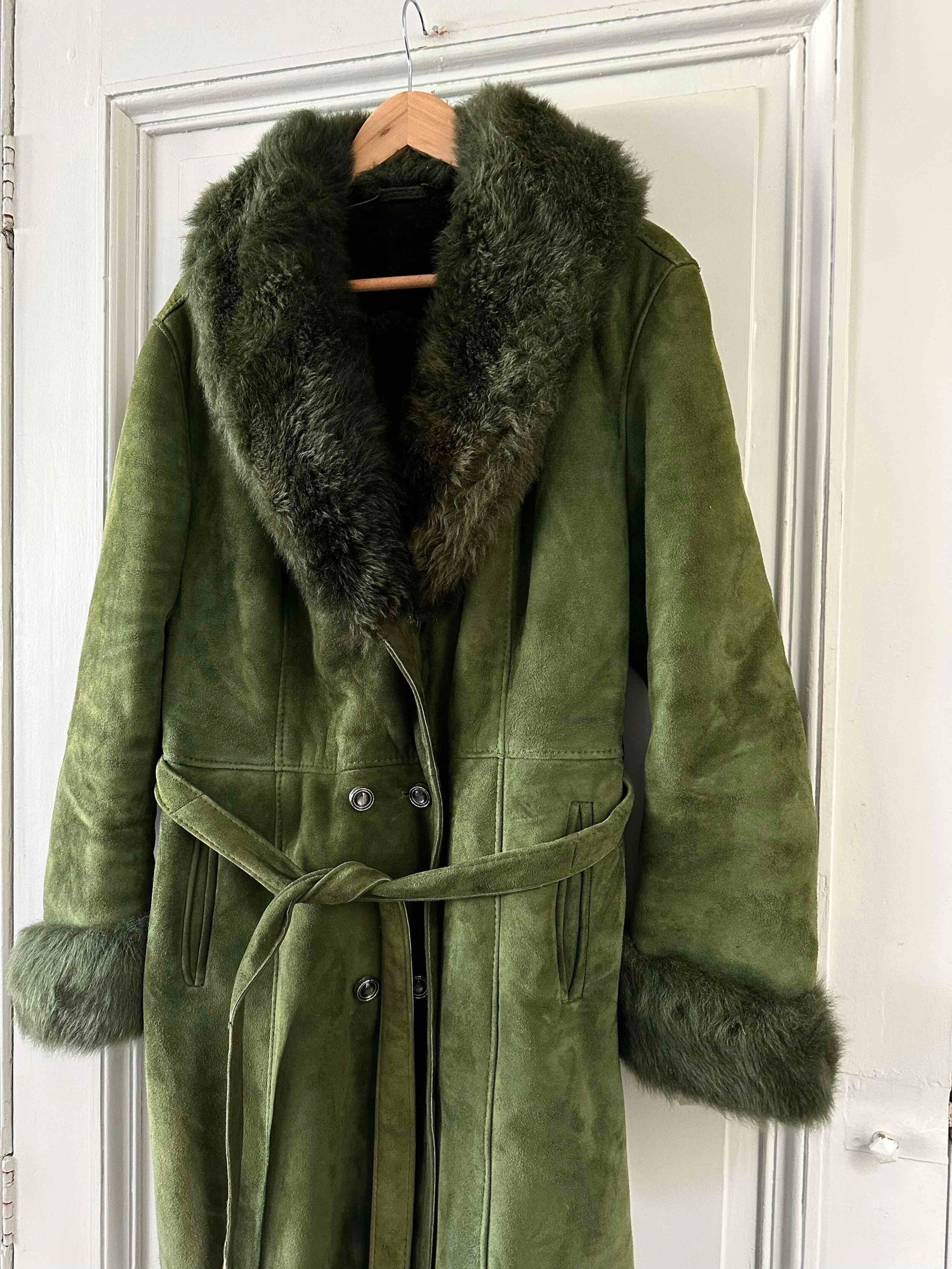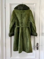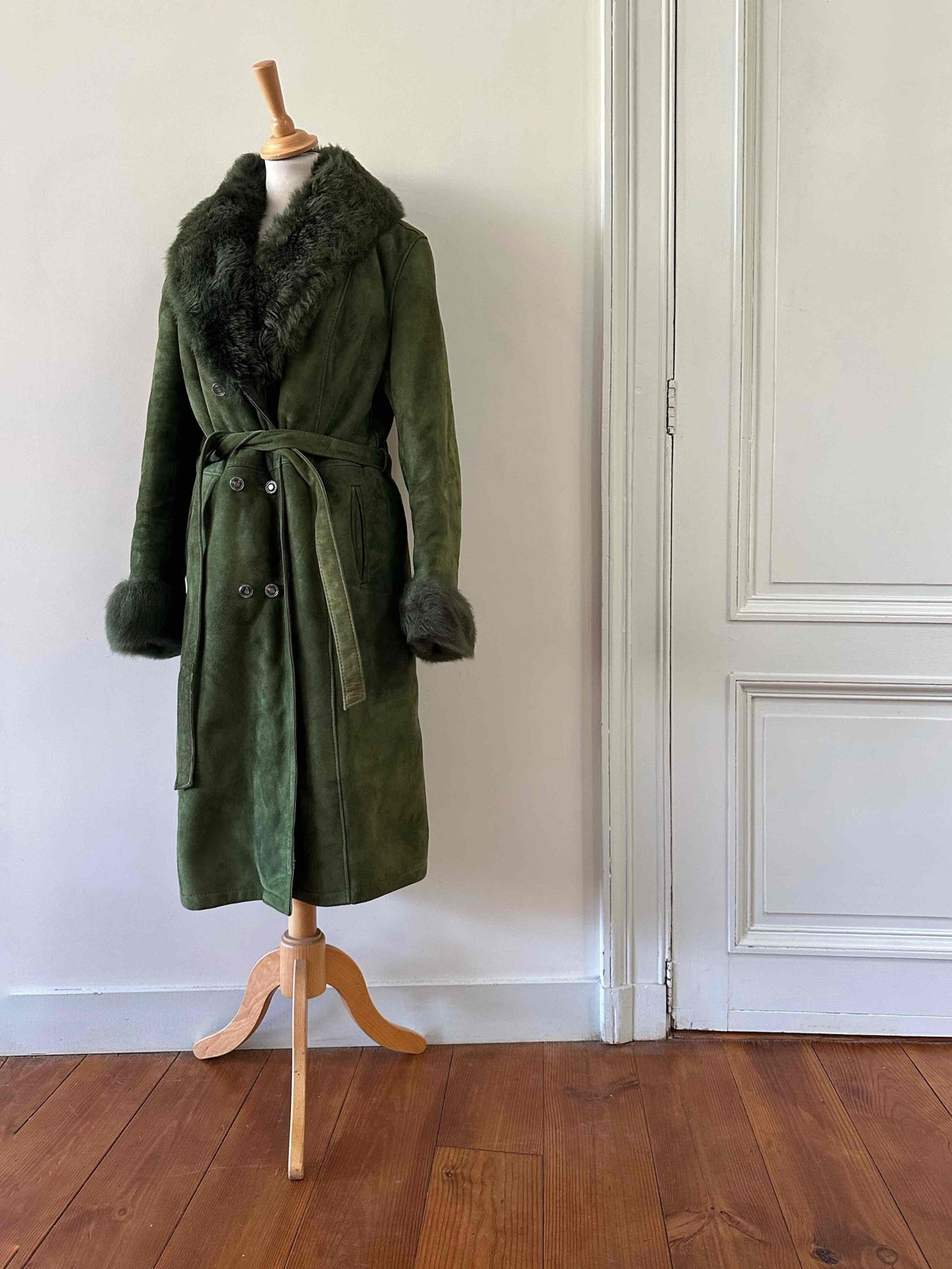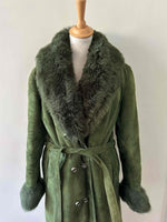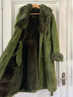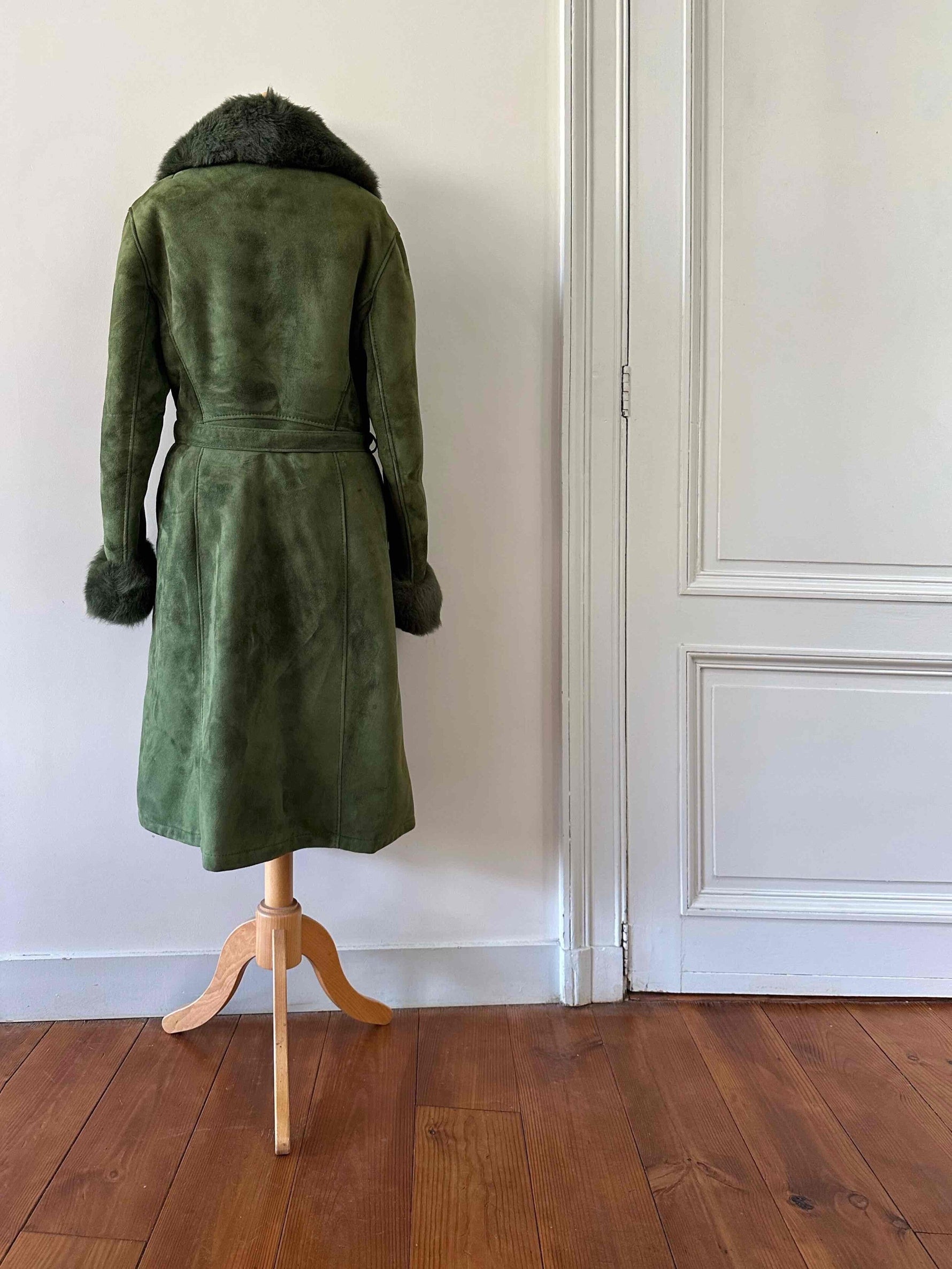 Manteau Penny Lane, peau lainee en mouton retourné exterieur daim vert olive foncé, interieur en laine de mouton verte, col et poignets laine poils longs, ceinture taille à nouer, années 70s, taille 36 porté ici sur un mannequin T36.
