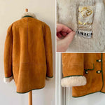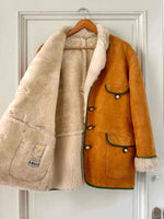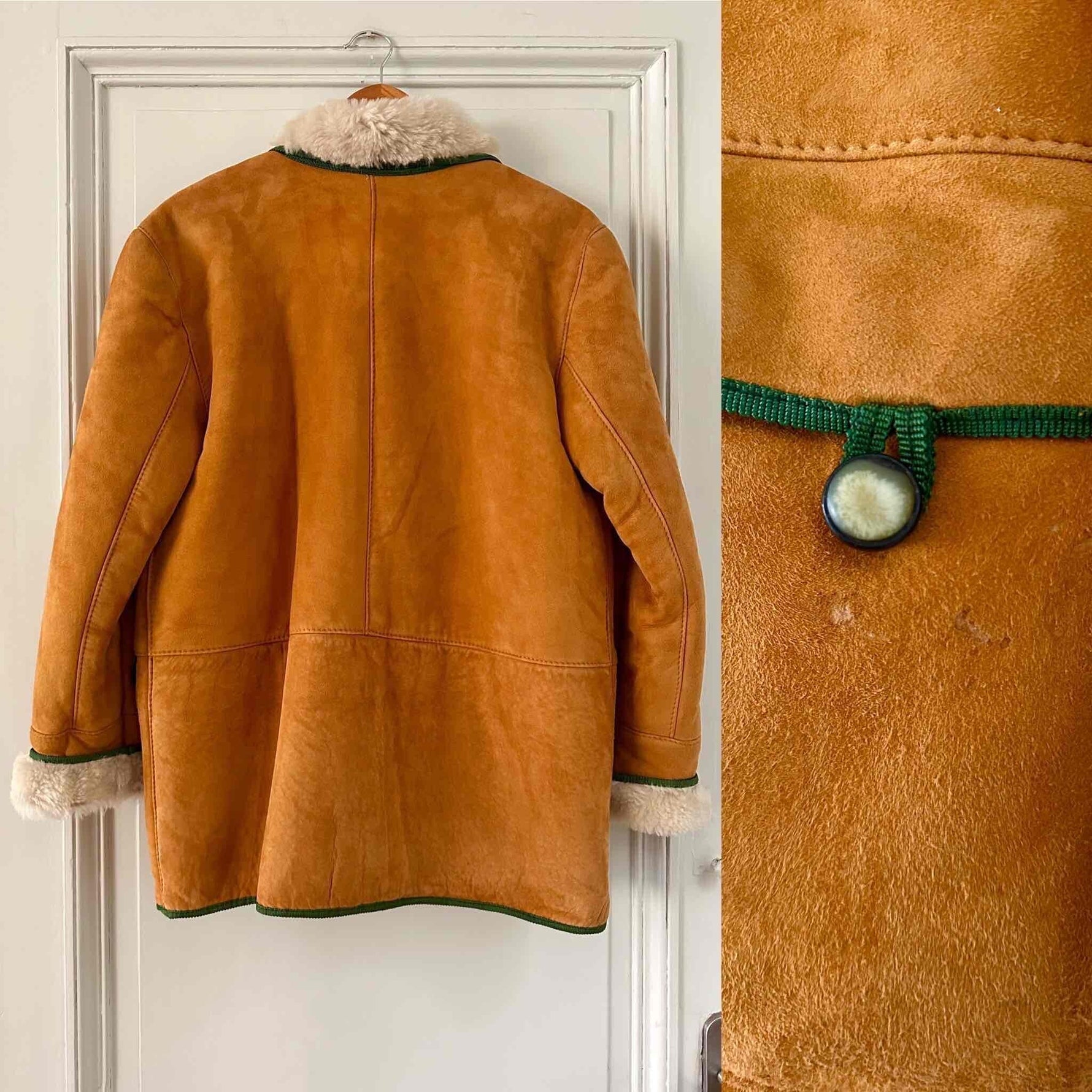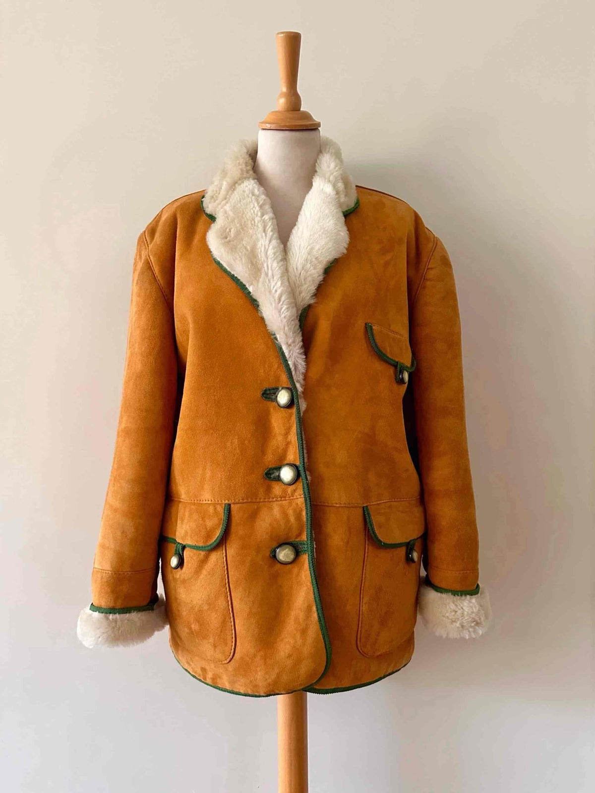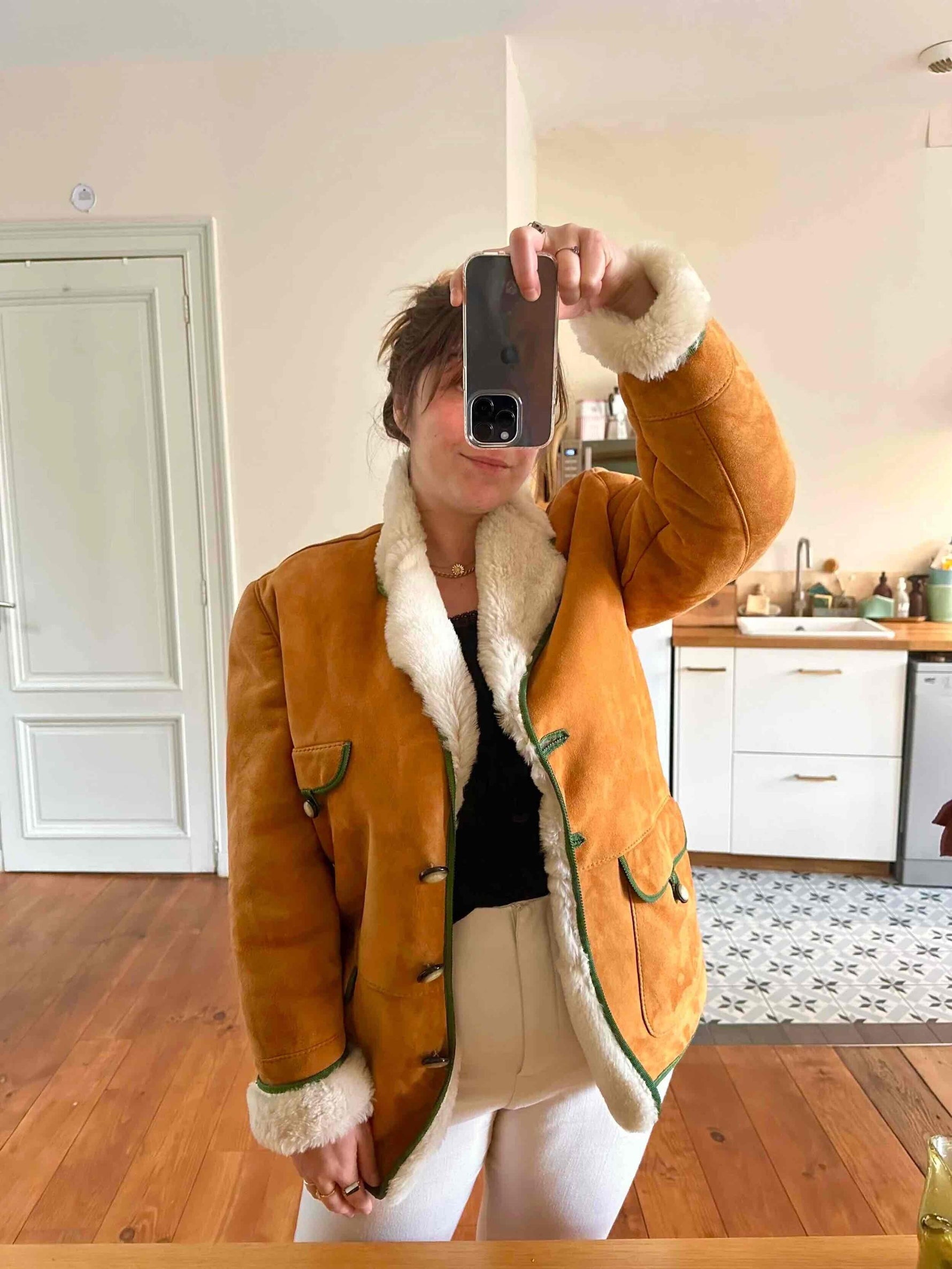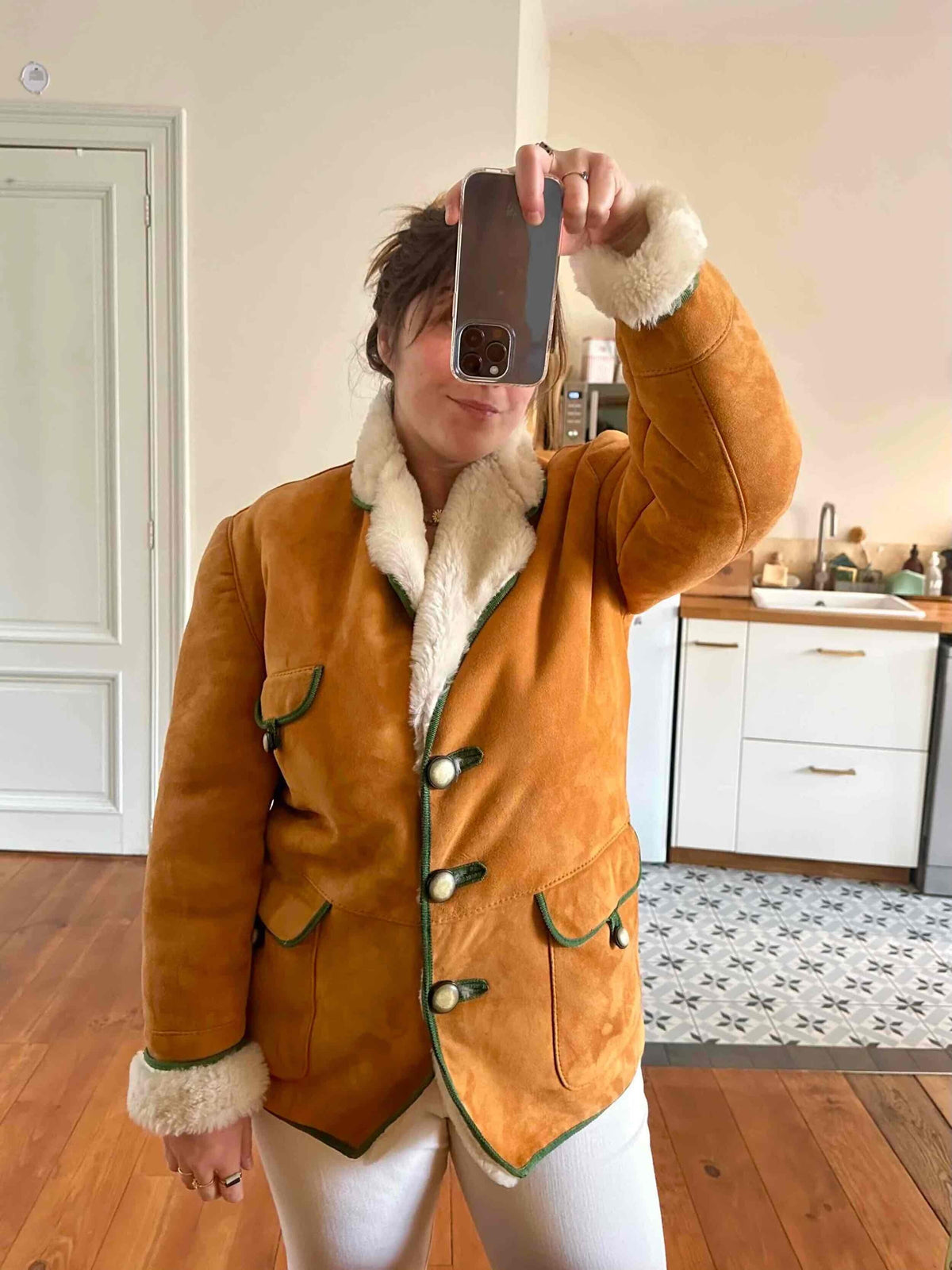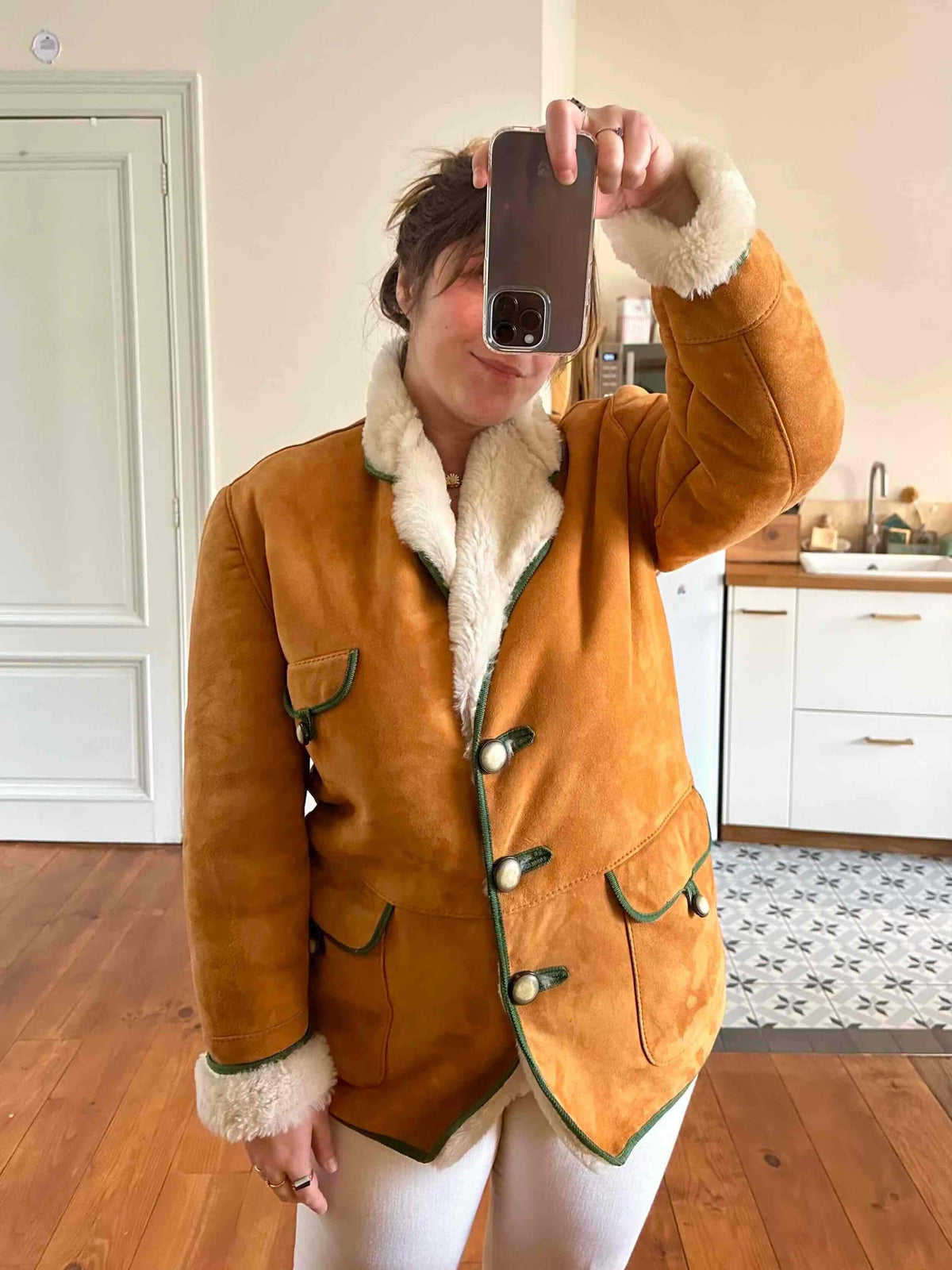 Prix unitaire parPeau lainée en mouton retourné extérieur daim cognac fauve, détails gansés verts, intérieur mouton écru, boutonné, fabriqué en Italie, convient aux tailles 36 et 38, porté ici sur un mannequin T36 et serré sur une personne T40.