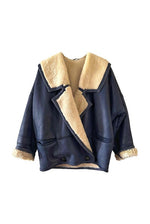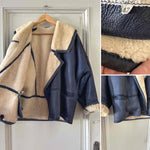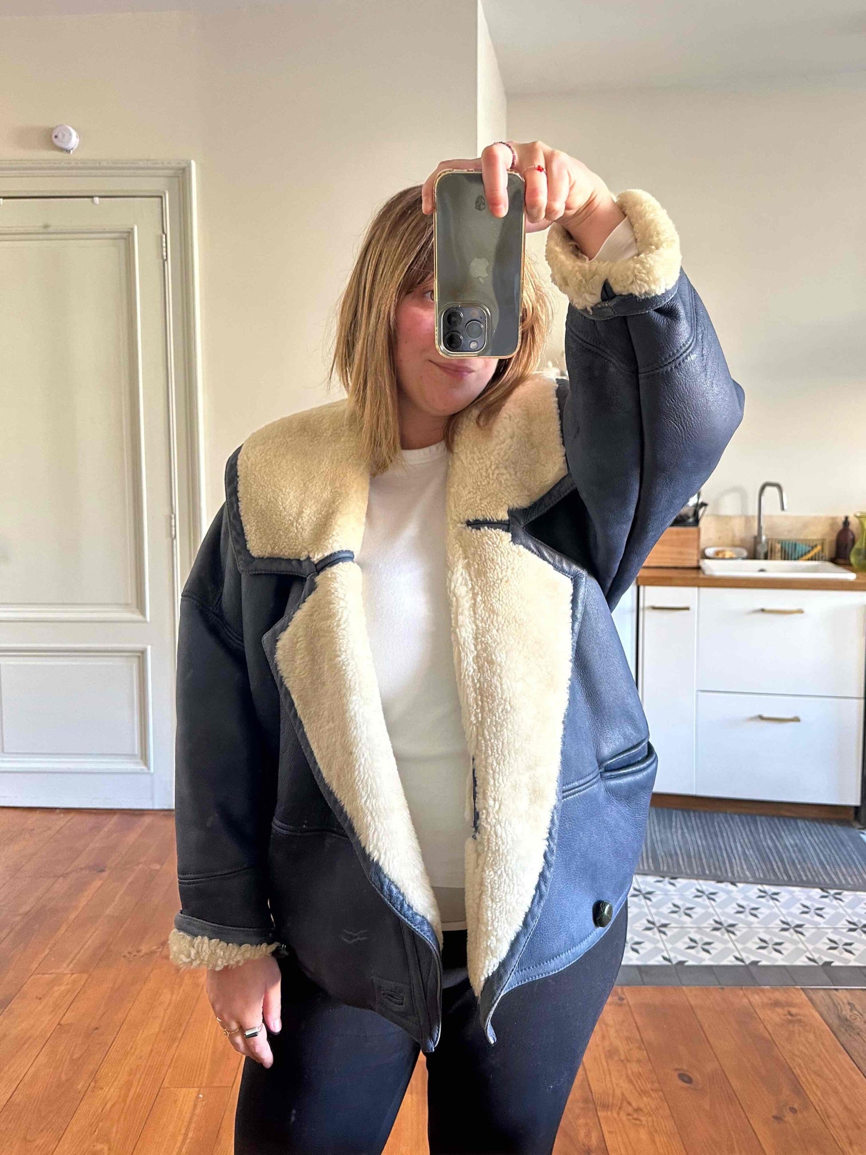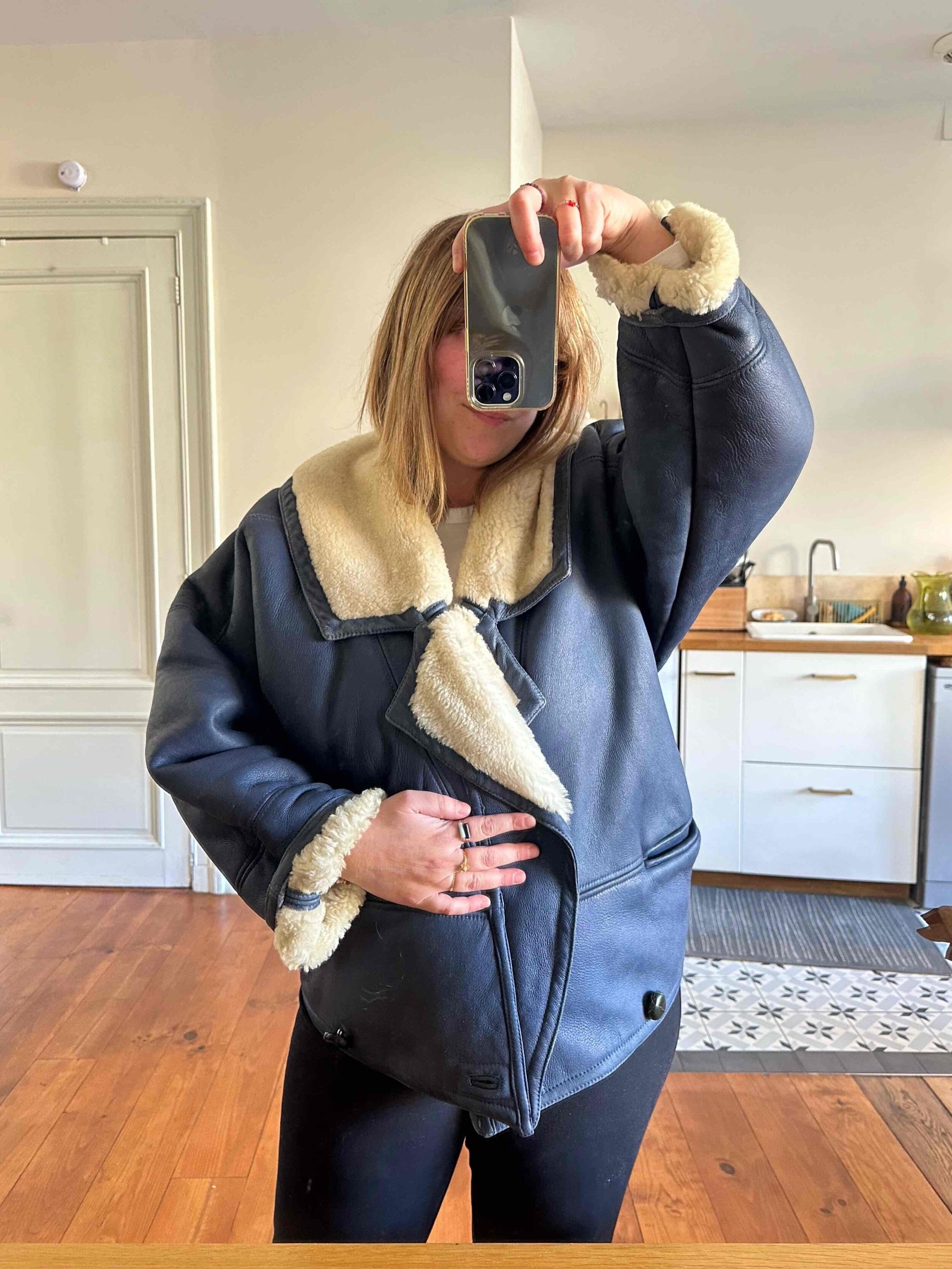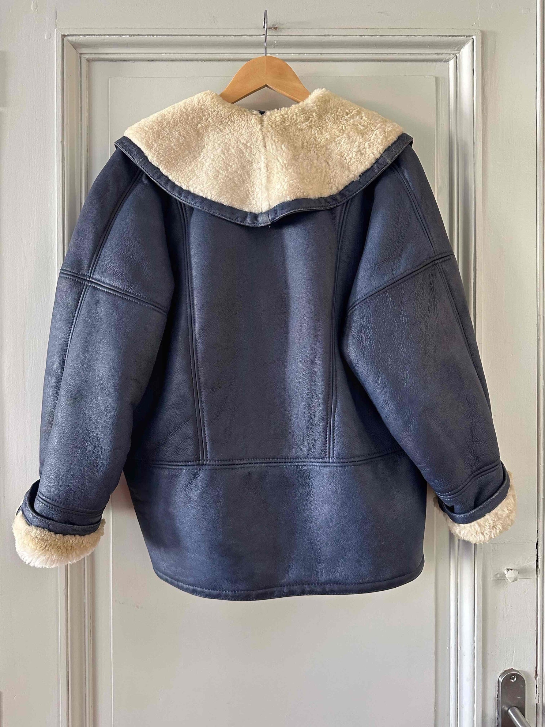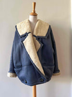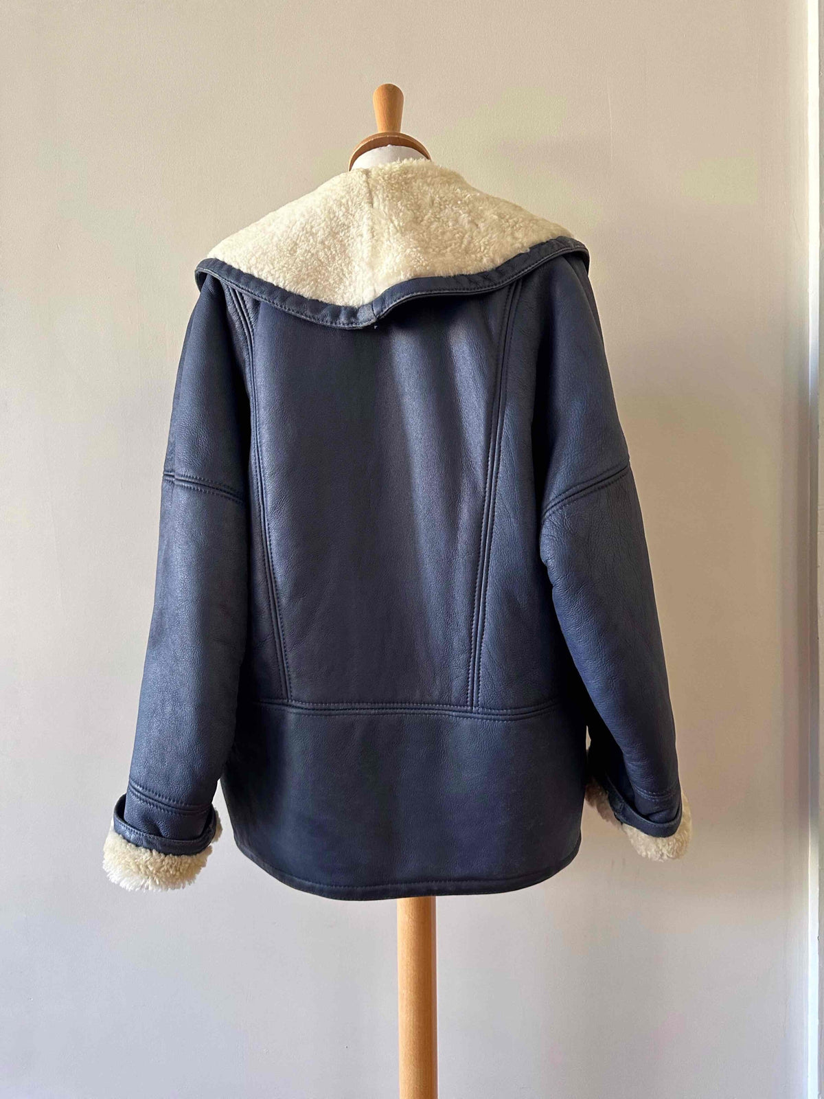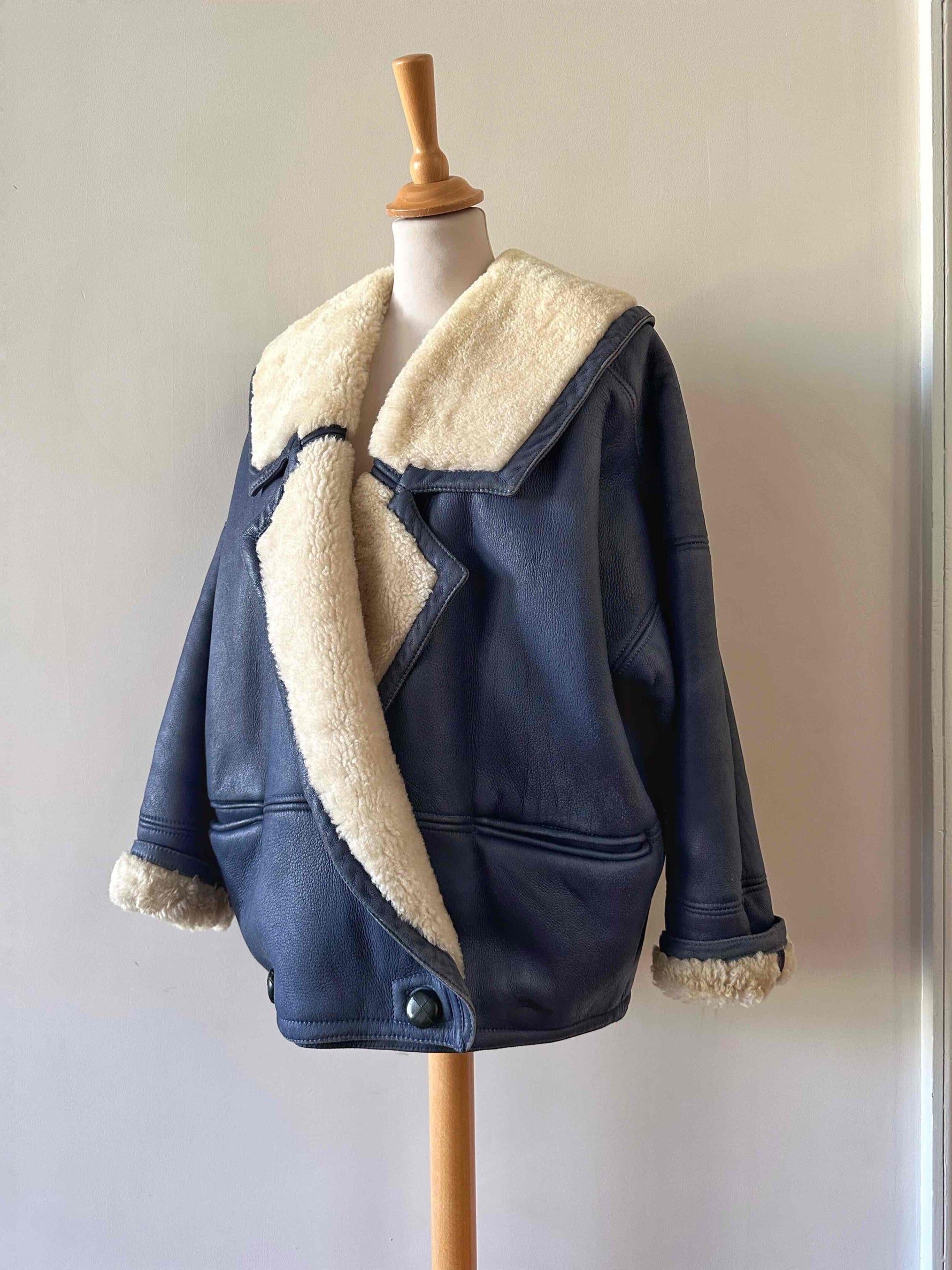 Prix unitaire parPeau lainée en mouton retourné extérieur cuir bleu marine jeans, intérieur laine de mouton écrue, boutonnage croisé en bas par boutons cuir, grand col effet marin, fabriqué en Italie, convient aux tailles 36 et 38 porté ici sur un mannequin T36 et ouvert sur une personne T40.