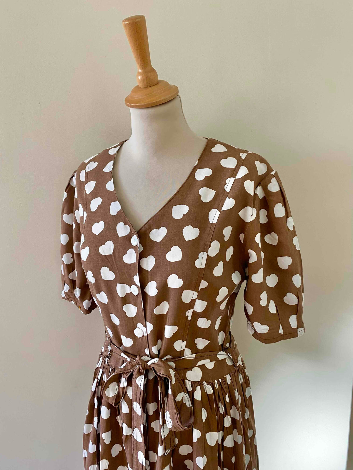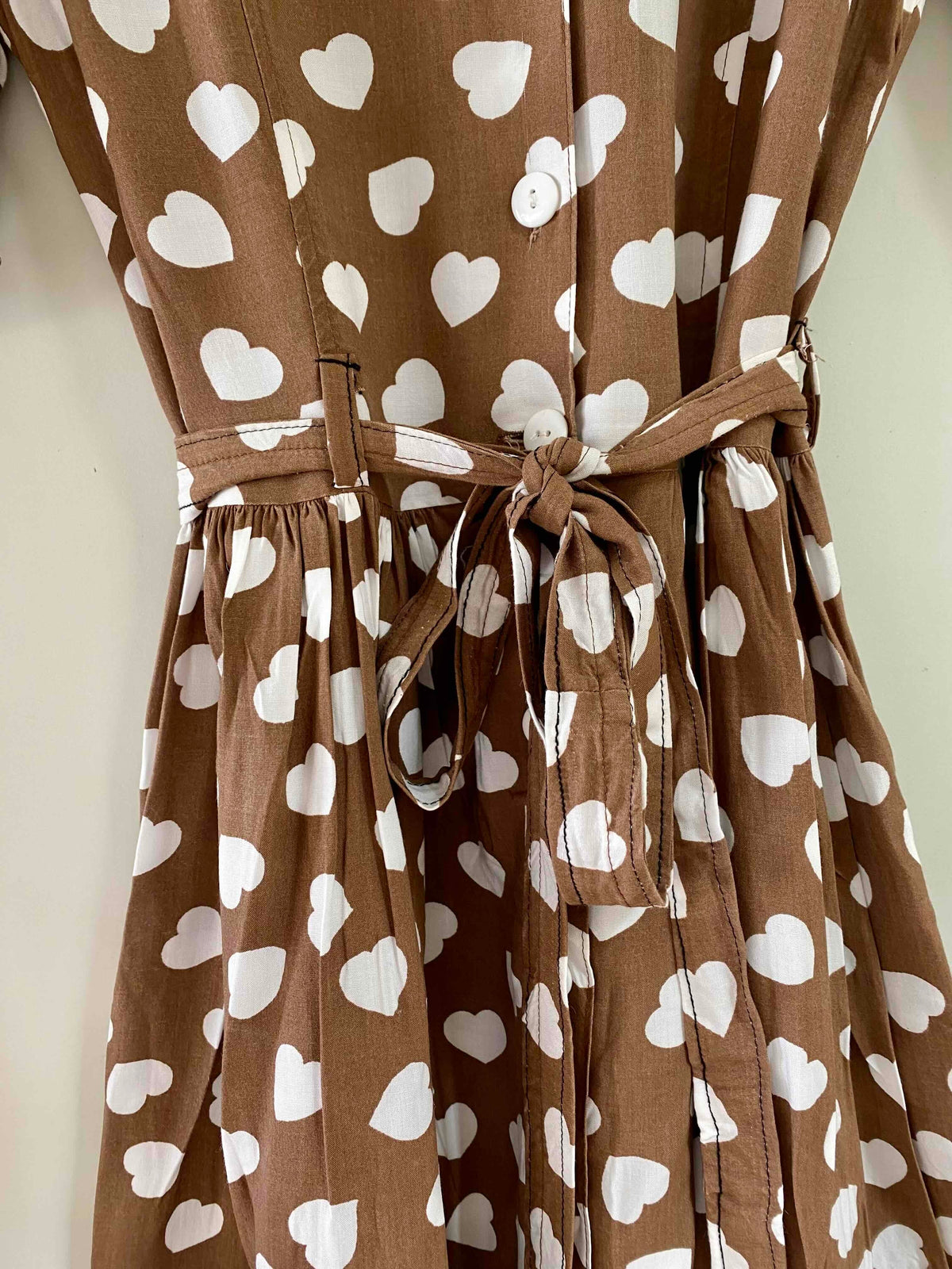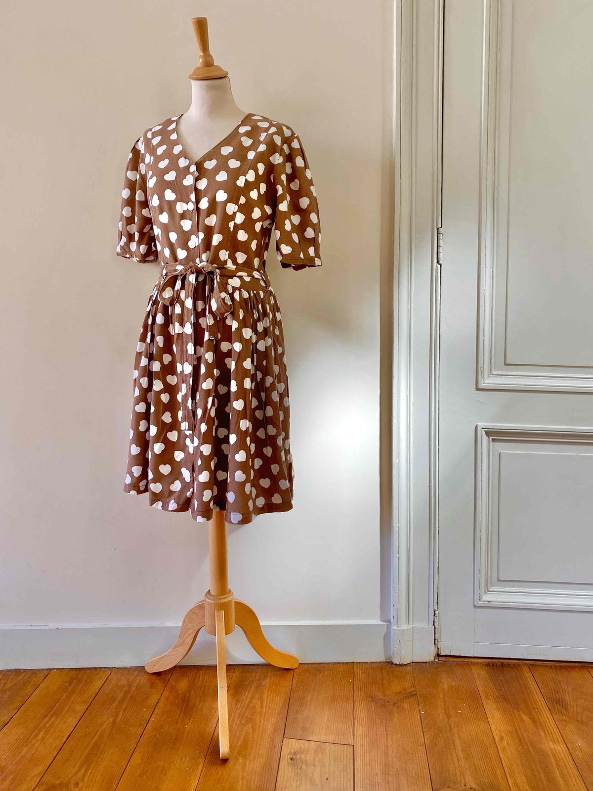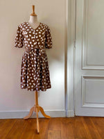 Prix unitaire parMini robe coeurs, en viscose chocolat imprimée coeurs blancs, manches ballons gigots à boutonner, boutons blancs, longue ceinture taille à nouer, fabriquée en France, taille 36 portée ici sur un mannequin T36, aisselles 44cm.