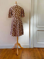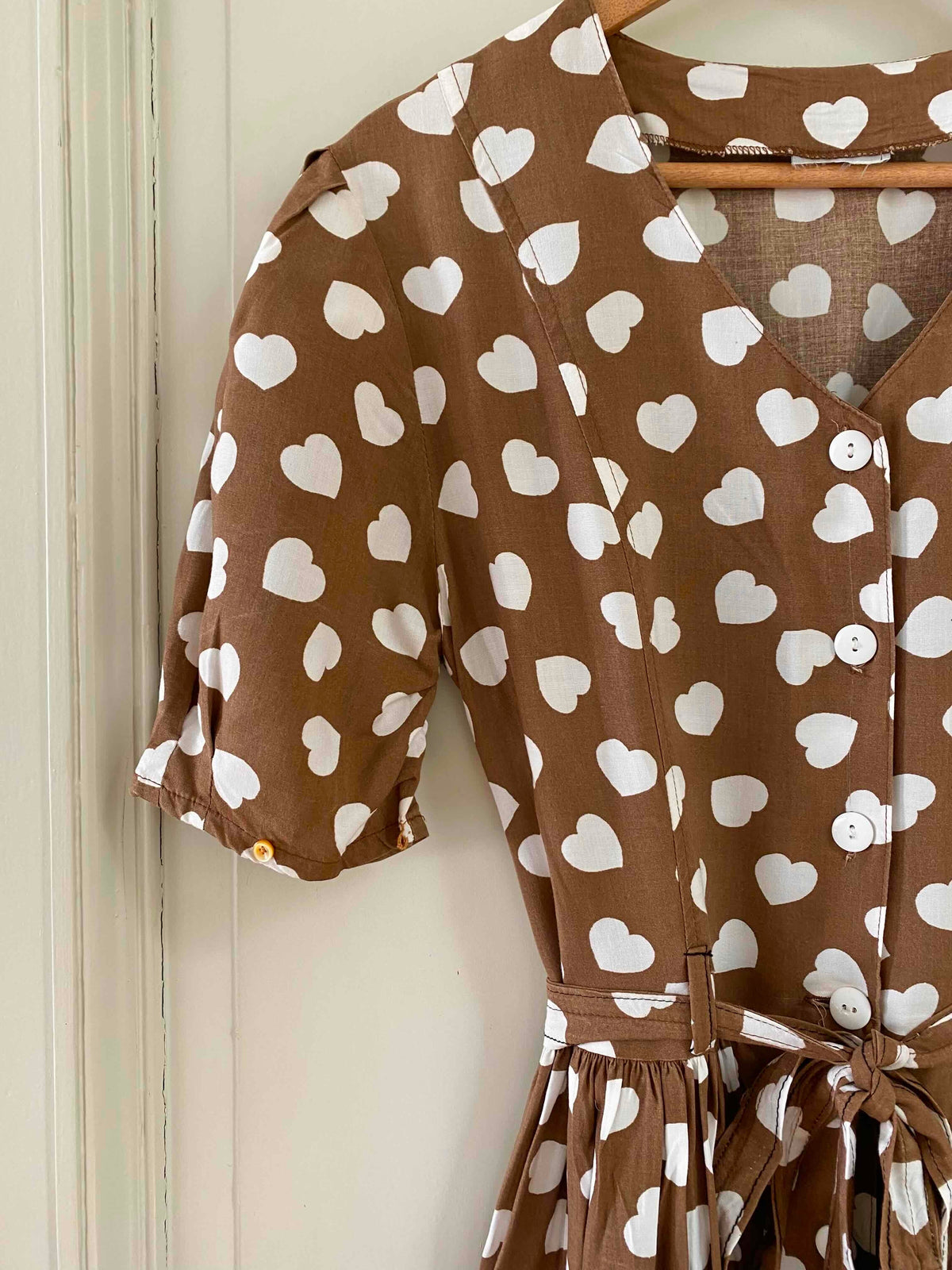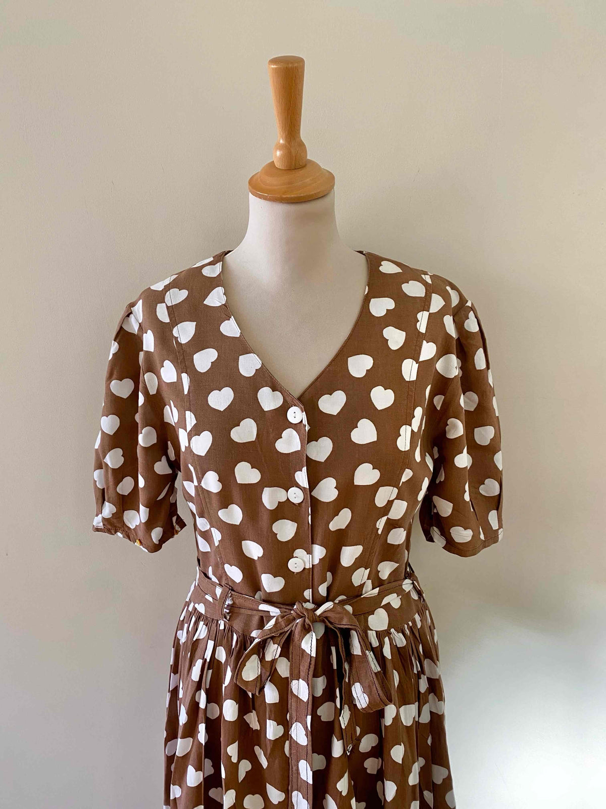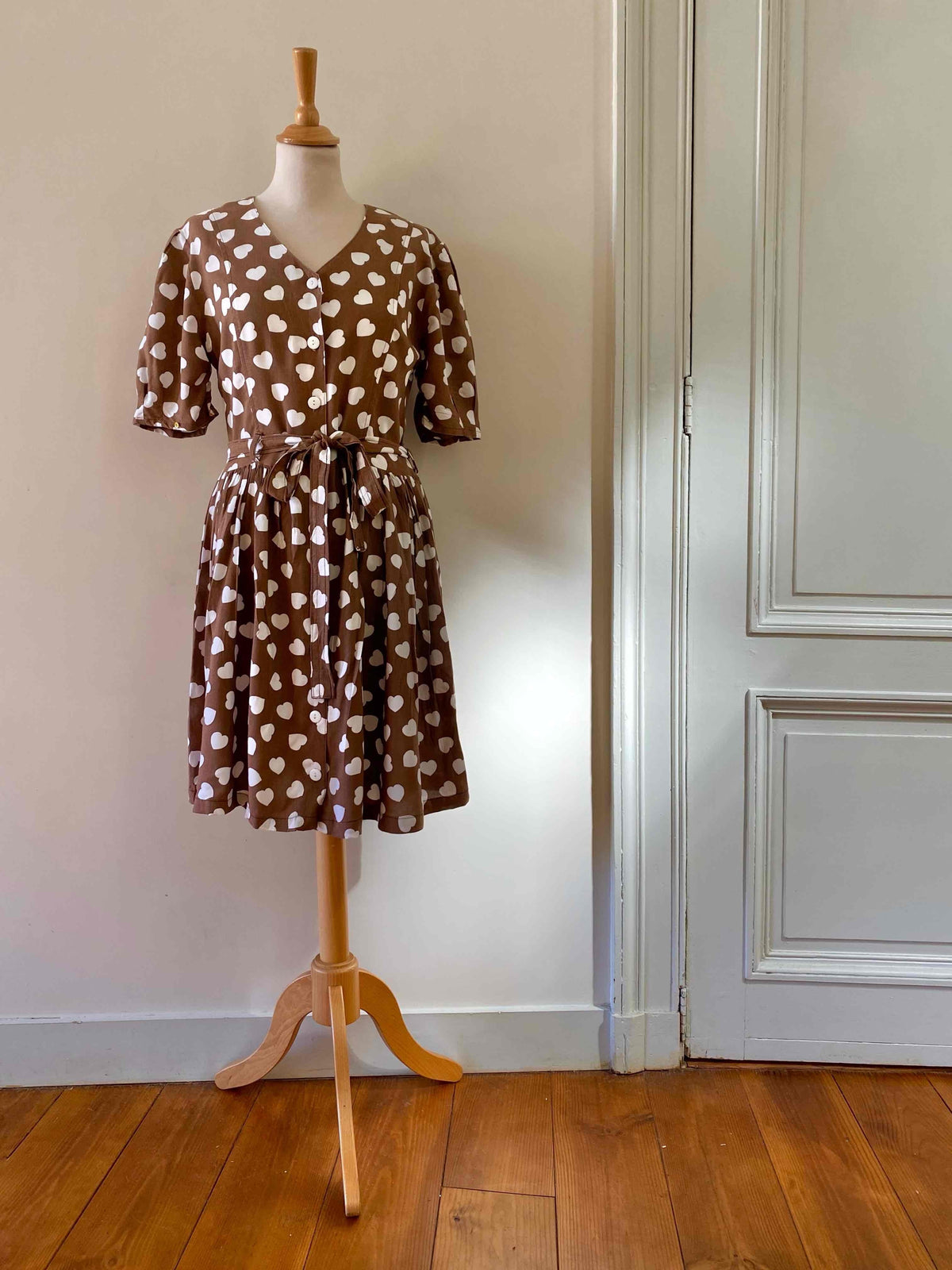 Prix unitaire parMini robe coeurs, en viscose chocolat imprimée coeurs blancs, manches ballons gigots à boutonner, boutons blancs, longue ceinture taille à nouer, fabriquée en France, taille 36 portée ici sur un mannequin T36, aisselles 44cm.