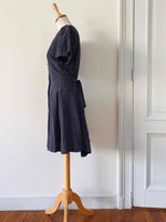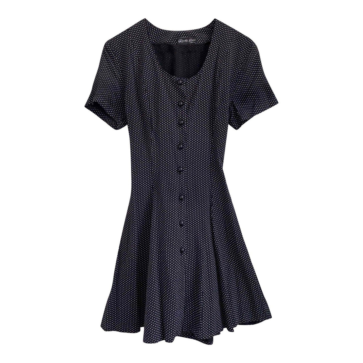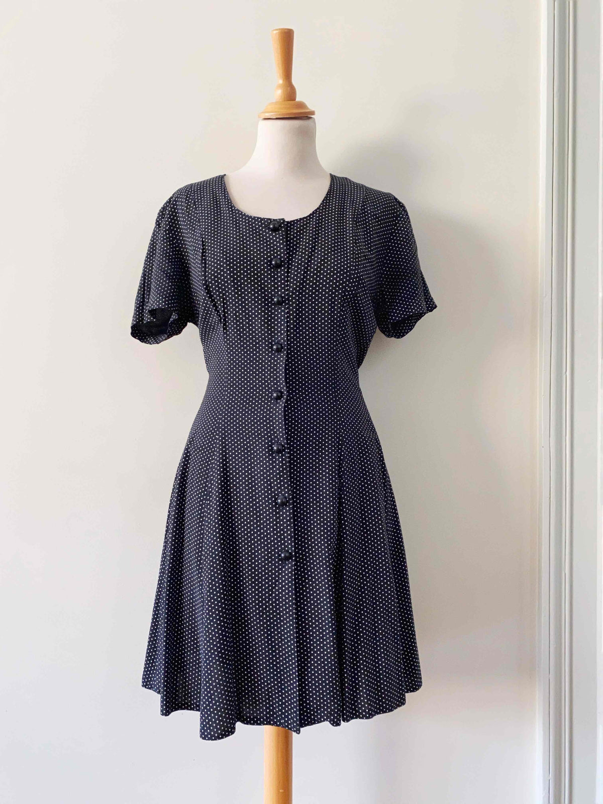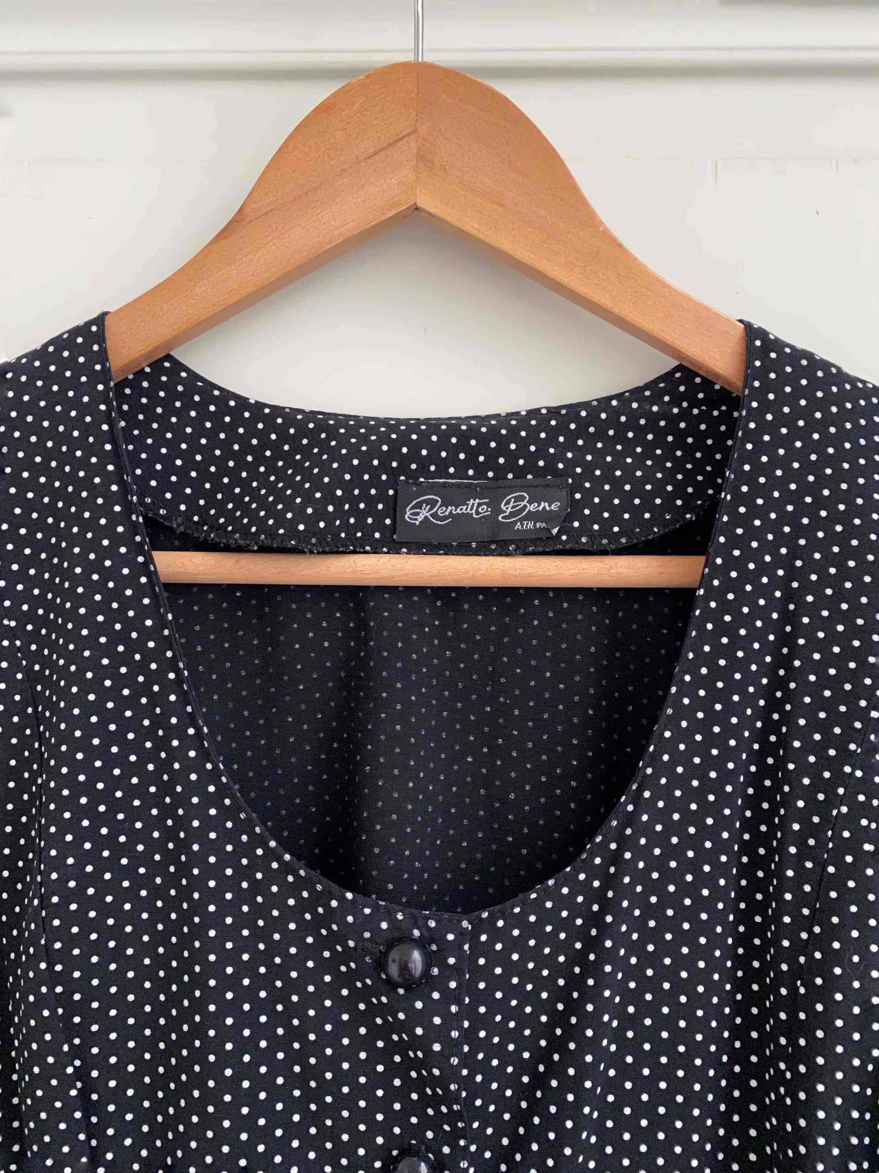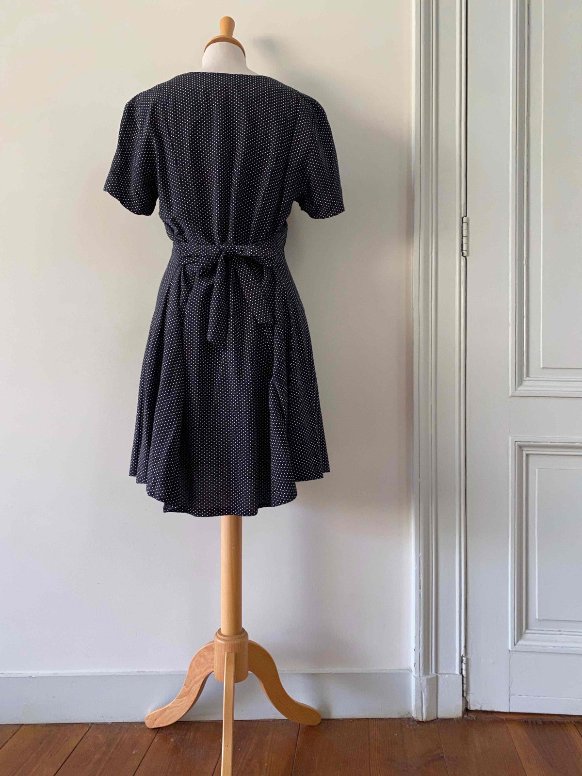 Prix unitaire parMini Robe à Fleurs en viscose noire imprimée petits pois blancs, boutons boules noirs, ceinture large à nouer dos, taille 36 ou petit 38 portée ici sur un mannequin T36, aisselles 46cm.