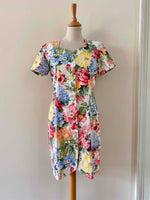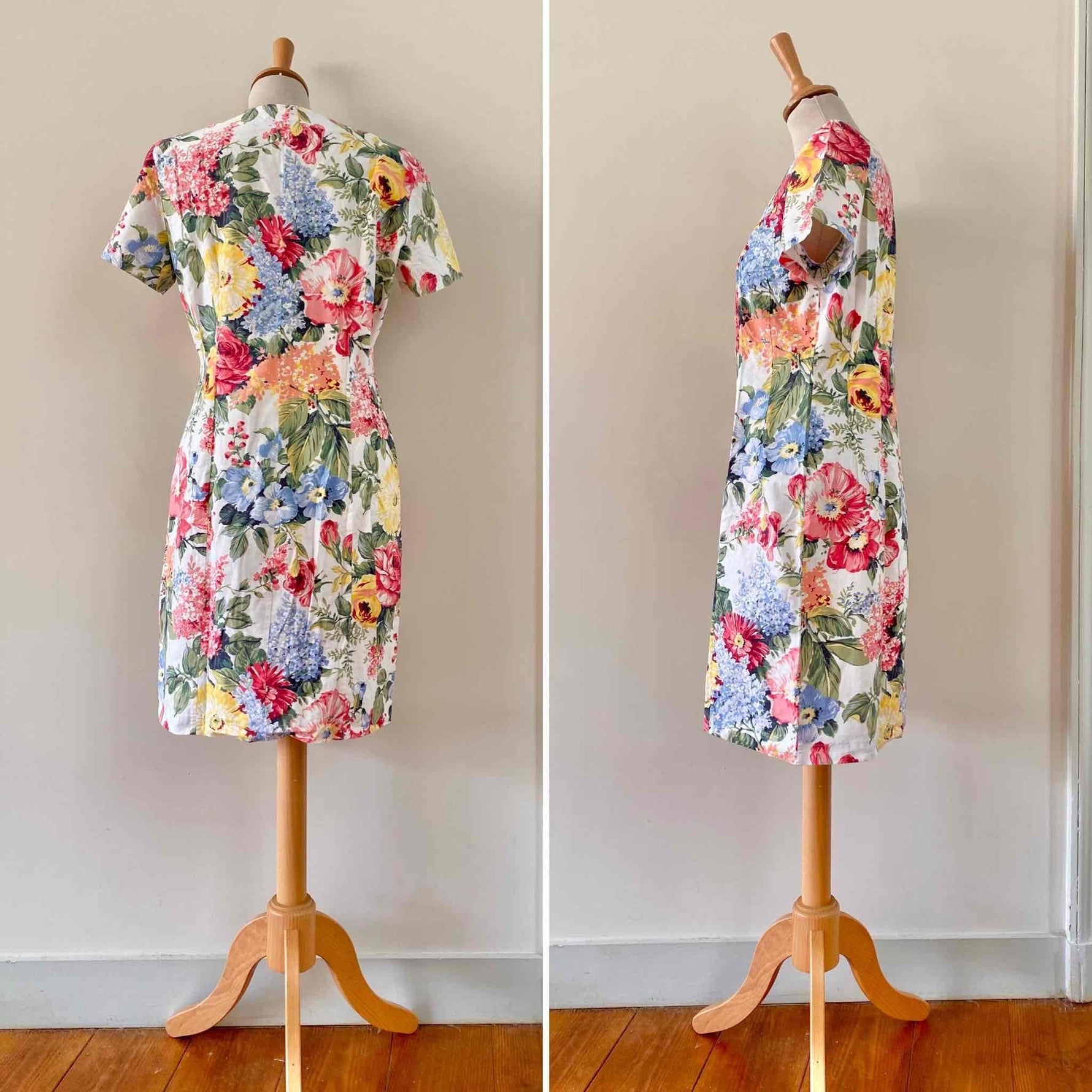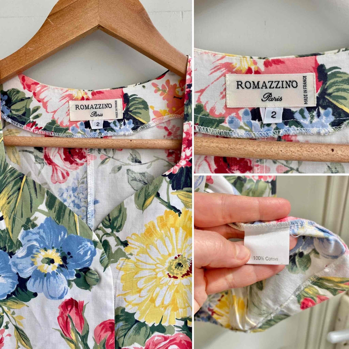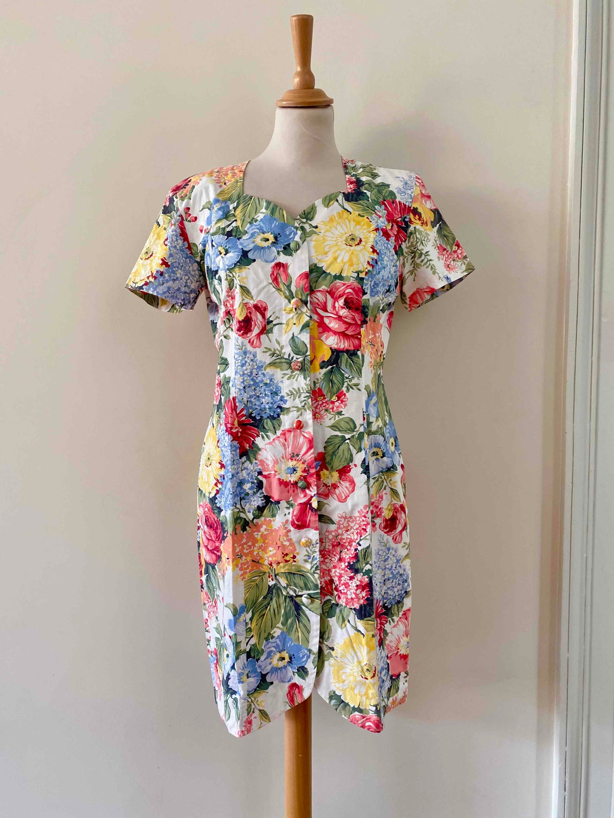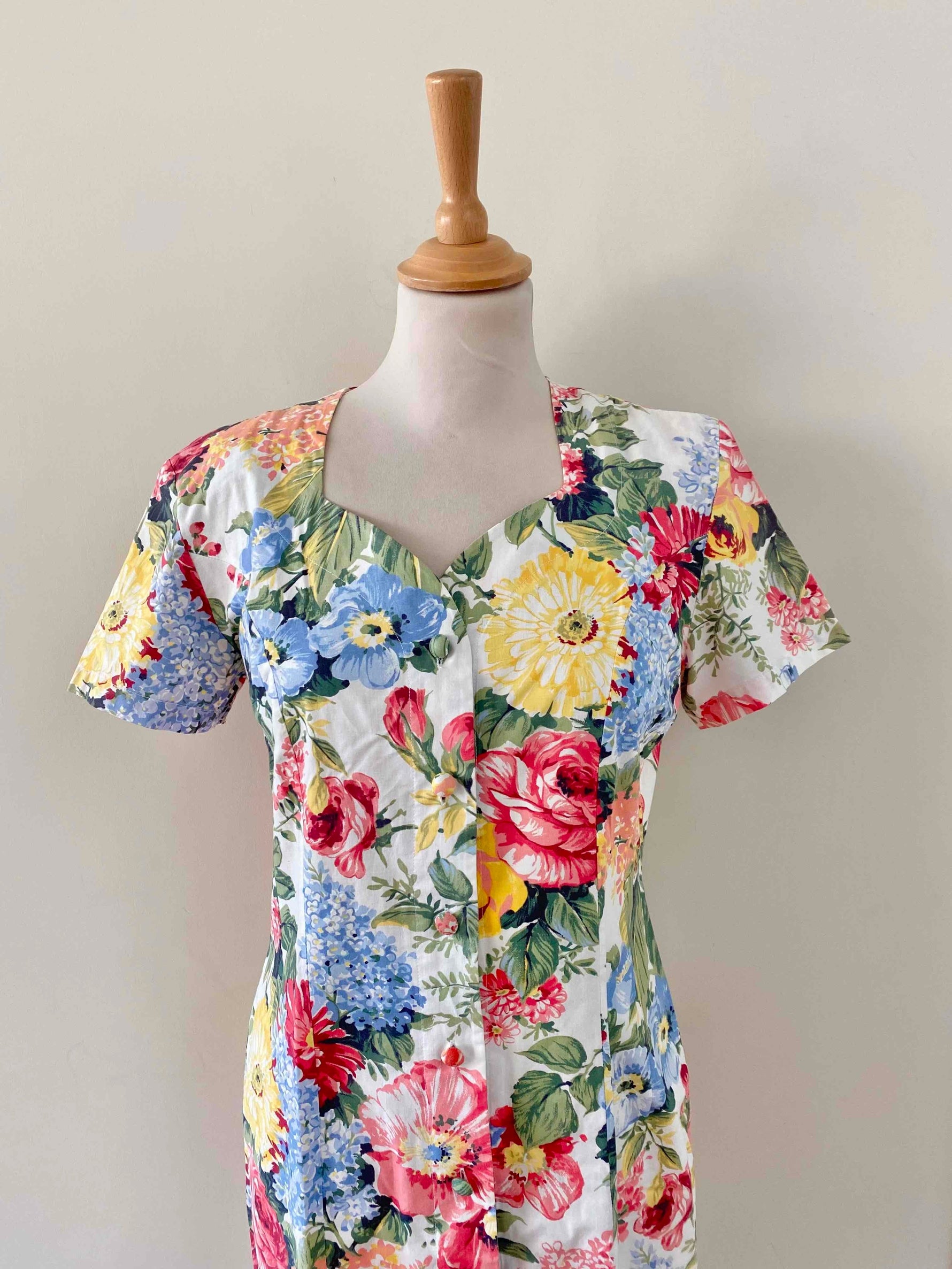 Prix unitaire parMini Robe à Fleurs en 100% coton, imprimée fleurs tapissières multicolores, encolure corsage coeur, taille ceintrée, boutons recouverts, fabriquée en France, taille 38 portée ici sur un mannequin T36, aisselles 47cm.