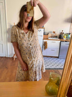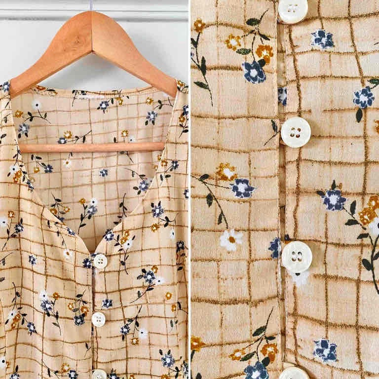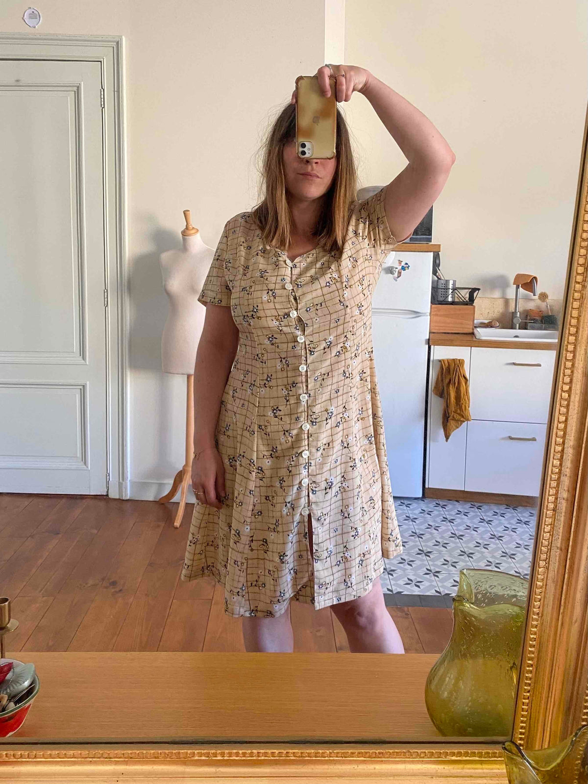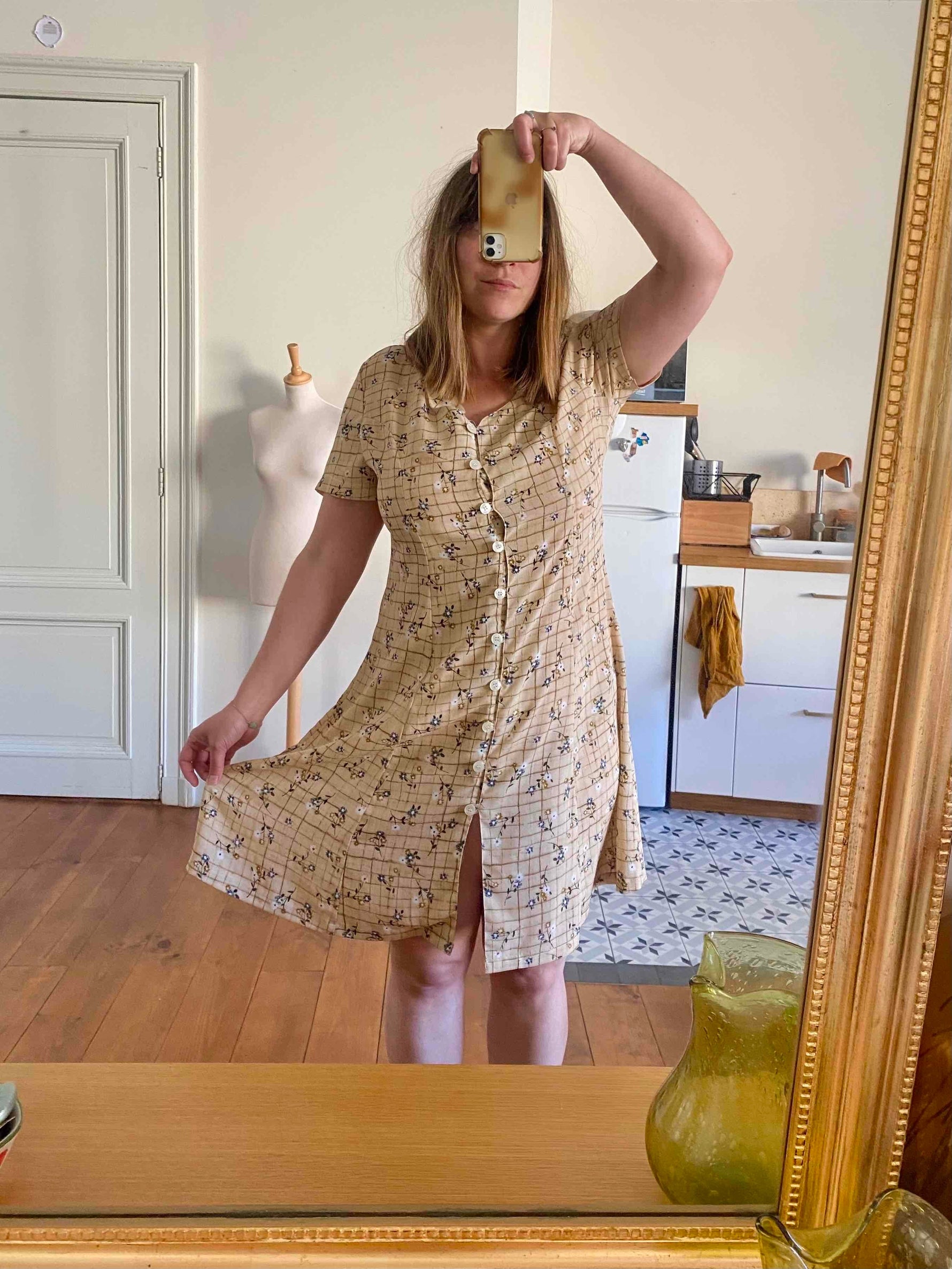 Prix unitaire parMini Robe à Fleurs en viscose écrue beige imprimée carreaux et fleurs champêtres blanches et bleues, boutonnée, manches courtes, taille 40 portée ici sur une personne T40, aisselles 50cm.