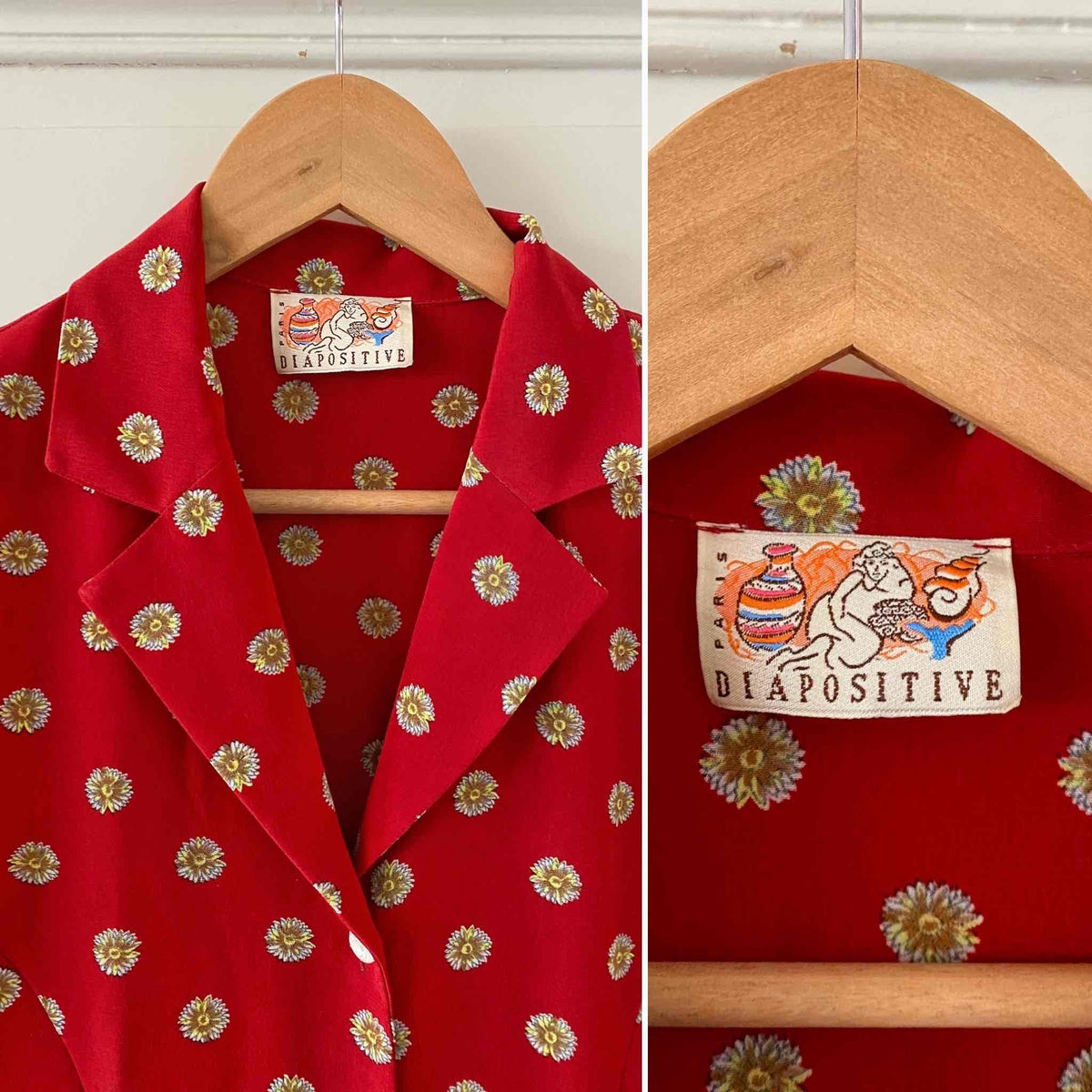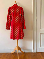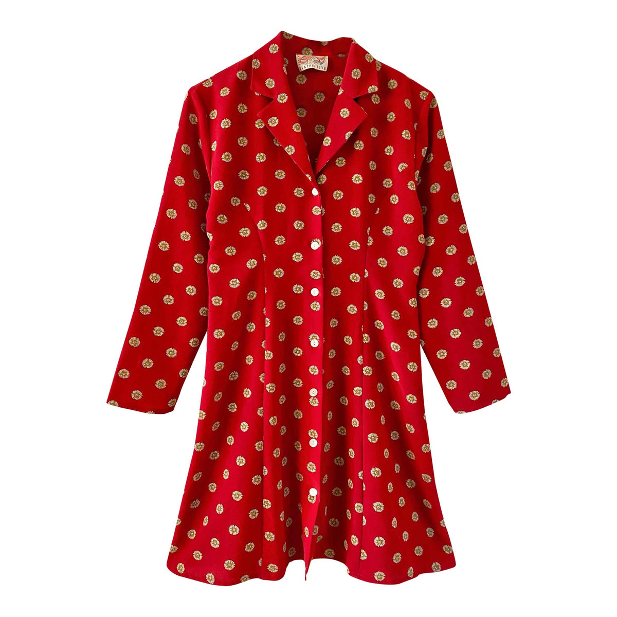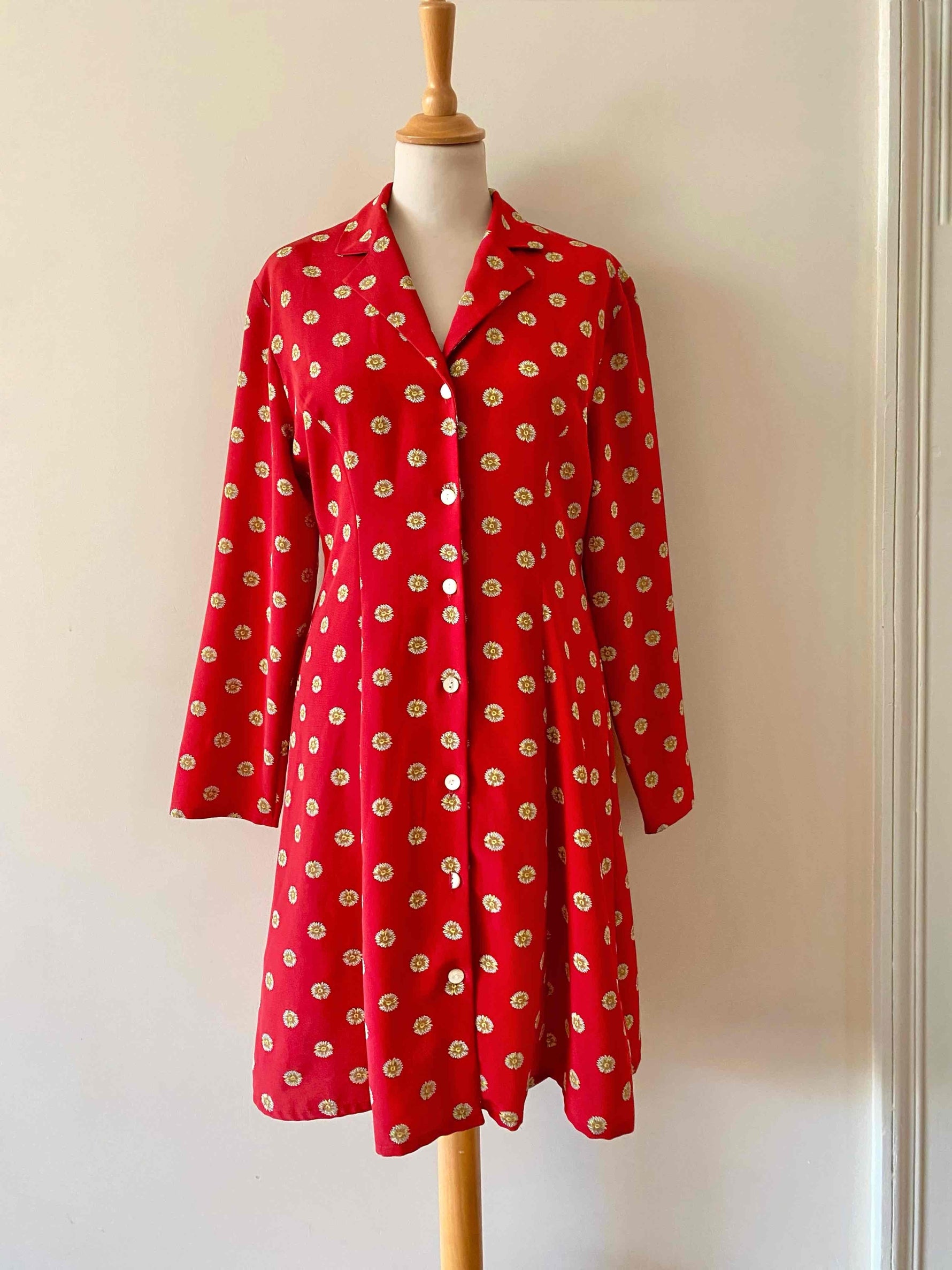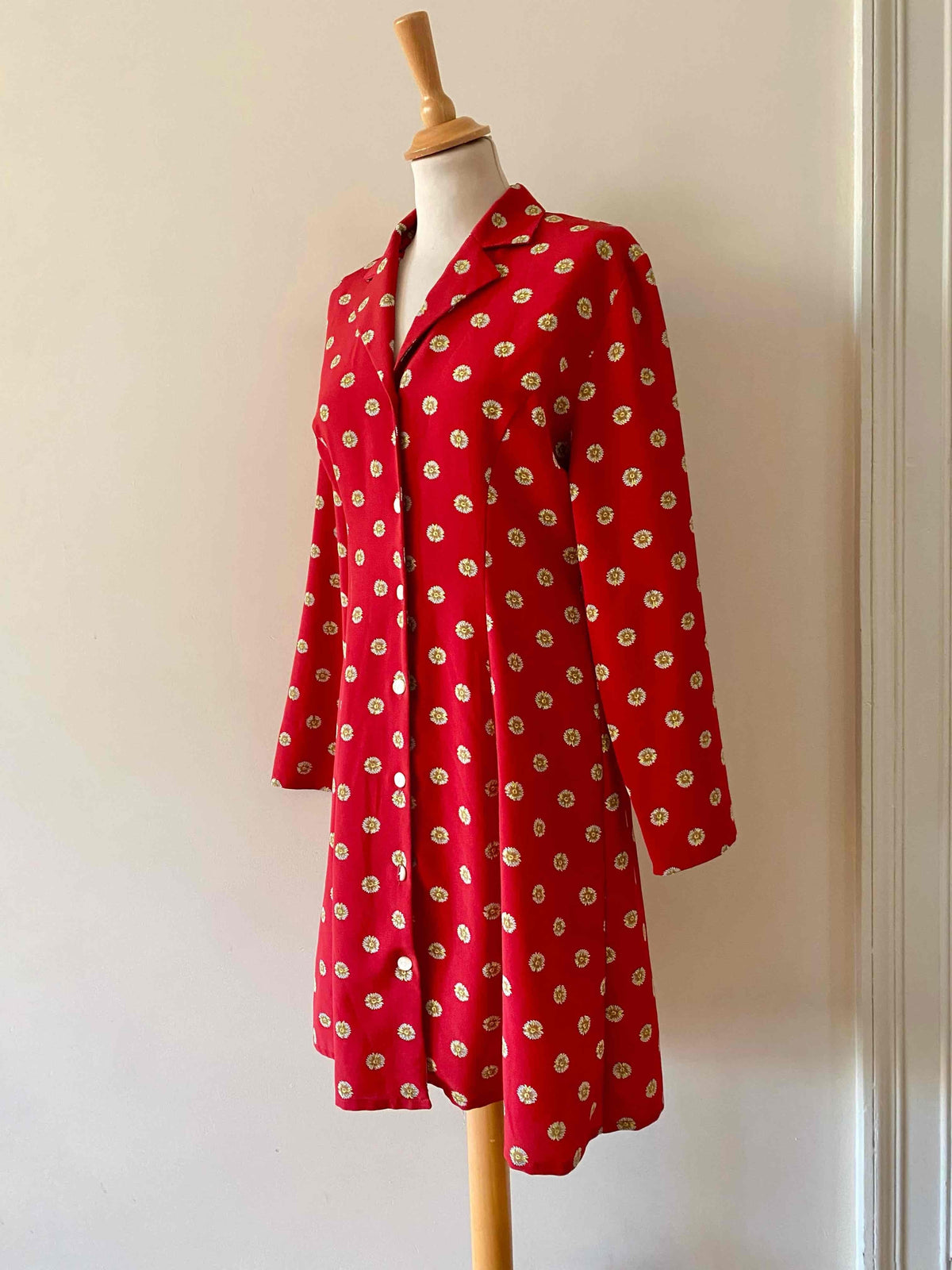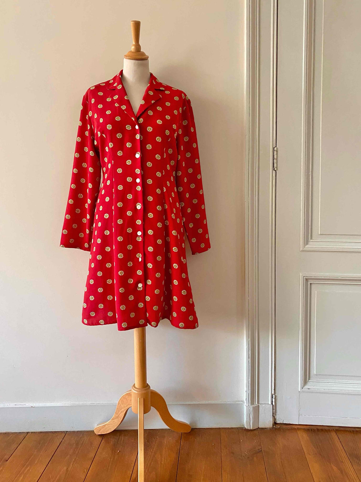 Prix unitaire parMini robe chemise à fleurs, en viscose rouge imprimée fleirs de pâquerettes blanches et jaunes, col chemisier, manches longues, découpes princesses, boutons en nacres, fabriquée en France, taille 36 et petit 38 portée ici sur un mannequin T36.