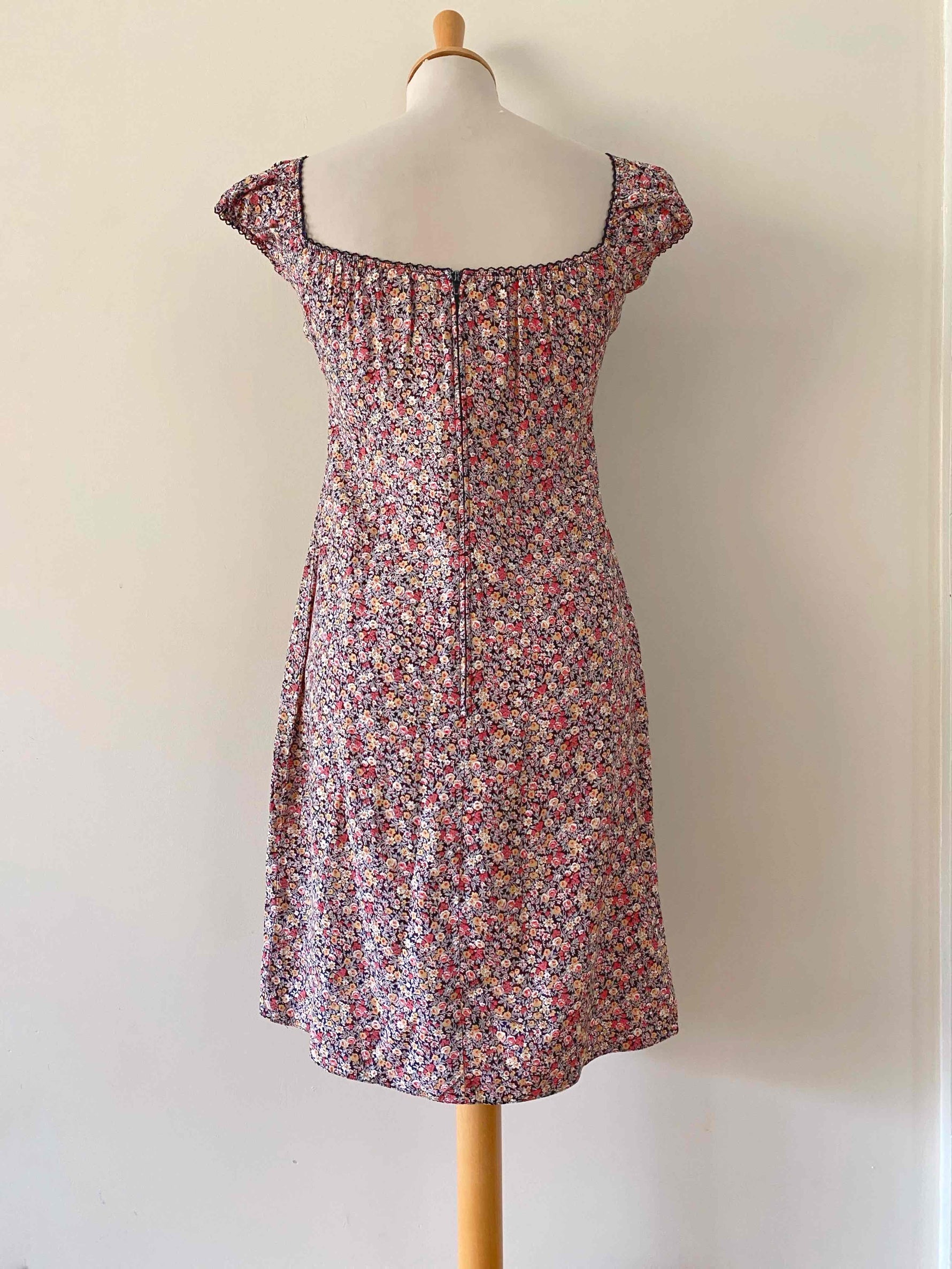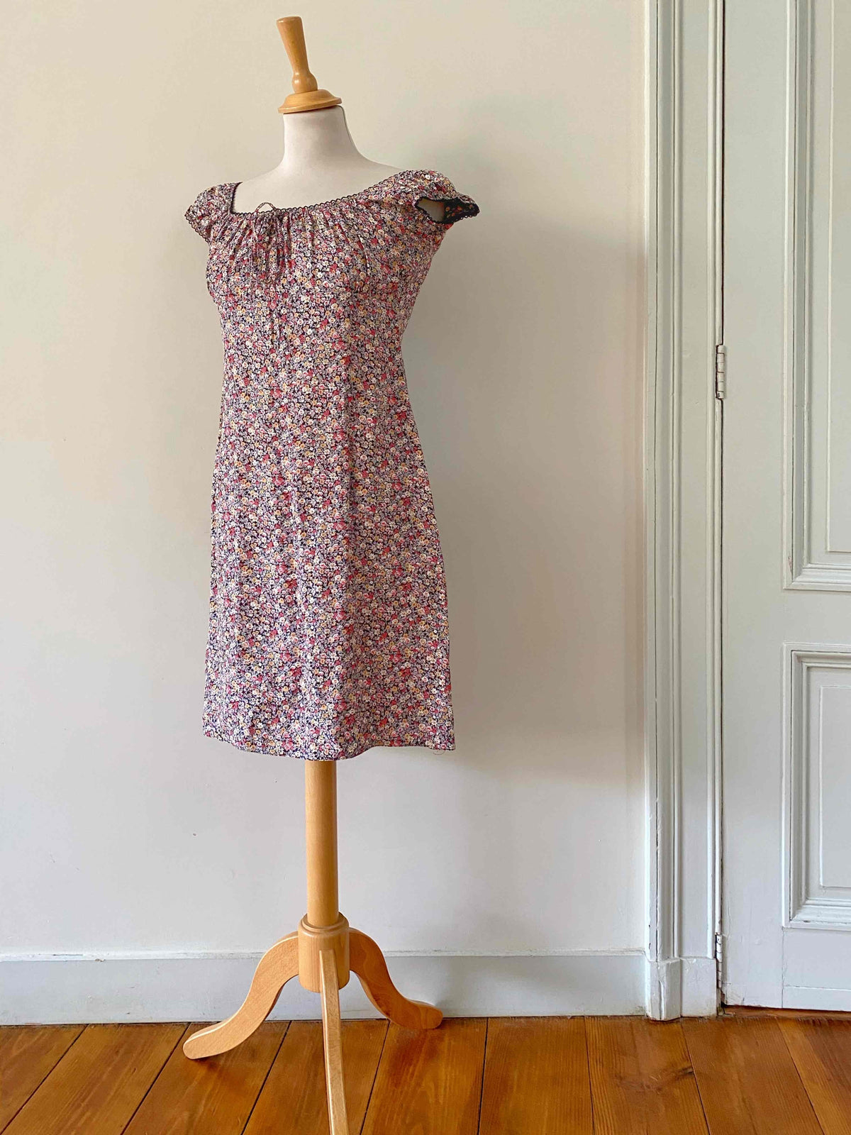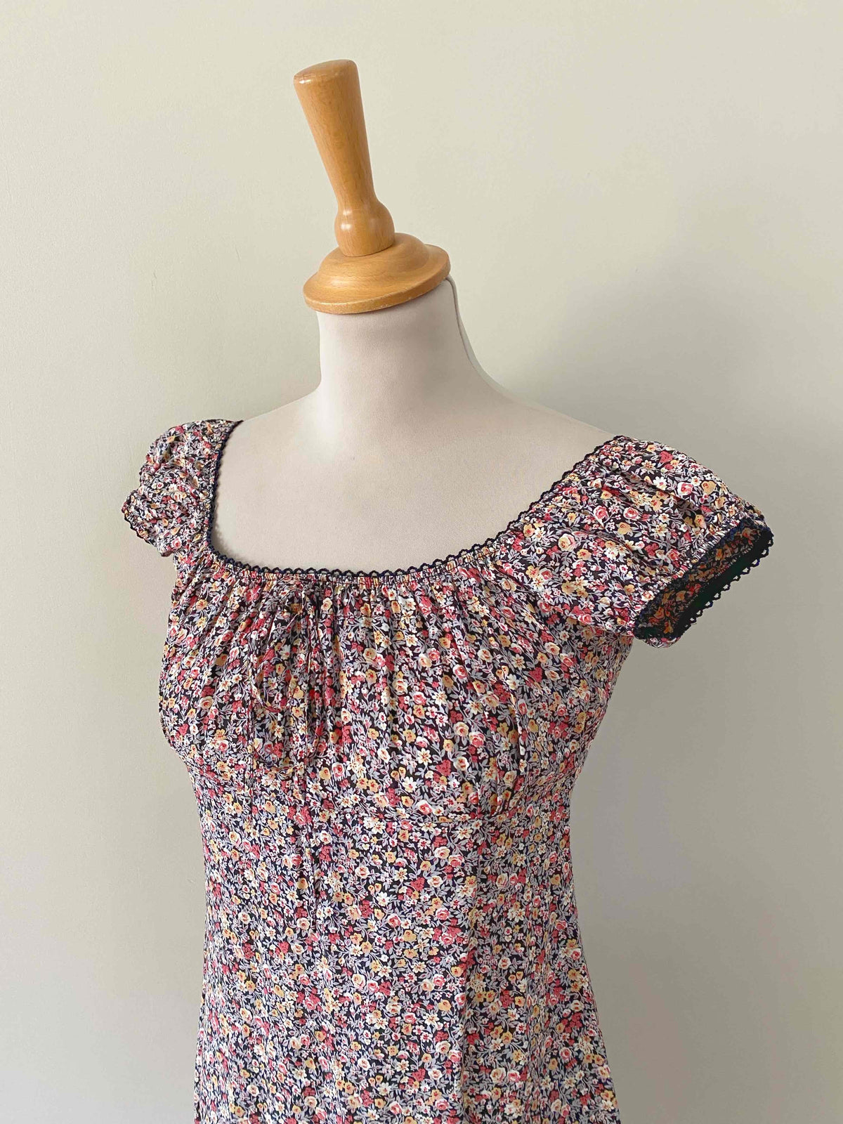 Prix unitaire parMini robe à fleurs en viscose noire imprimée petites fleurs liberty roses et orangées, encolure et manches ballons à épaules dénudées, poitrine froncée à nouer, années 90’s, taille 36 portée ici sur un mannequin T36.