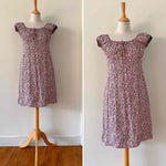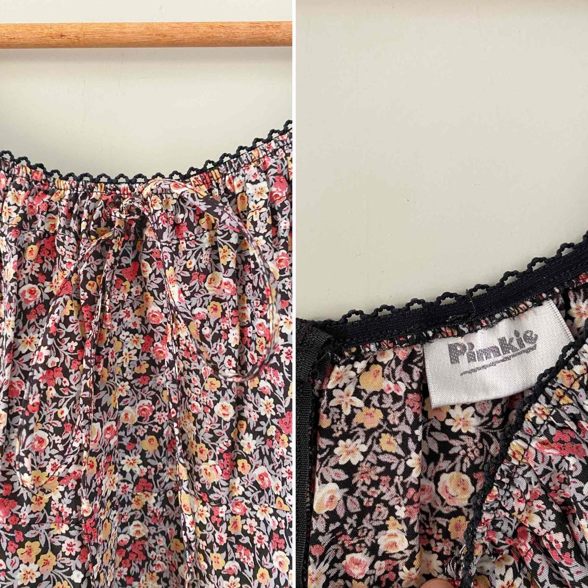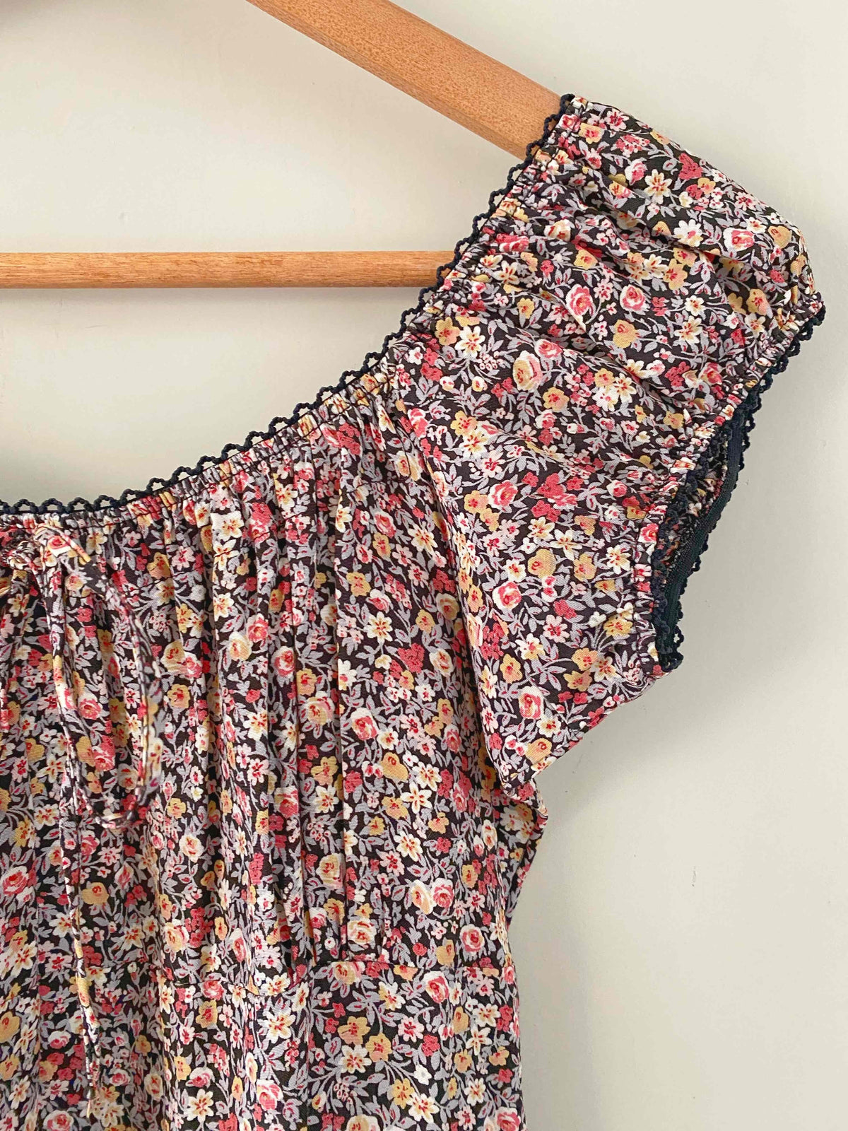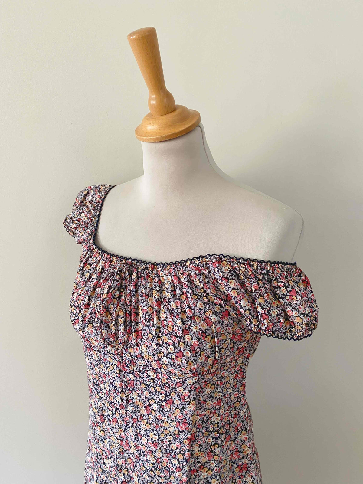 Prix unitaire parMini robe à fleurs en viscose noire imprimée petites fleurs liberty roses et orangées, encolure et manches ballons à épaules dénudées, poitrine froncée à nouer, années 90’s, taille 36 portée ici sur un mannequin T36.