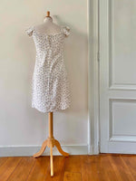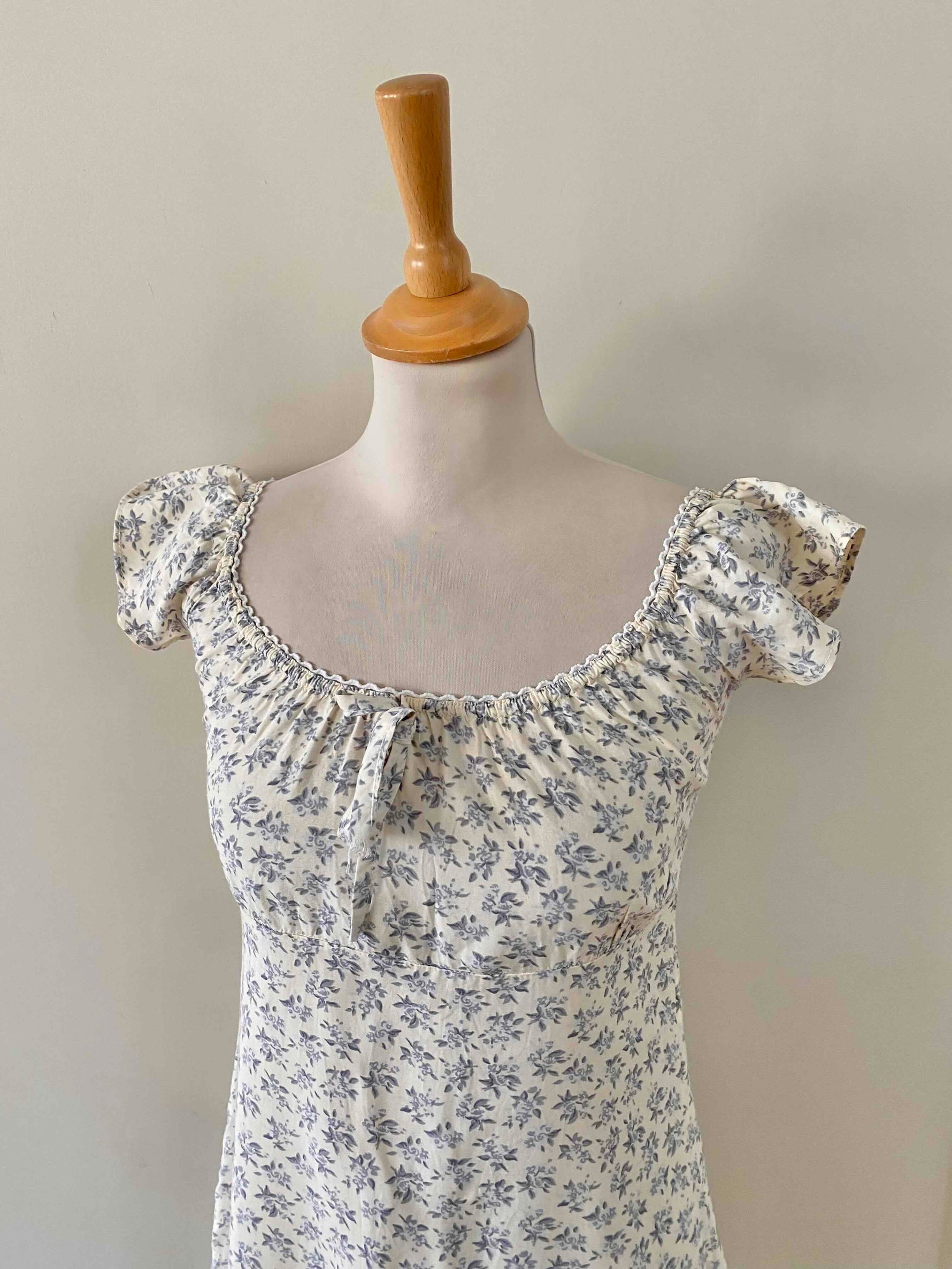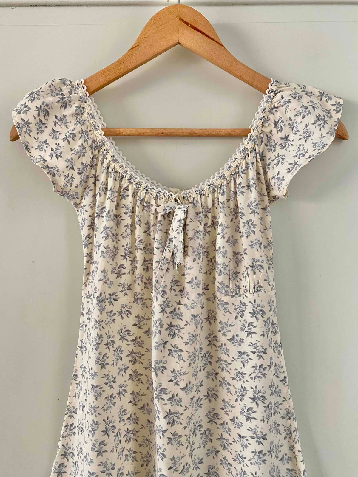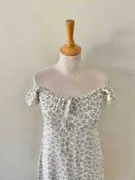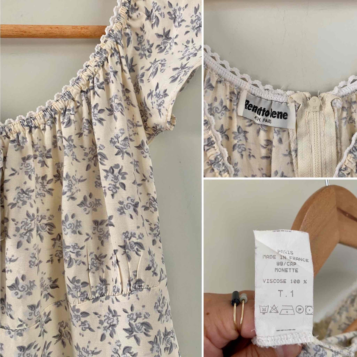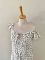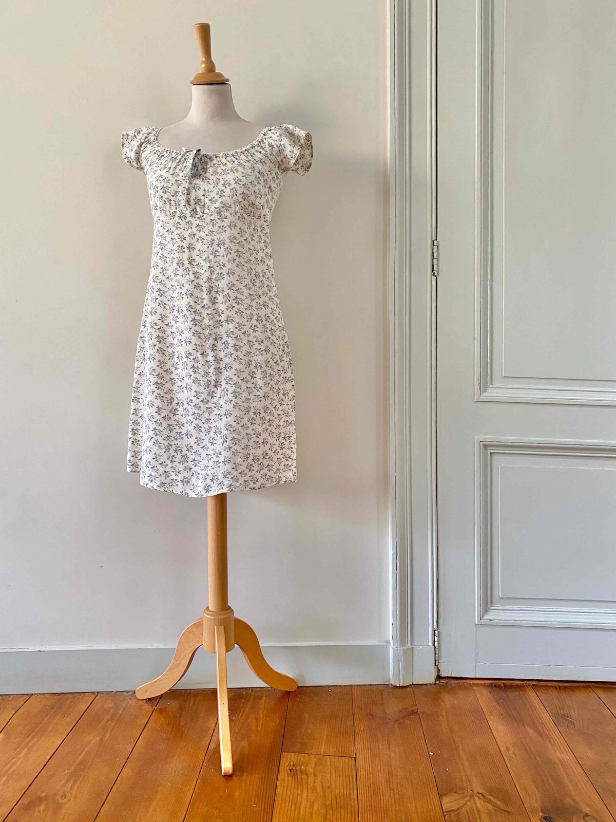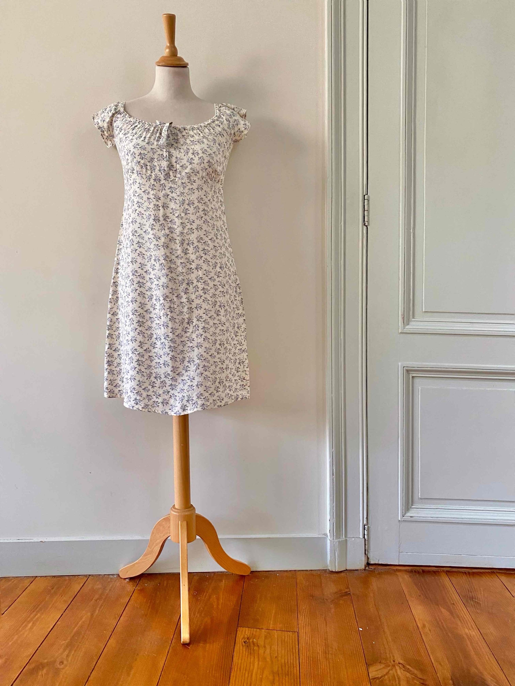Prix unitaire parMini robe à fleurs en viscose écrue imprimée petites fleurs bleues ciel, encolure élastique, poitrine froncée à nouer et manches ballons à porter open-shoulders, fabriquée en France, taille 34 et 36 portée ici sur un mannequin T36, aisselles