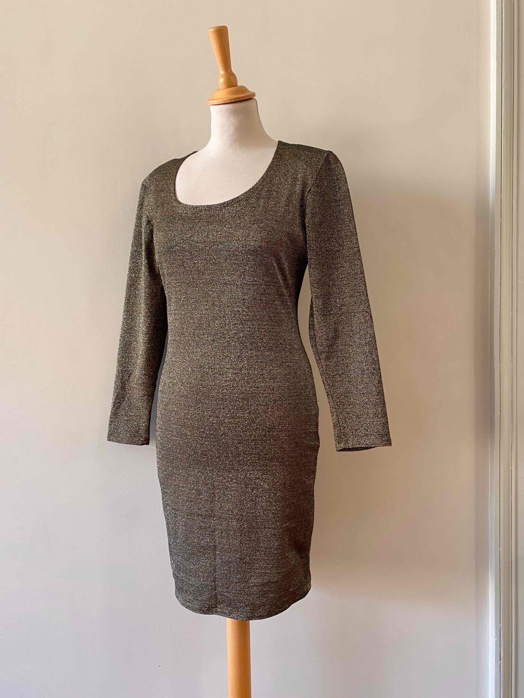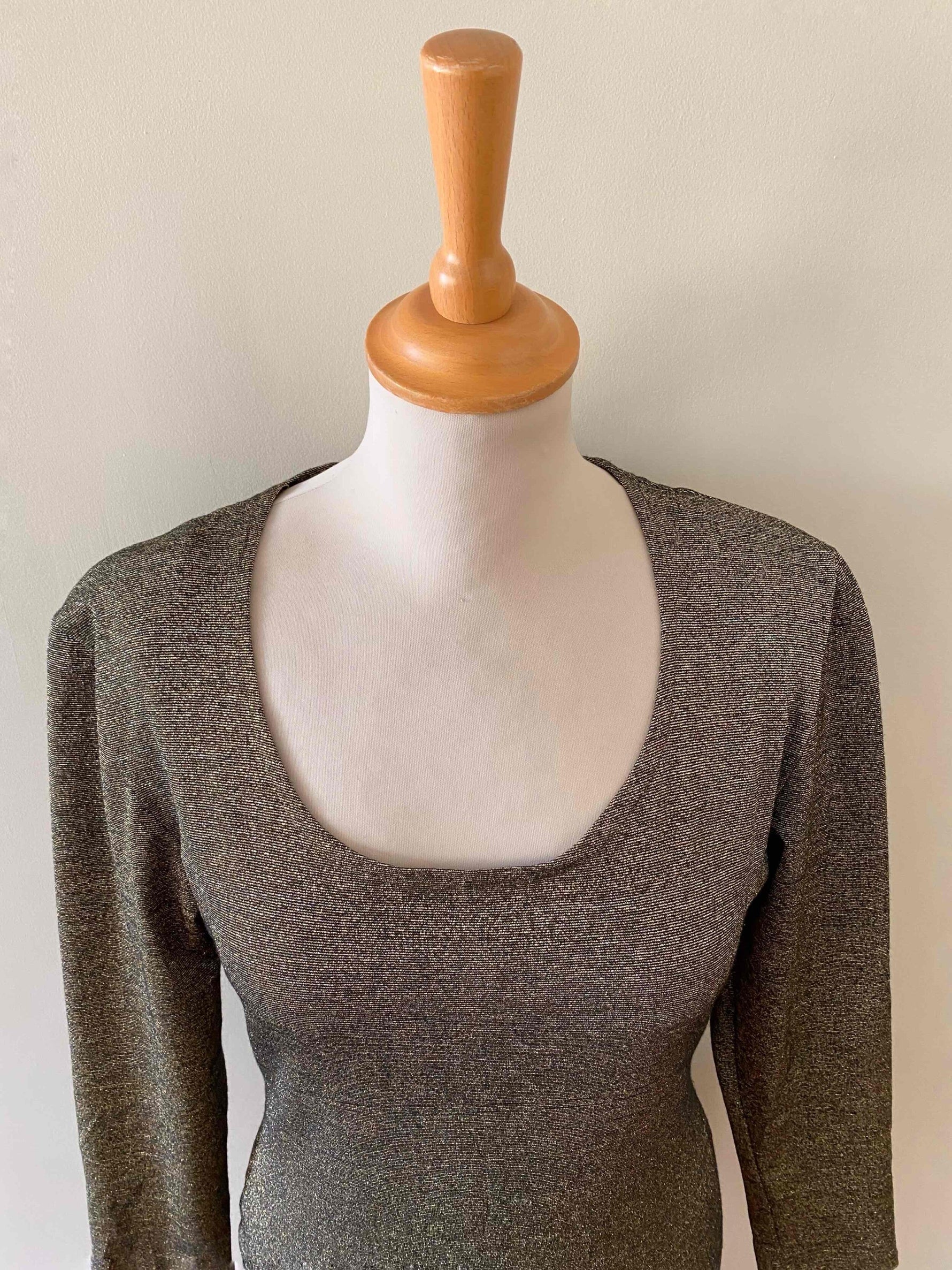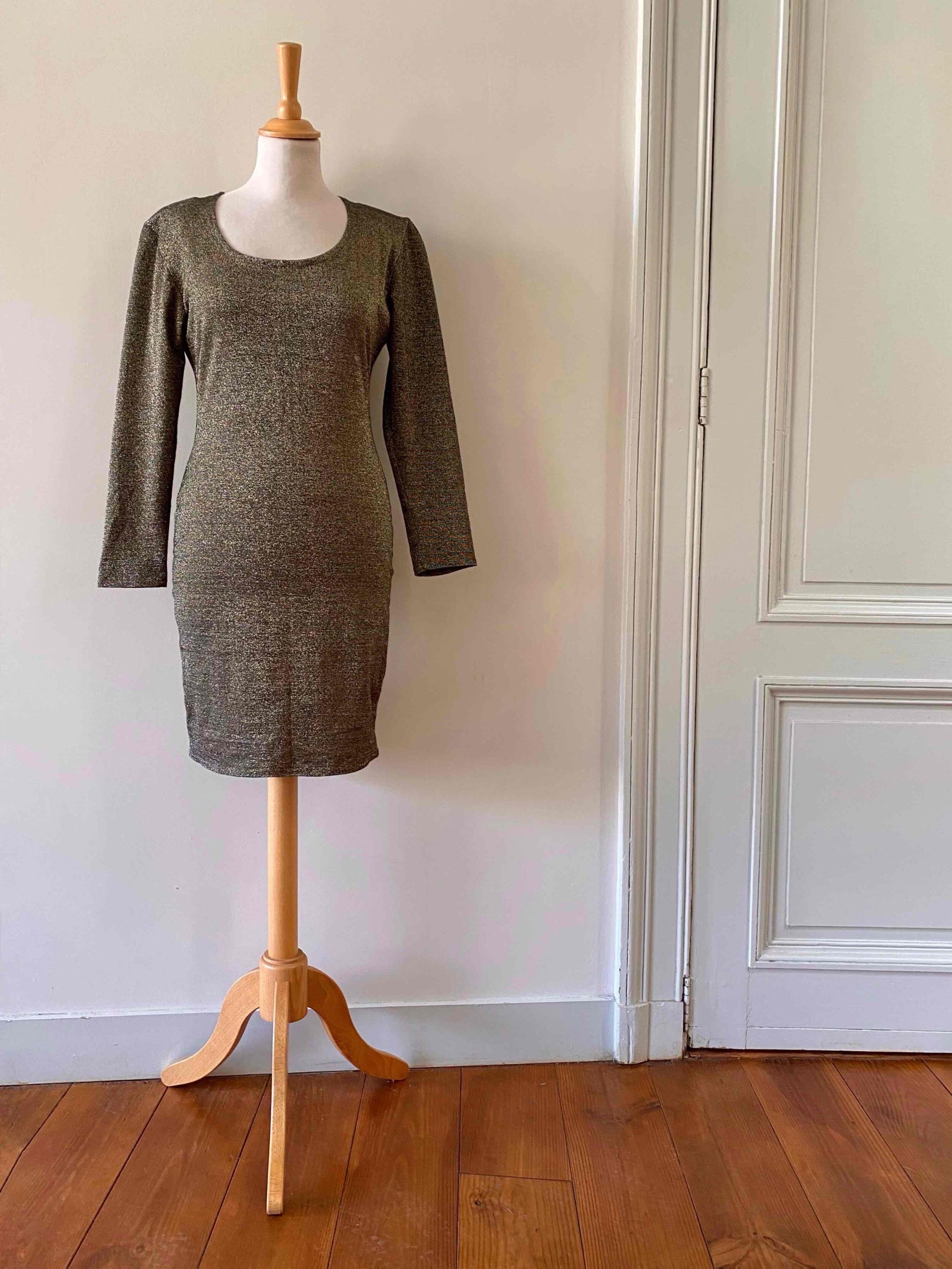 Mini robe en maille lurex, noire lurex doré et argenté, encolure danseuse, manches longues, forme moulante, fabriquée en France, taille 36 portée ici sur un mannequin T36.