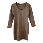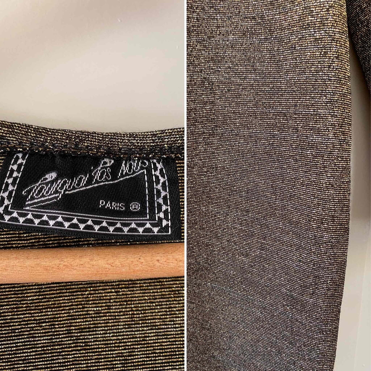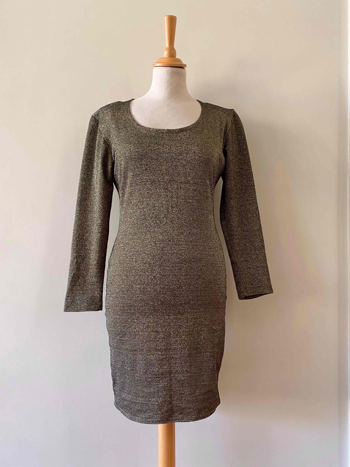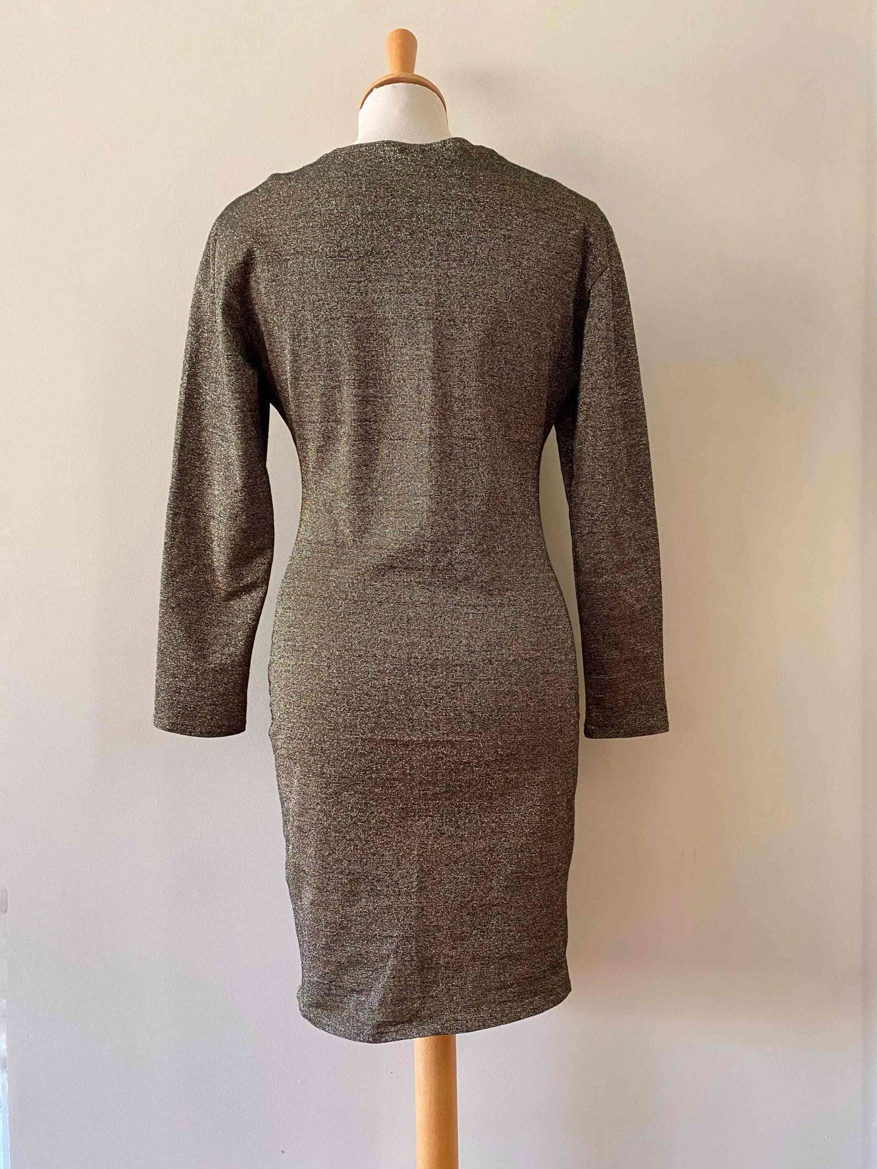 Mini robe en maille lurex, noire lurex doré et argenté, encolure danseuse, manches longues, forme moulante, fabriquée en France, taille 36 portée ici sur un mannequin T36.