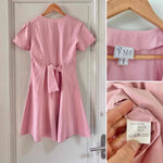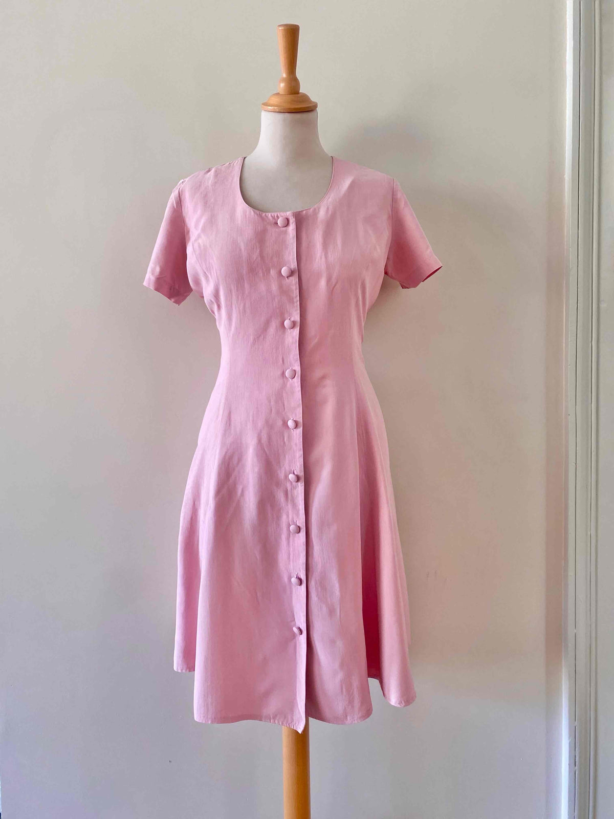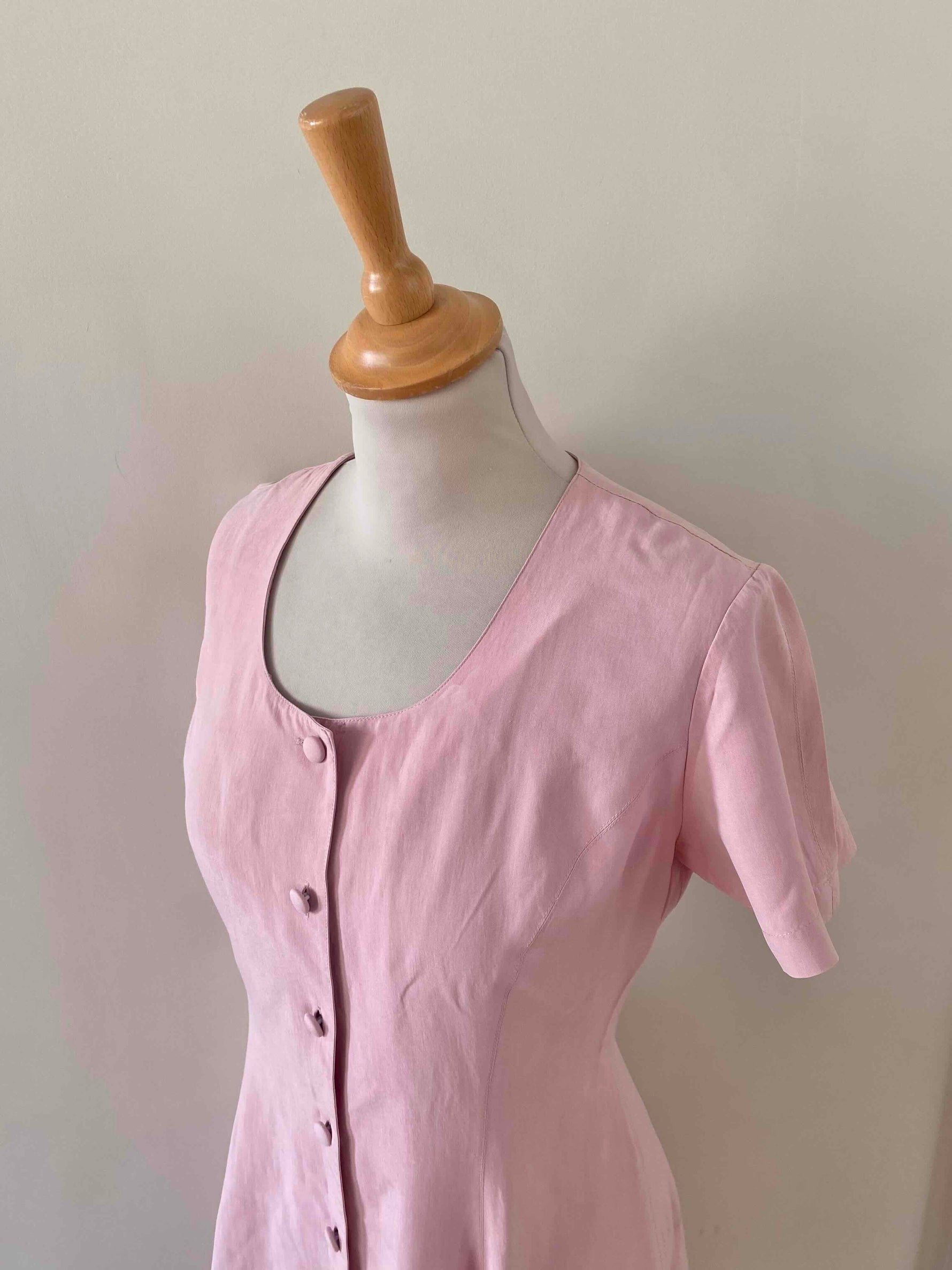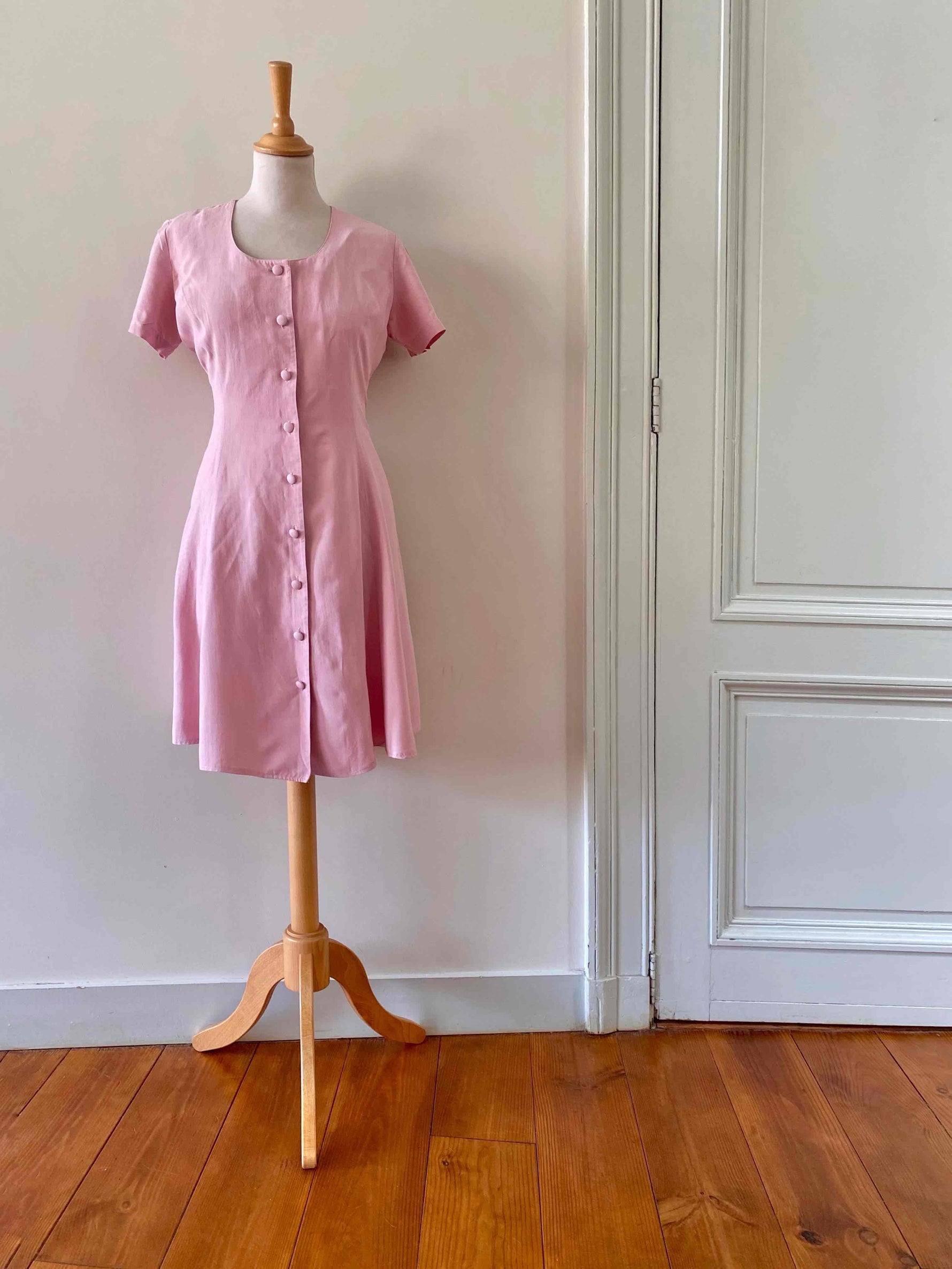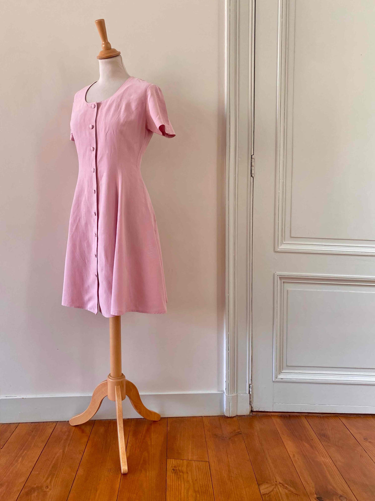 Prix unitaire parMini robe en soie, 100% soie rose pastel, boutons recouverts, manches courtes, taille dos à nouer et forme fit and flare, taille 36 actuelle portée ici sur un mannequin T36, aisselles 44cm.