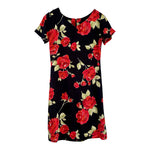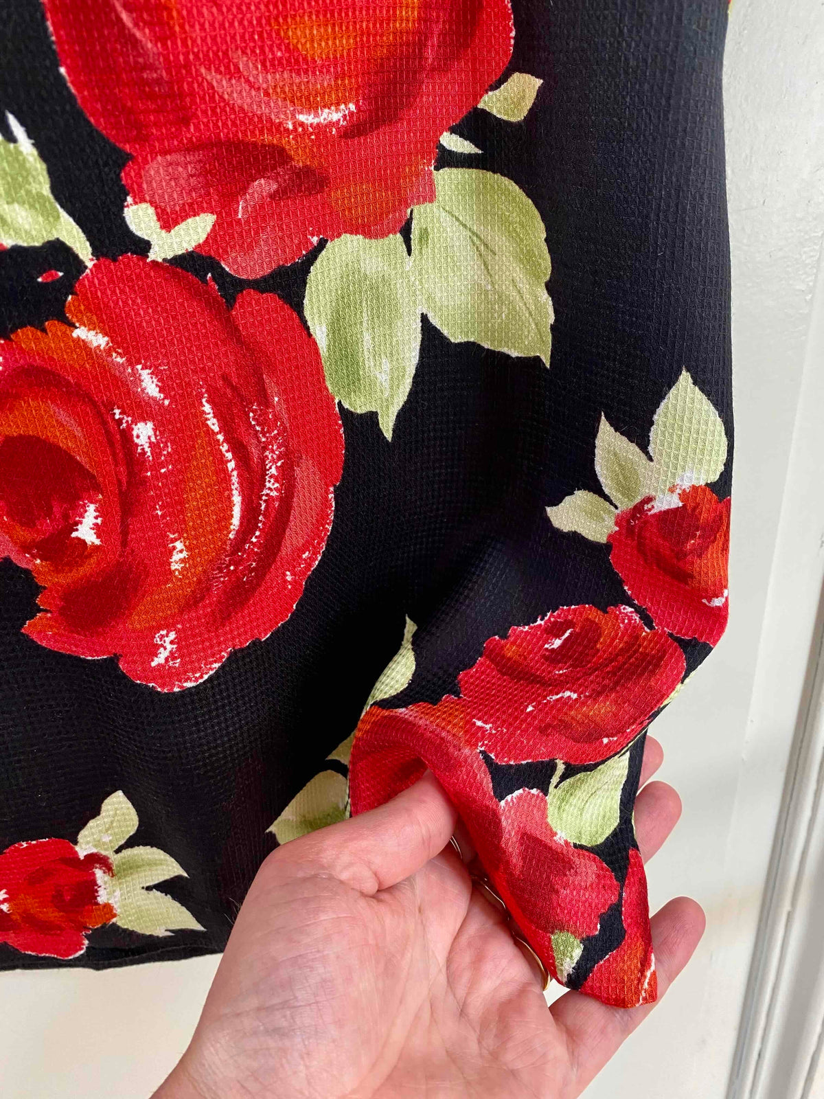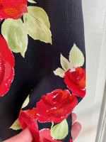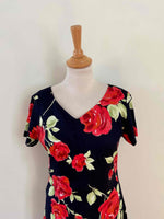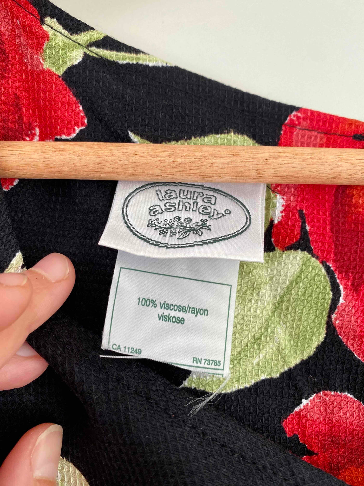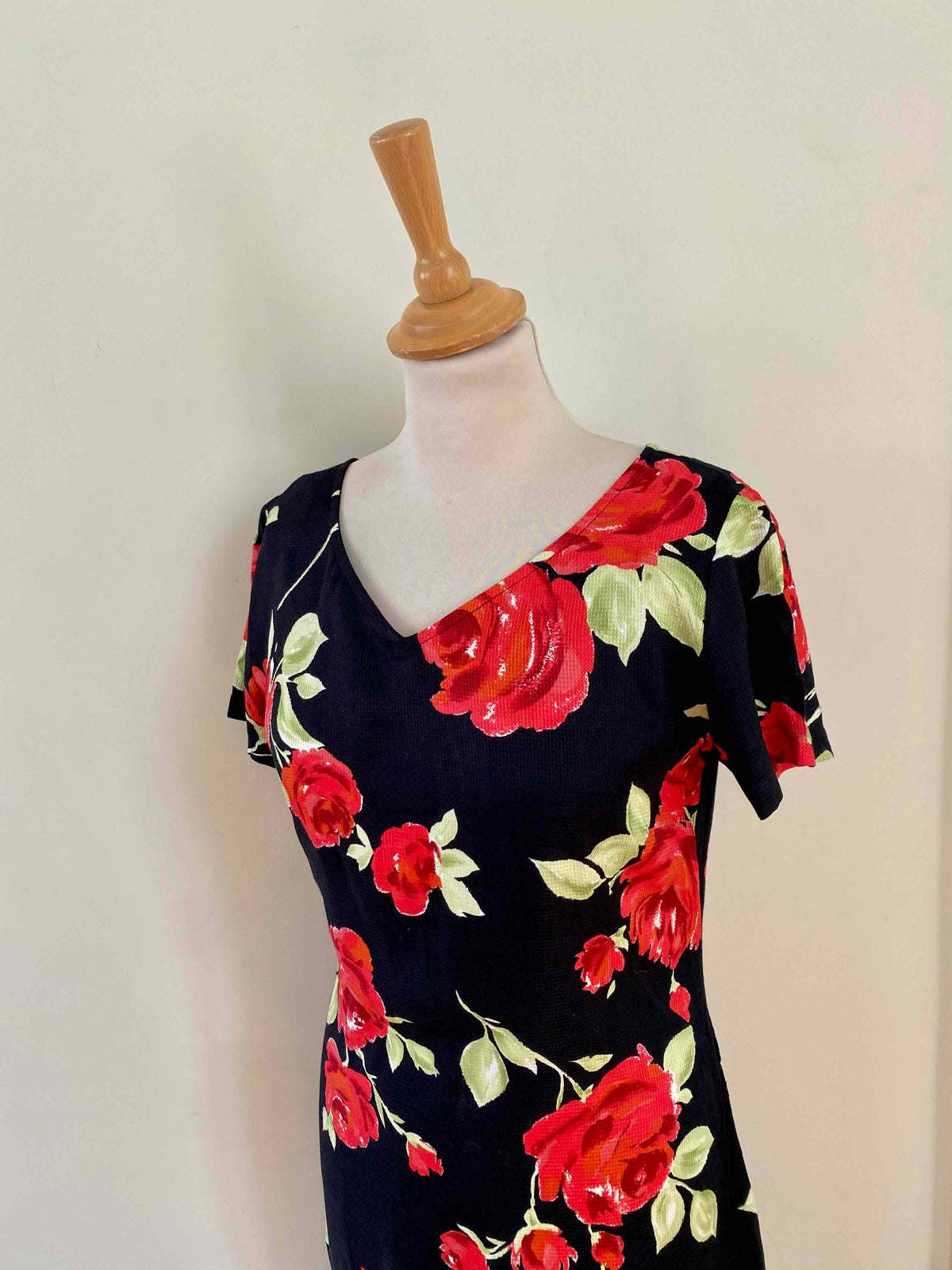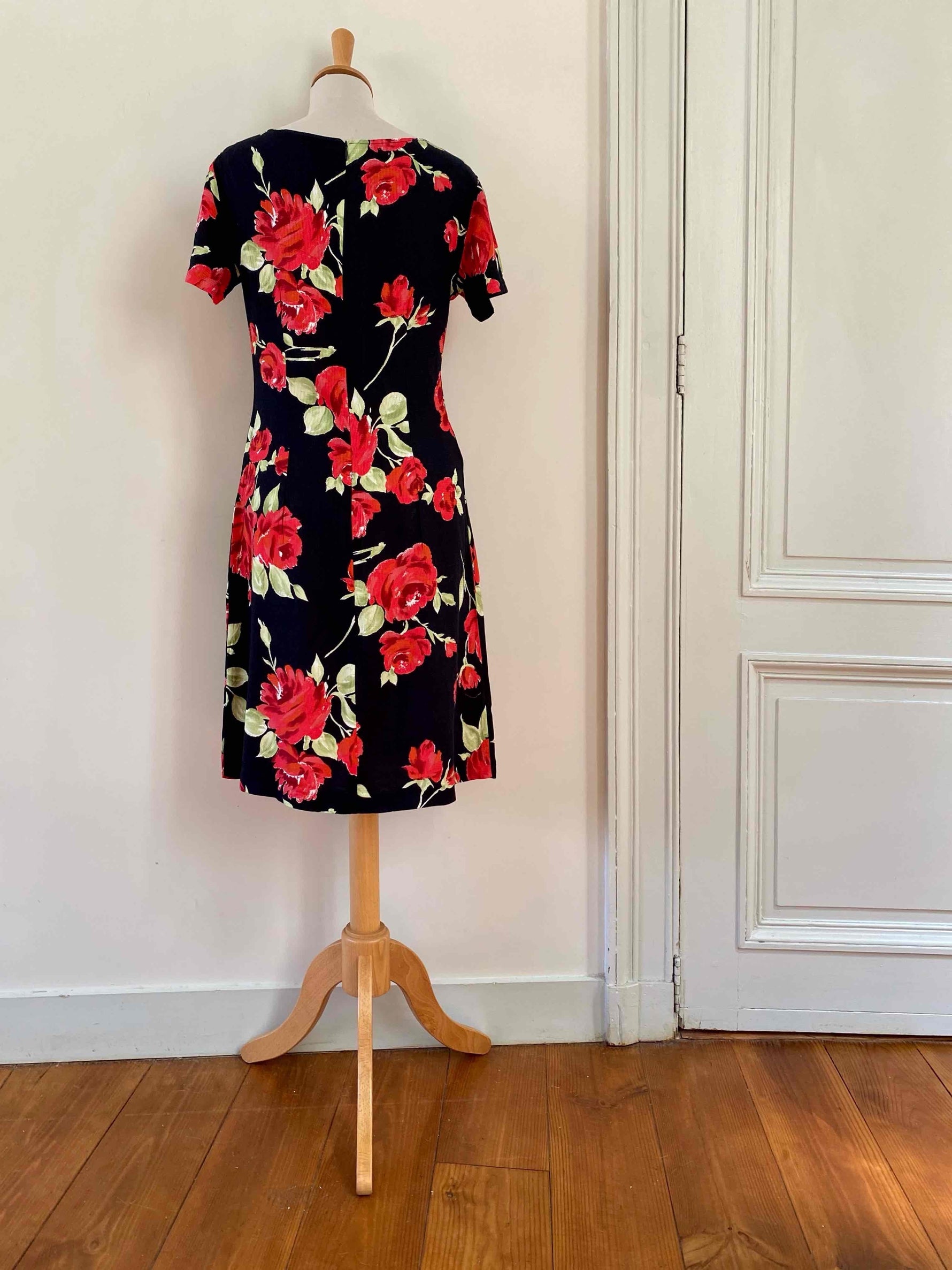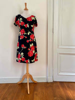 Mini robe Laura Ashley, en viscose fluide piqué effet gaufré, noire imprimée grandes roses rouges et vertes, manches courtes, col V, taille ceintrée, fabriquée en Angleterre, taille 36 portée ici sur un mannequin T36, aisselles 44cm.