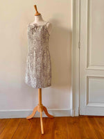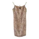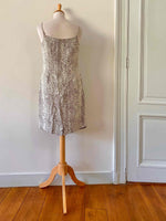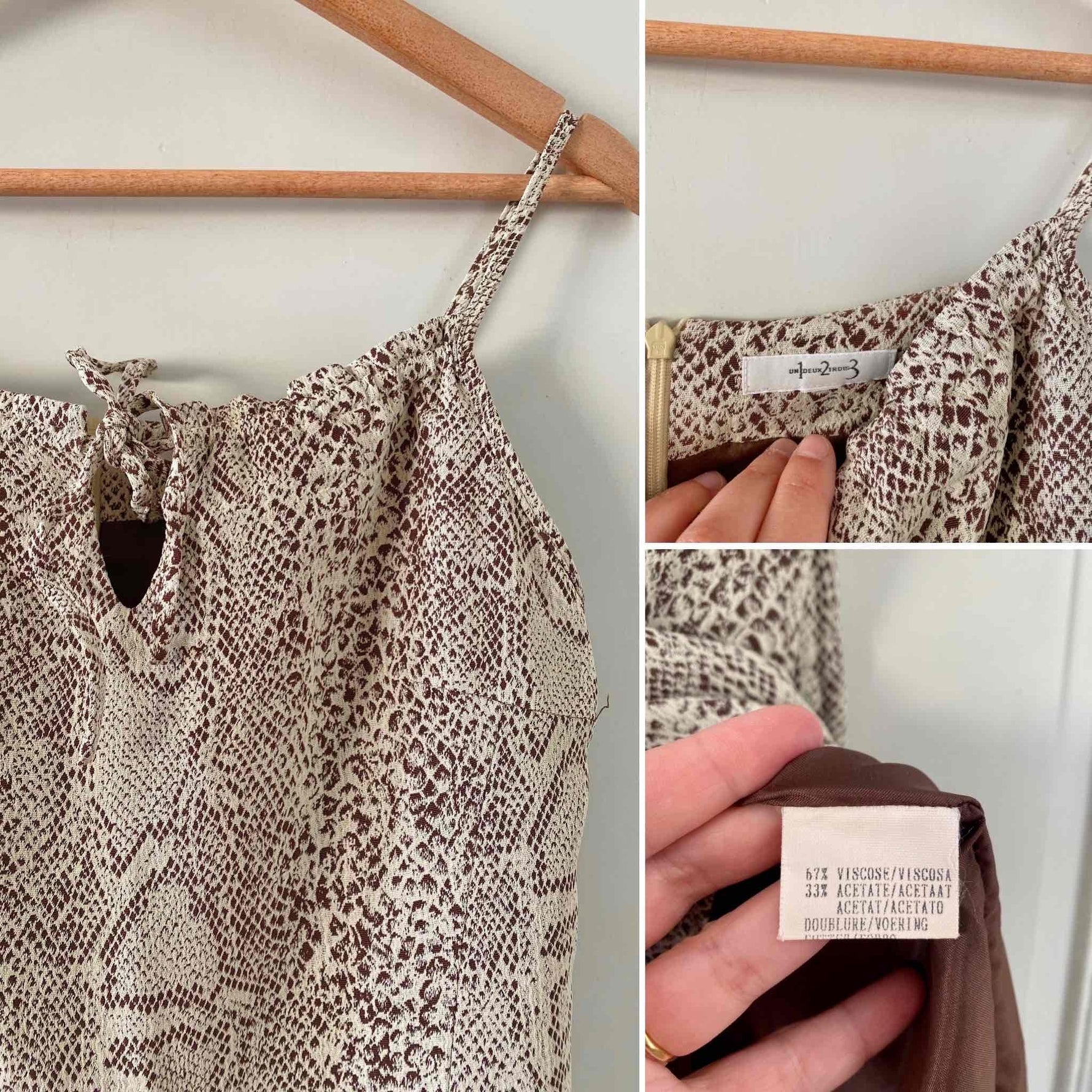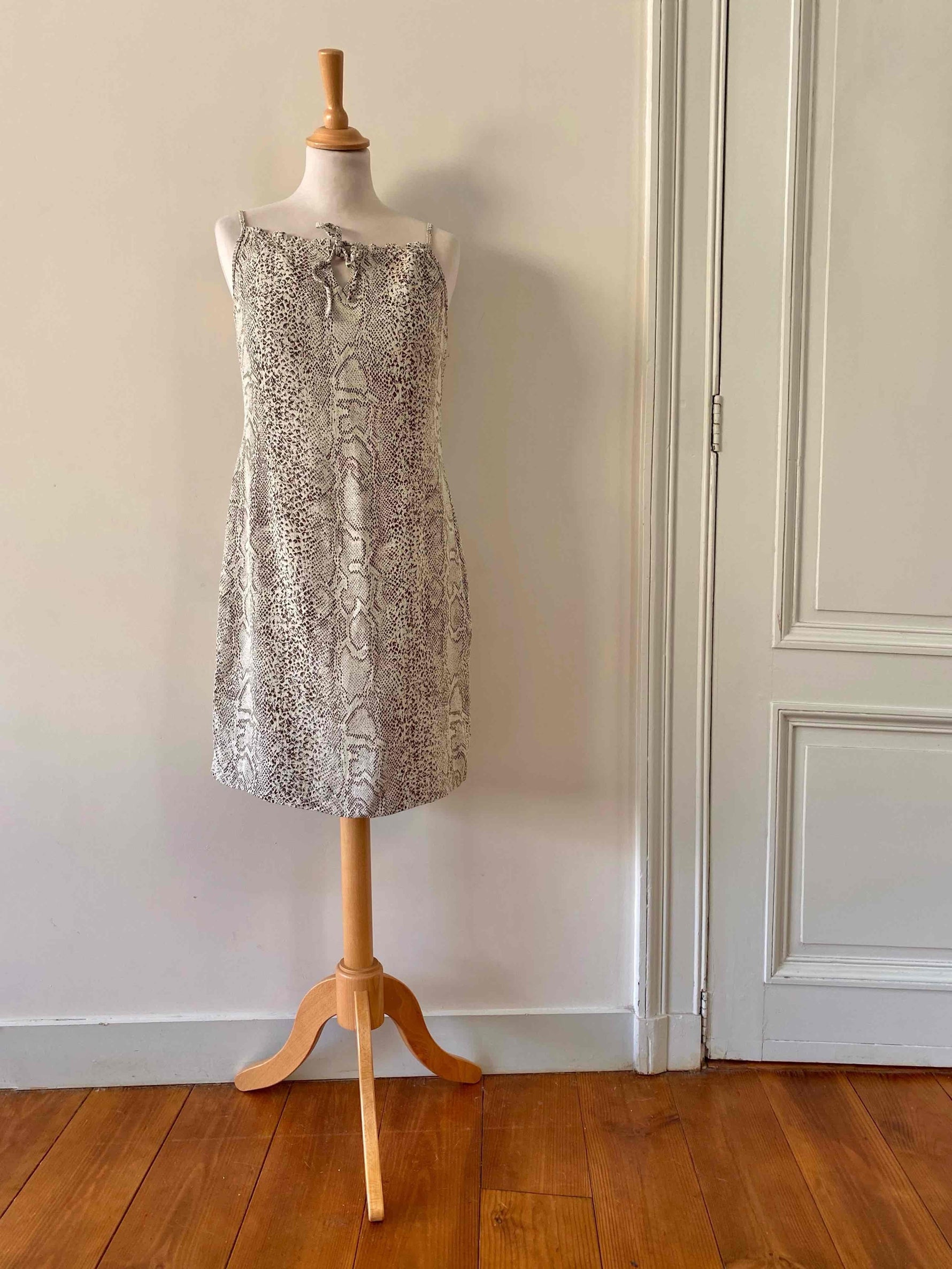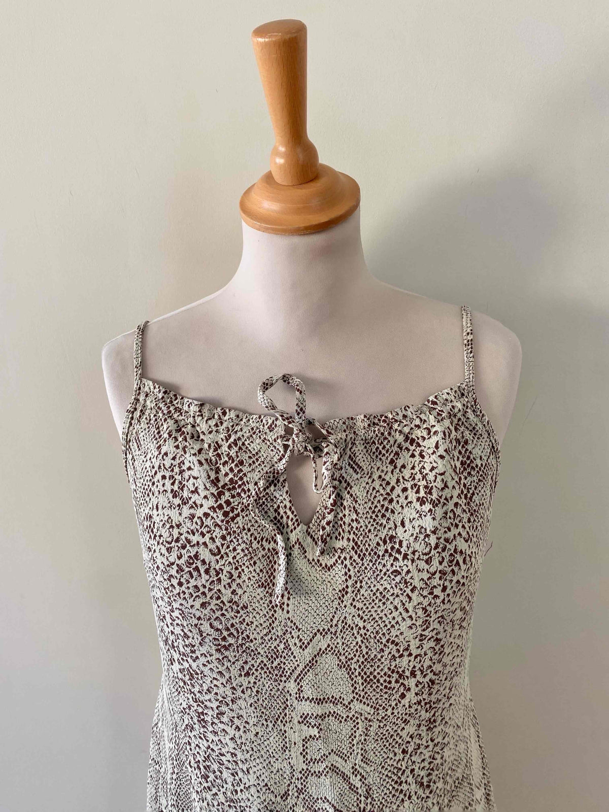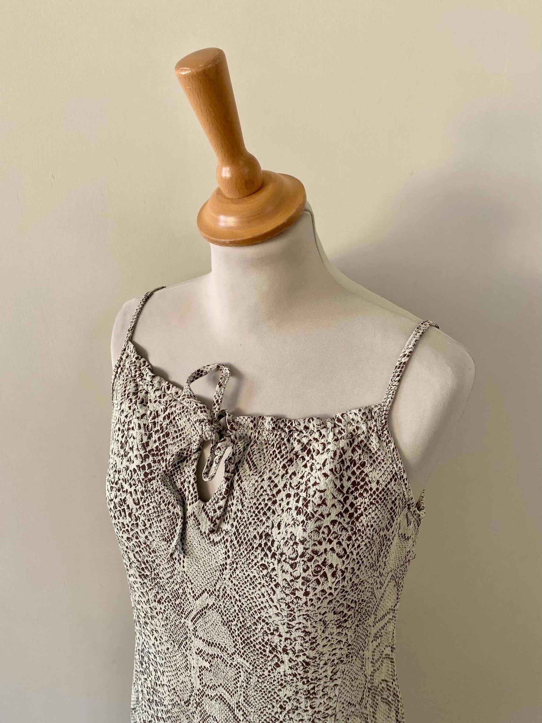 Mini robe wild en jacquard fluide viscose beige et chocolat imprimée reptile, bretelles spaghettis, poitrine froncée à nouer, fabriquée en France, taille 36 portée ici sur un mannequin T36, aisselles 44cm.