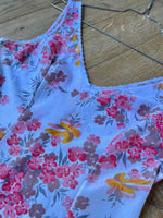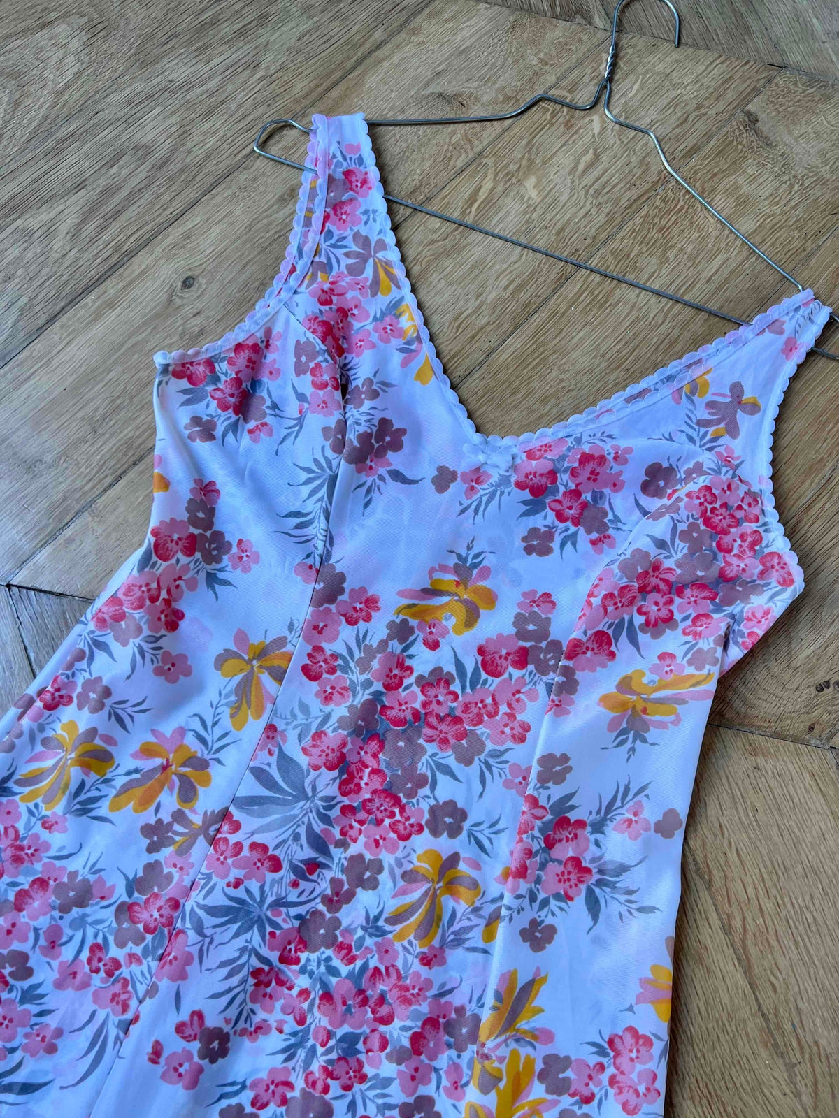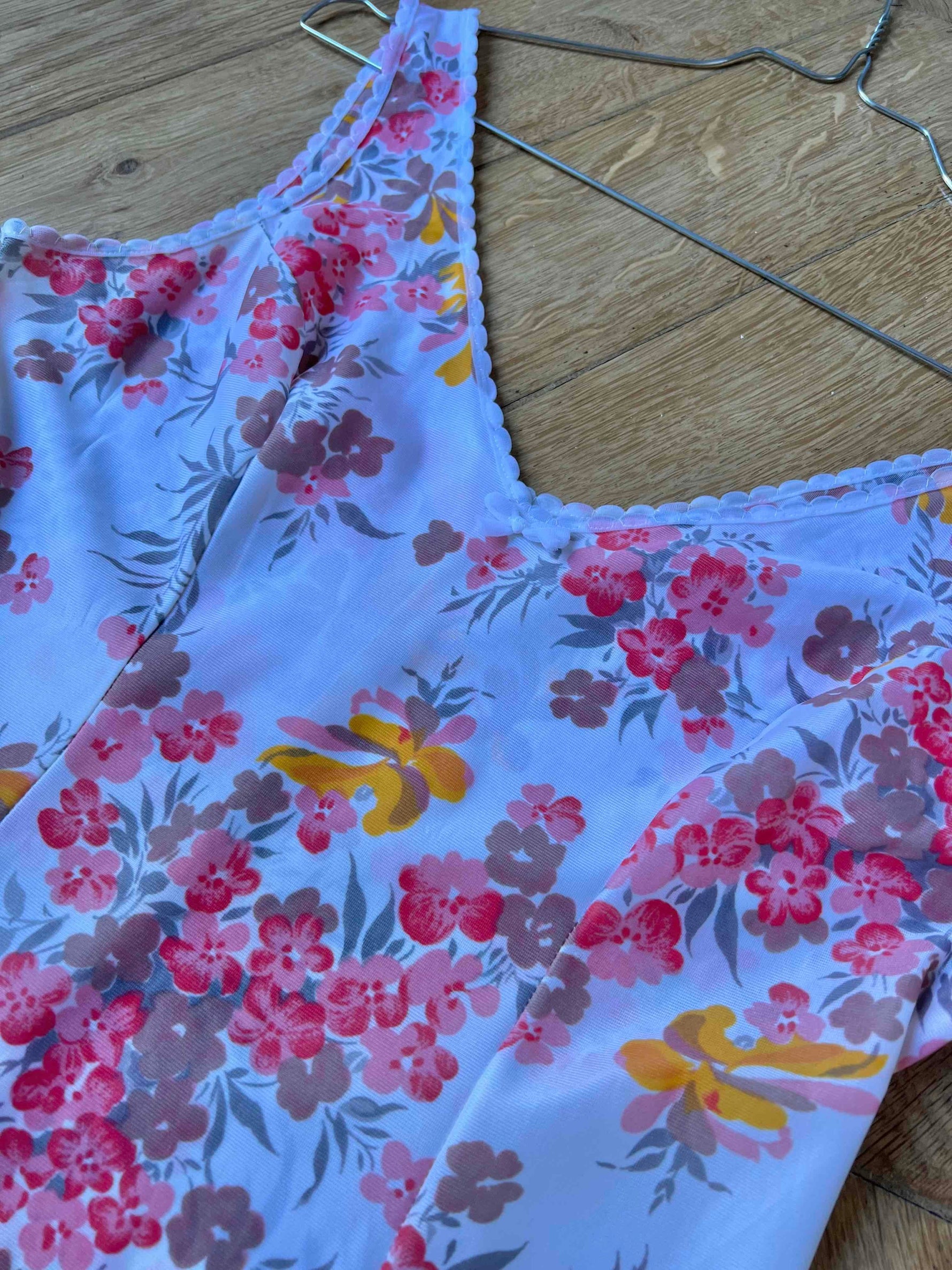 Prix unitaire parNuisette à fleurs, légère en matière synthétique blanche à fleurs roses, oranges et gris clair. Années 70's, décolleté avec des détails arrondis. Nœud. Taille 36/38.