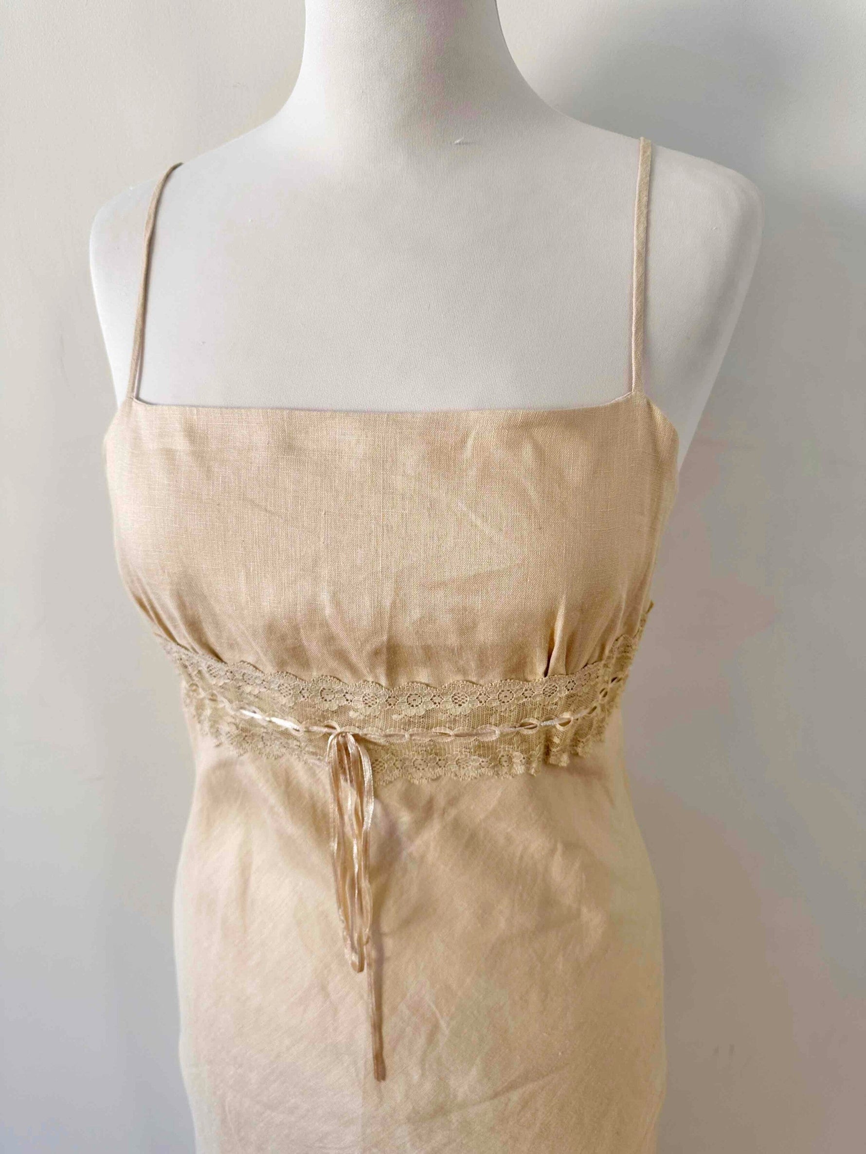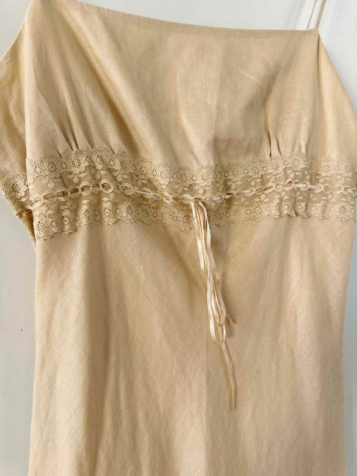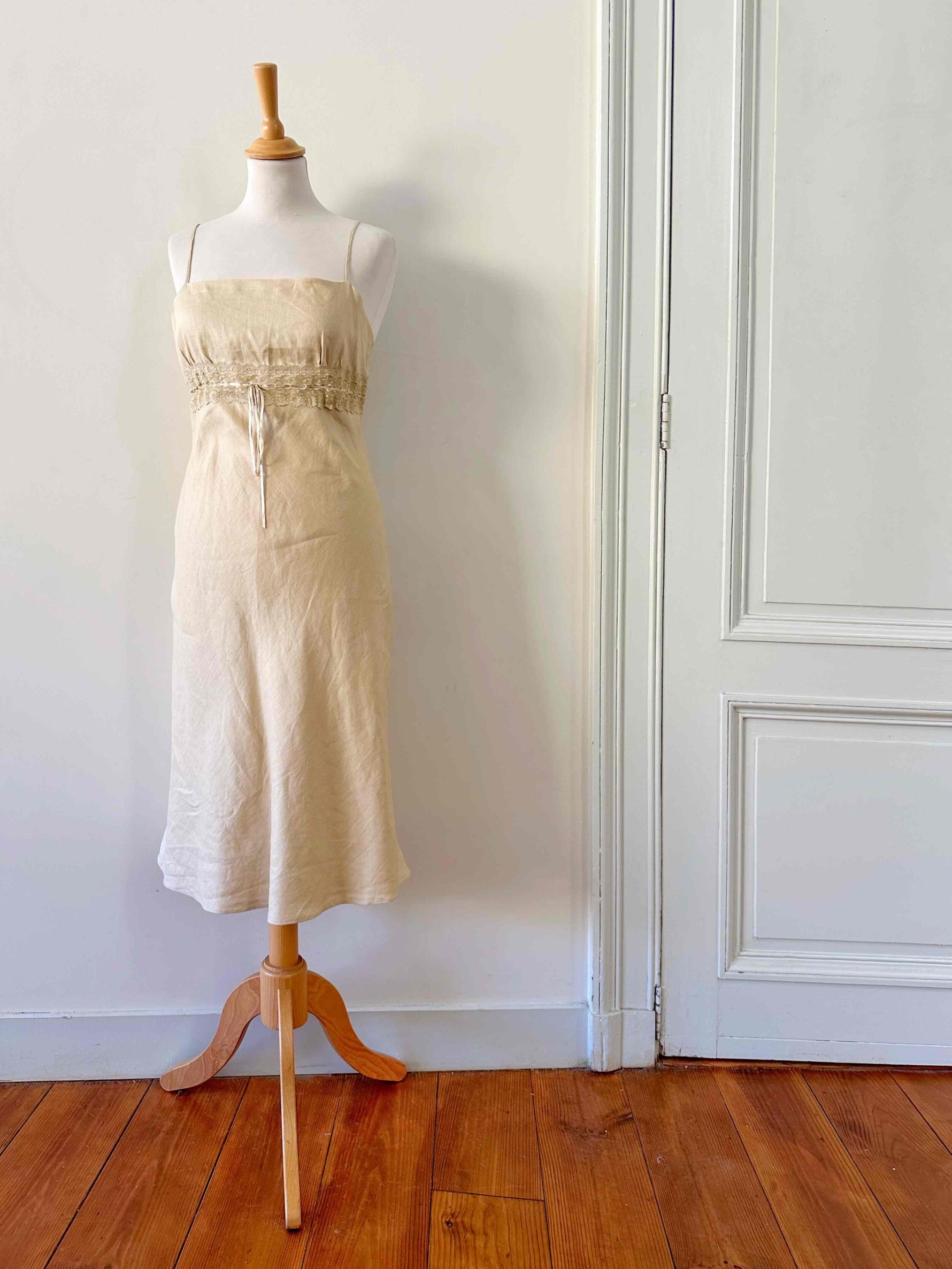 Robe nuisette en lin beige sable, bretelles spaghettis, poitrine brodé de dentelle, à froncer et à nouer par un ruban en satin, taillée en biais, fabriquée en France, taille 36 portée ici sur un mannequin T36, aisselles 44cm.