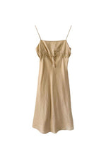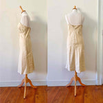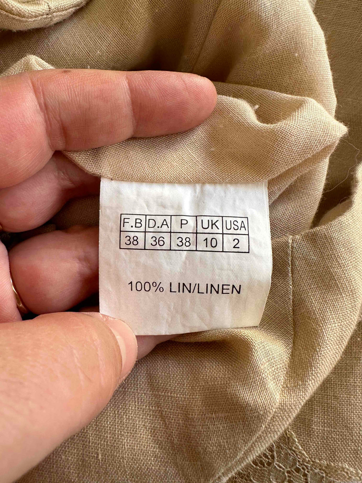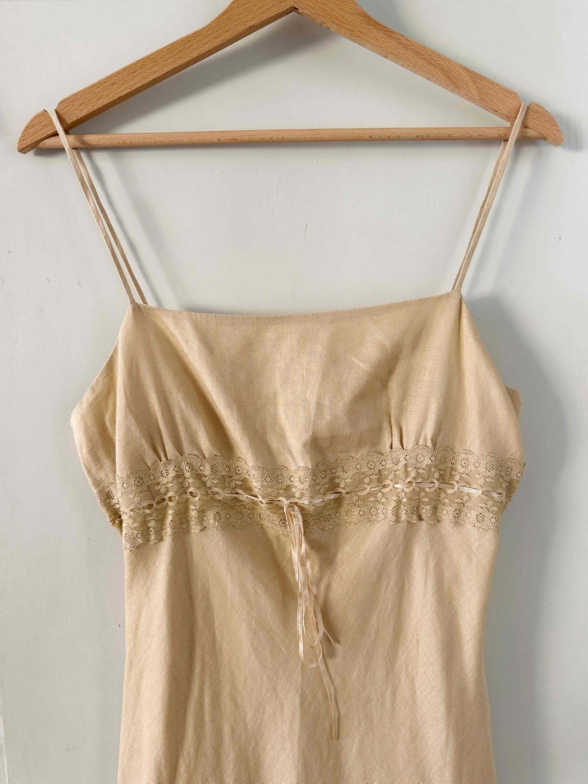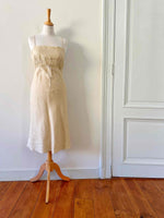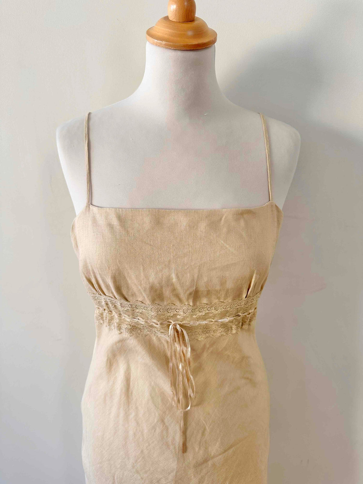 Robe nuisette en lin beige sable, bretelles spaghettis, poitrine brodé de dentelle, à froncer et à nouer par un ruban en satin, taillée en biais, fabriquée en France, taille 36 portée ici sur un mannequin T36, aisselles 44cm.