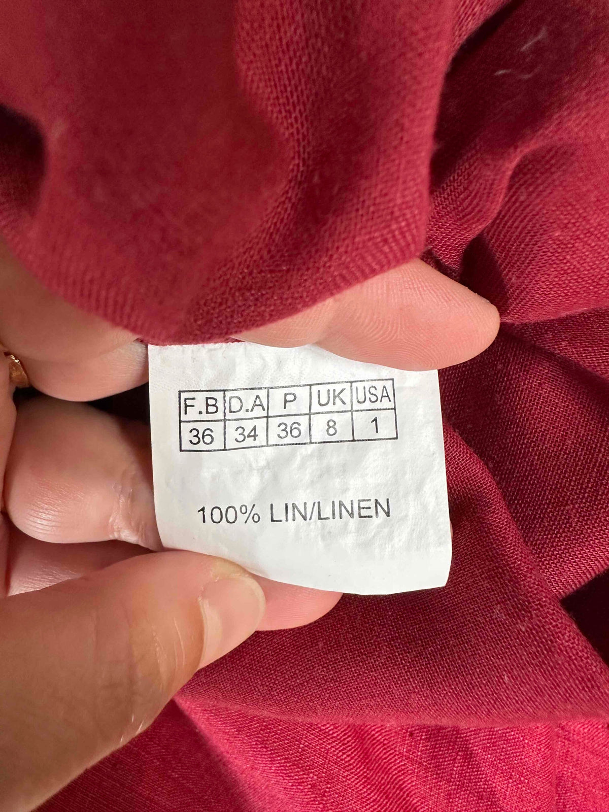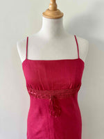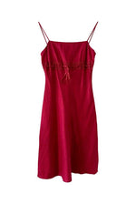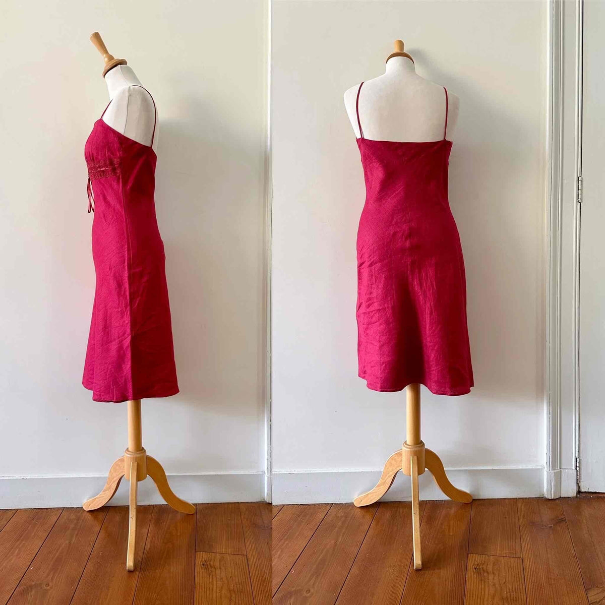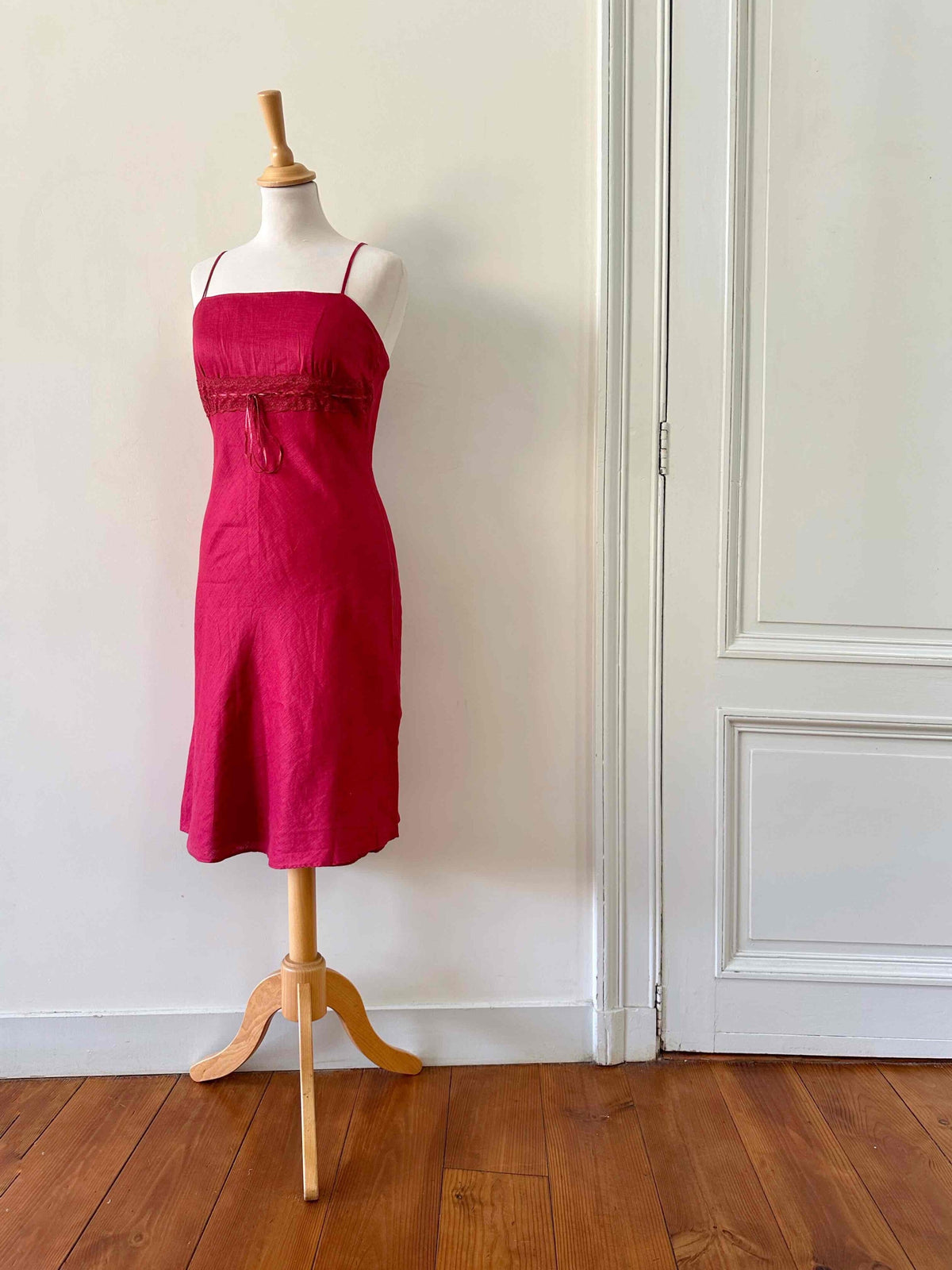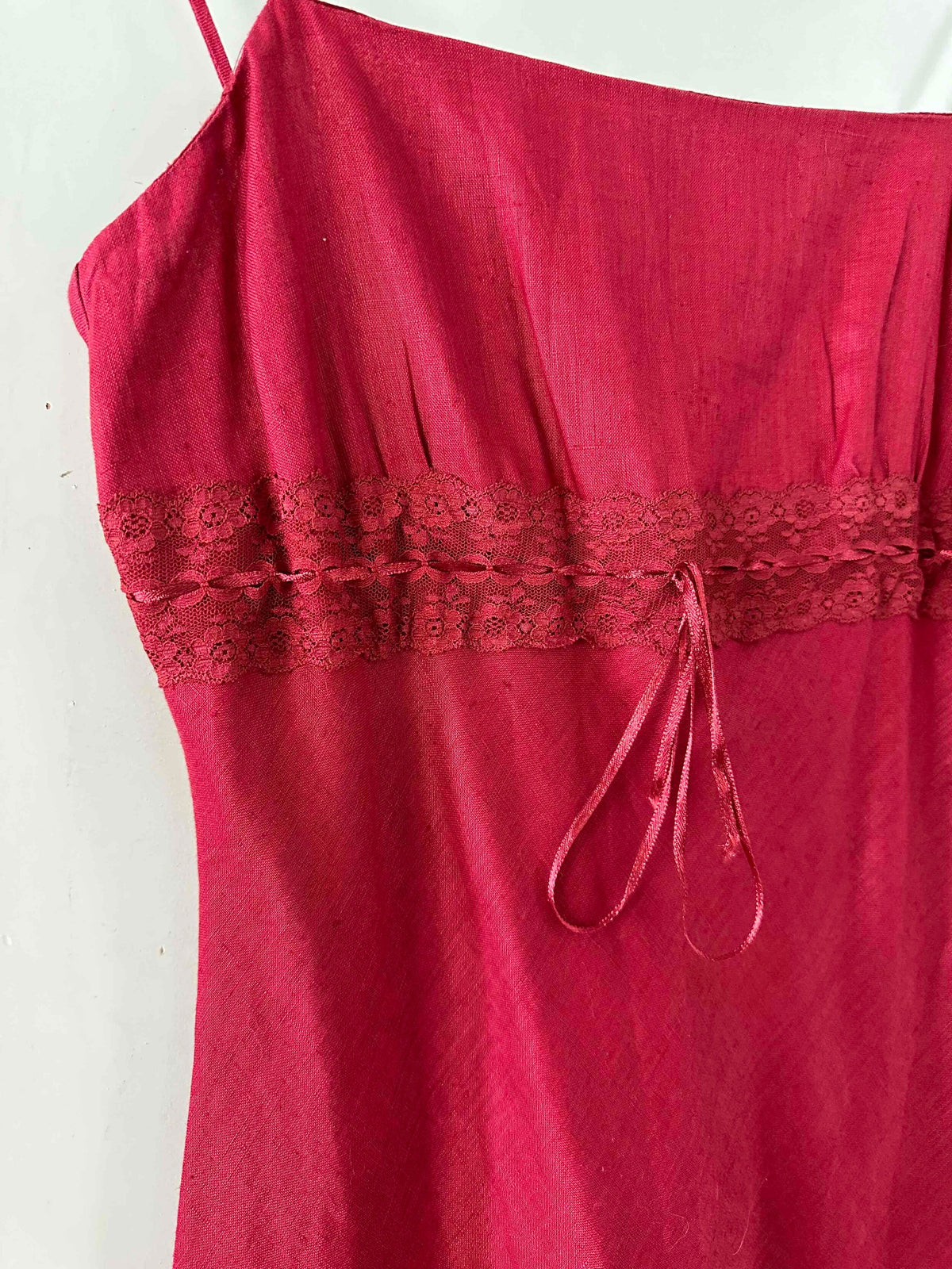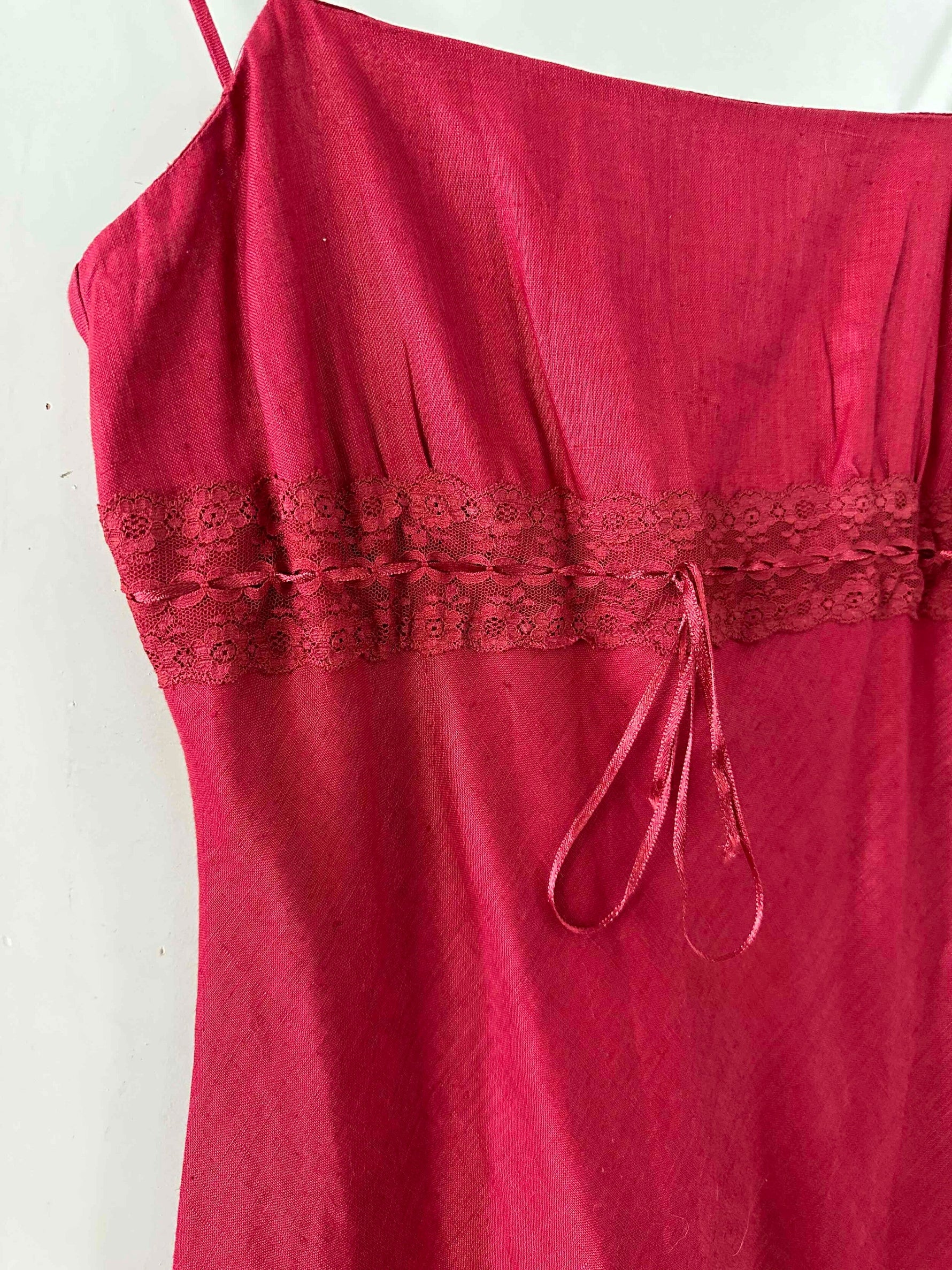 Prix unitaire parRobe nuisette en lin rouge cerise, bretelles spaghettis, poitrine brodé de dentelle, à froncer et à nouer par un ruban en satin, taillée en biais, fabriquée en France, taille 36 portée ici sur un mannequin T36, aisselles 43cm.