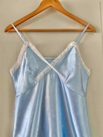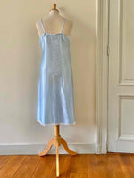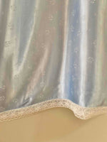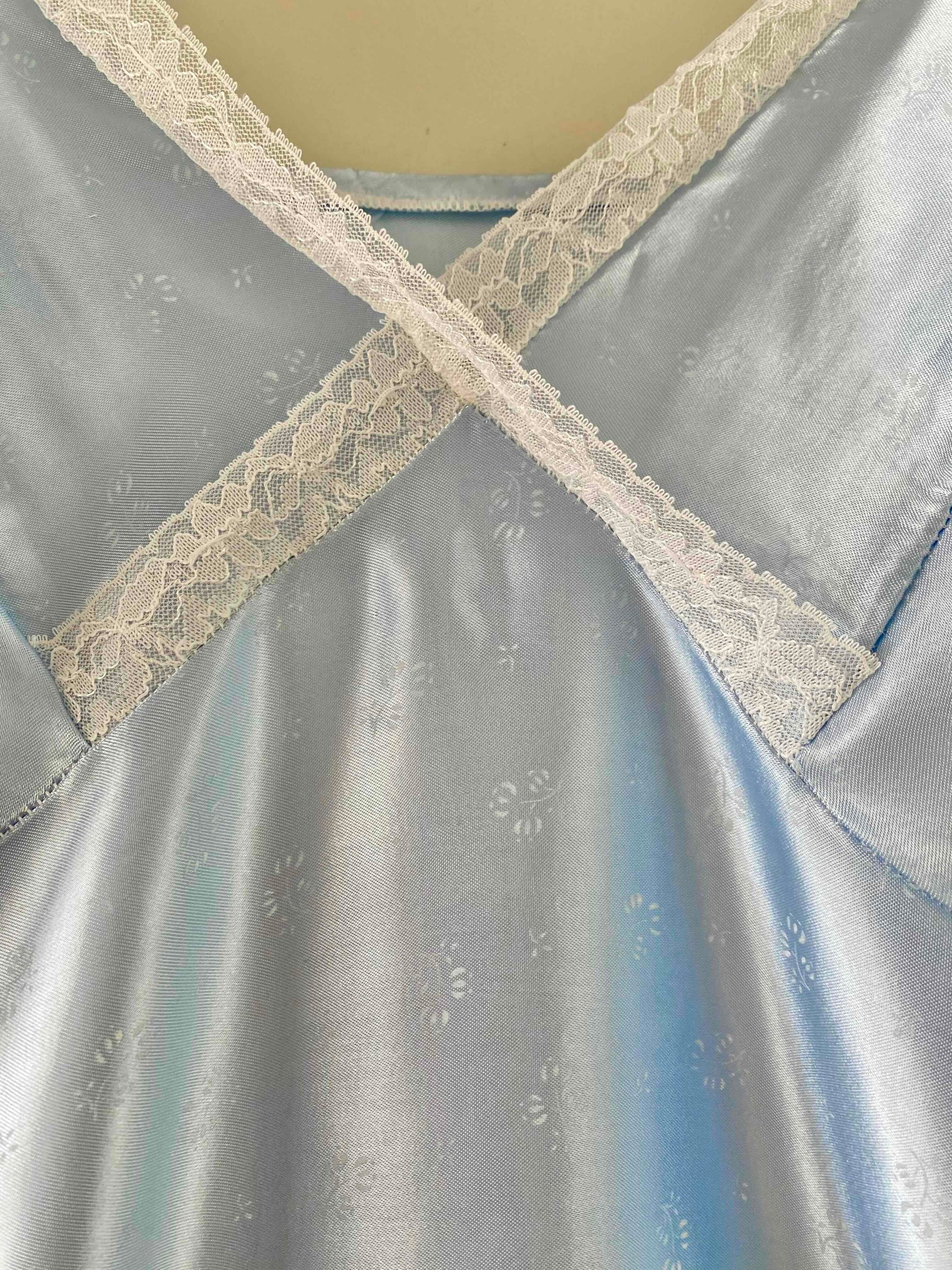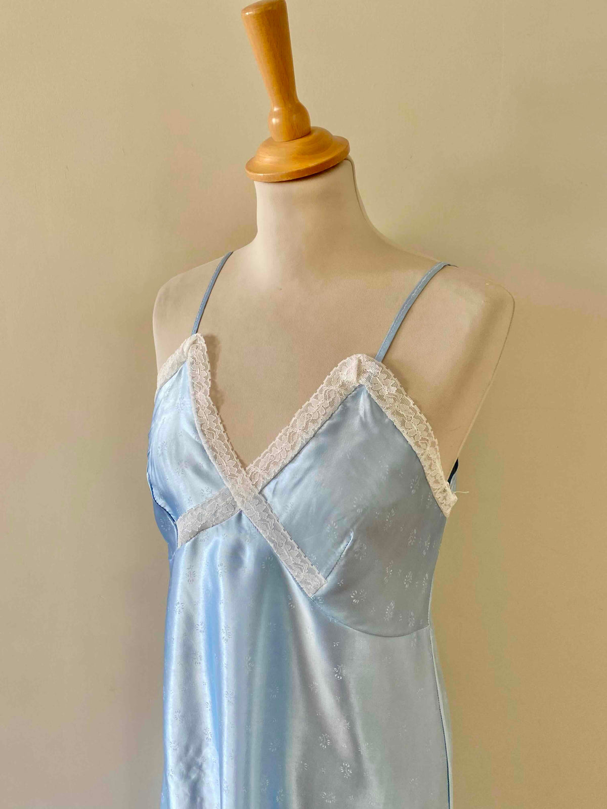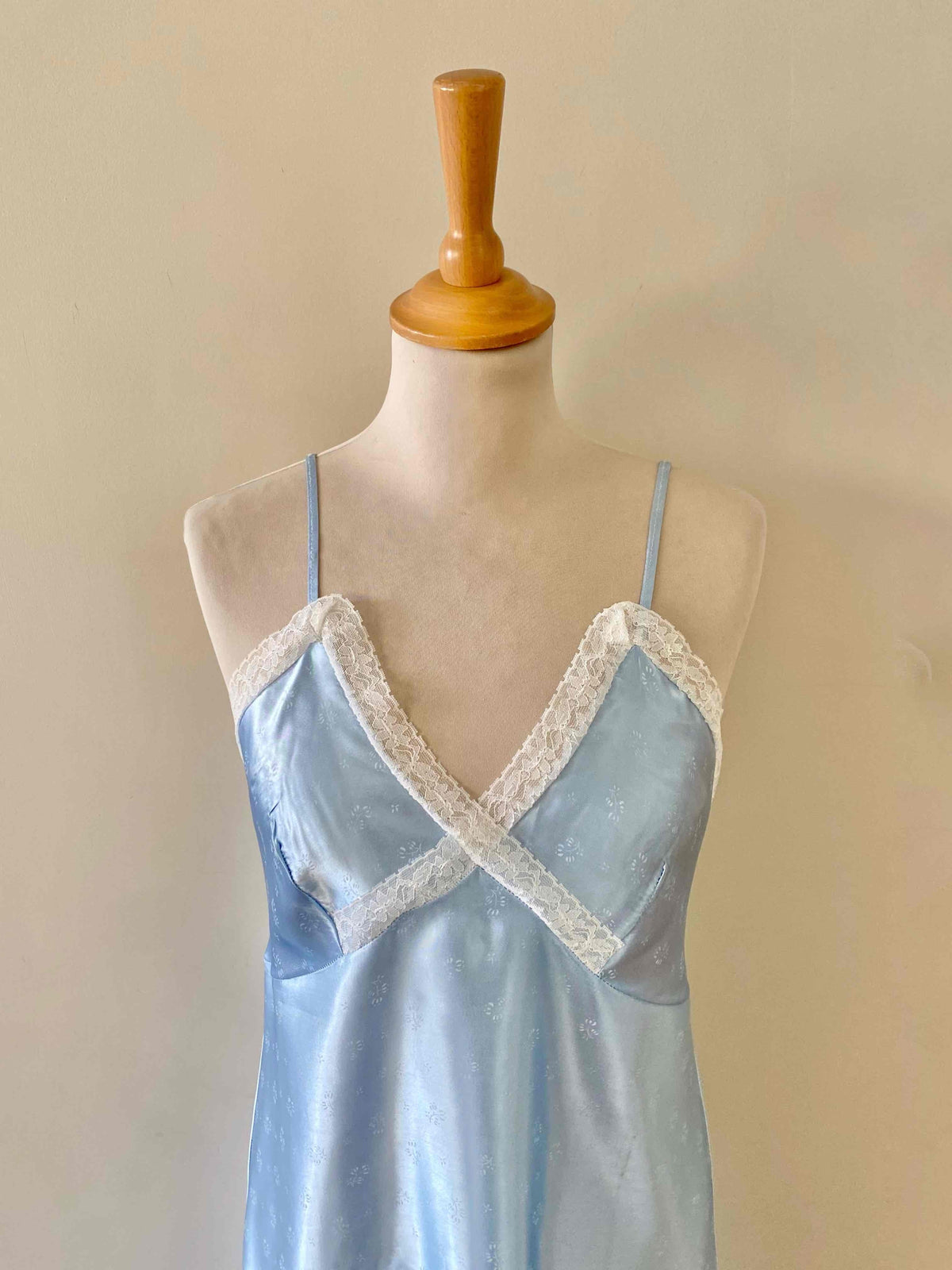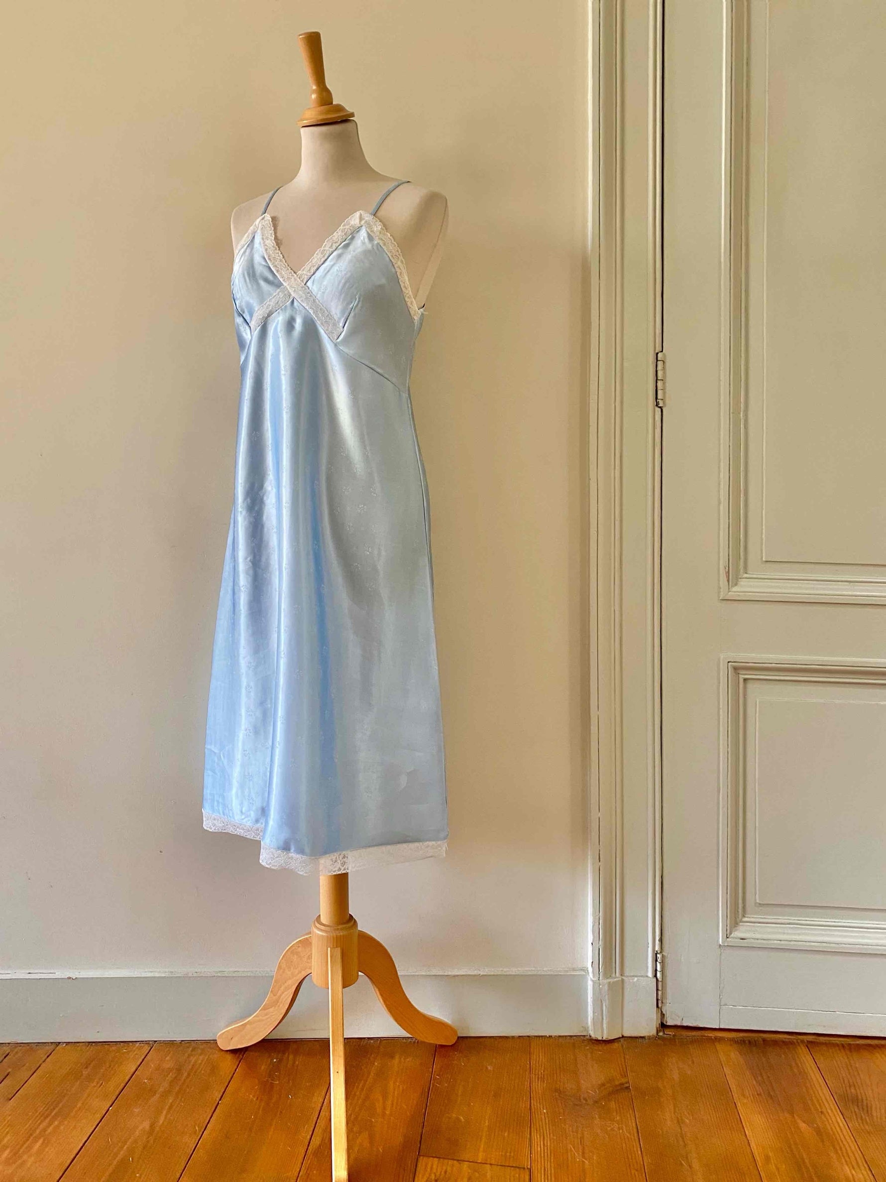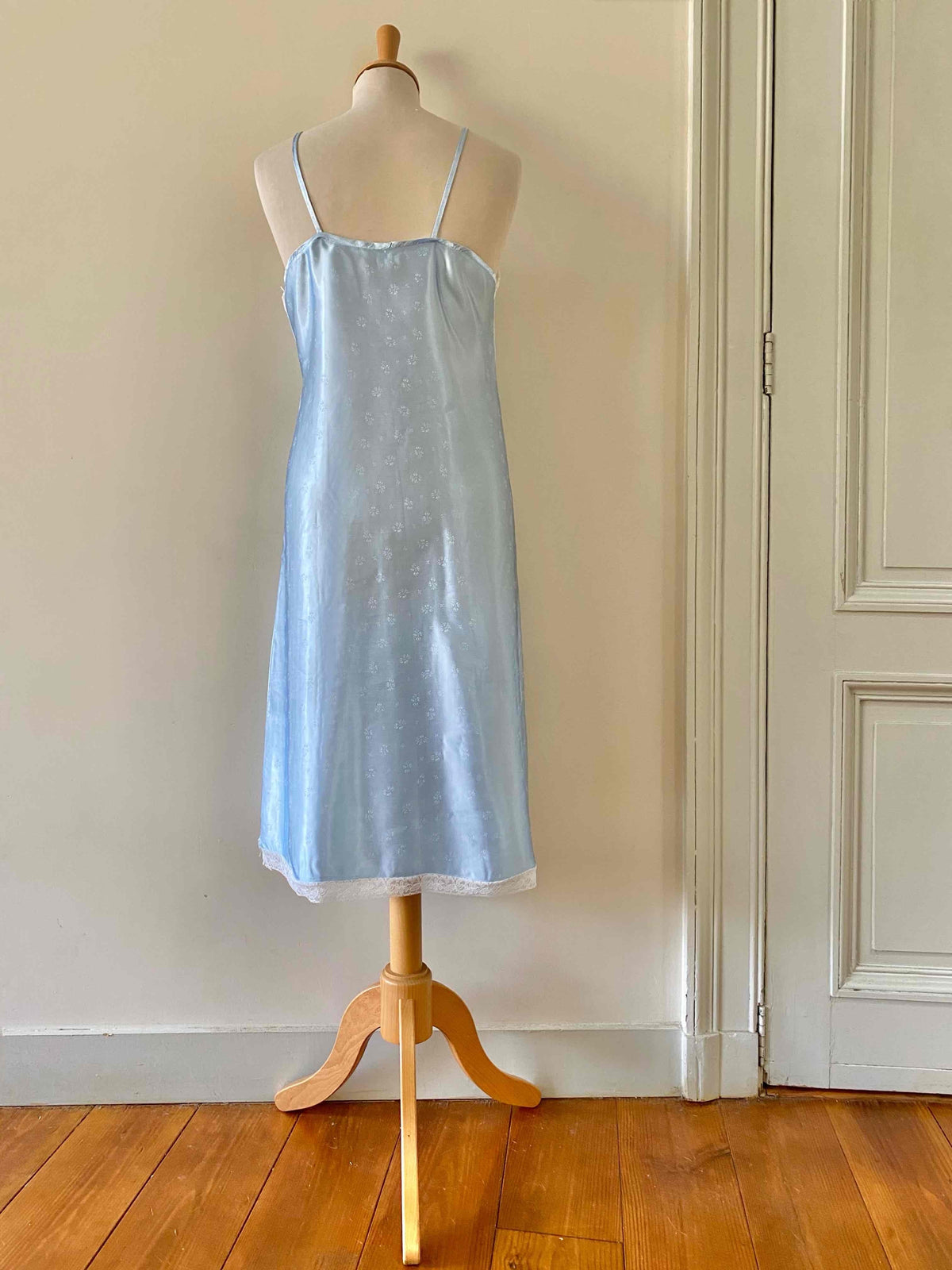 Prix unitaire parNuisette en satin fleurie, satin viscose aux finitions soie, bleue ciel imprimée petites fleurs ton sur ton, poitrine et bas brodés de dentelle blanche, bretelles spaghettis, forme fit and flare, fabriquée en Italie, années 80’s, taille 36 portée ici sur un mannequin T36.